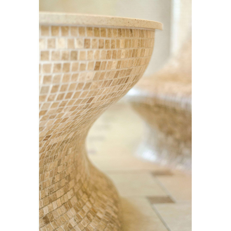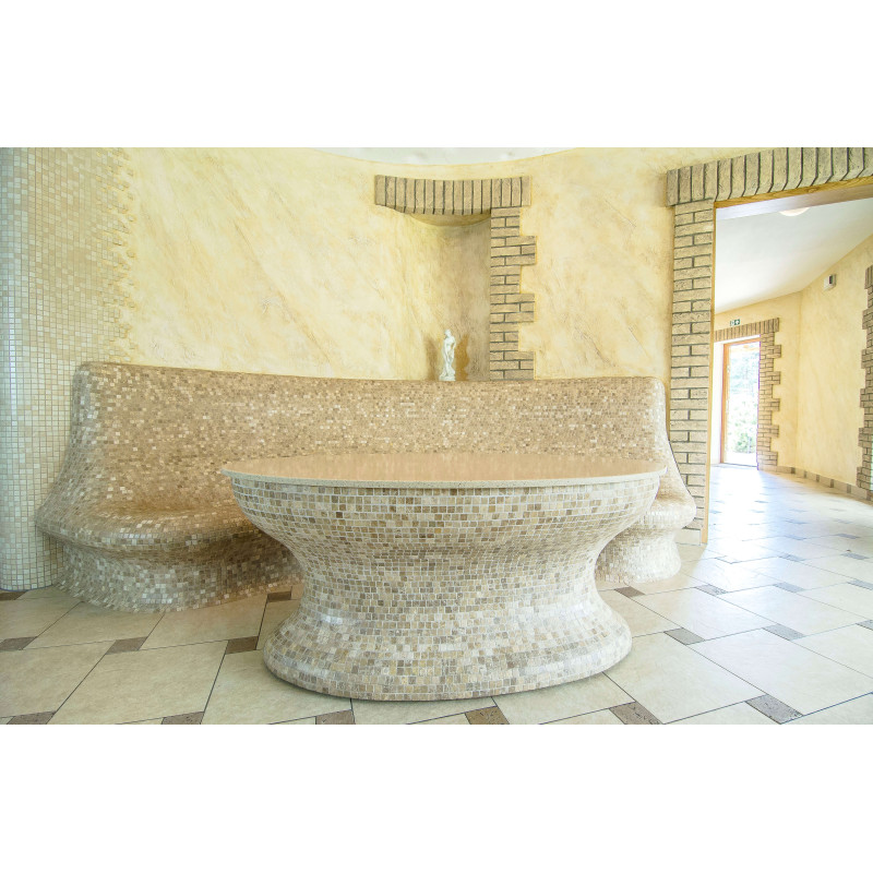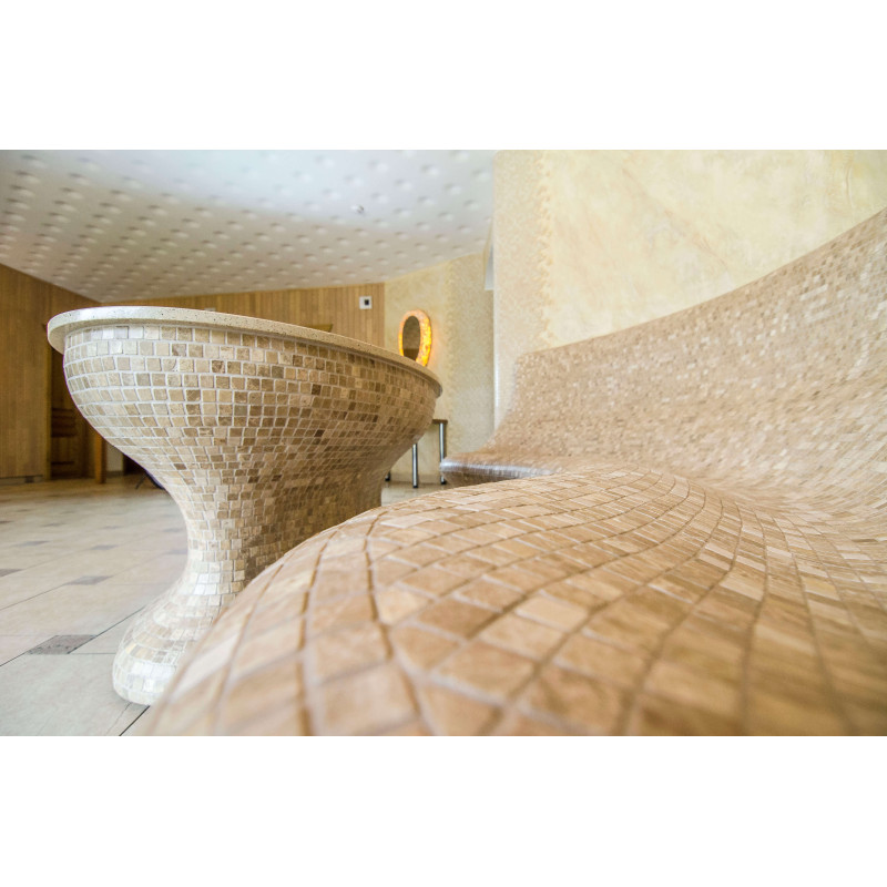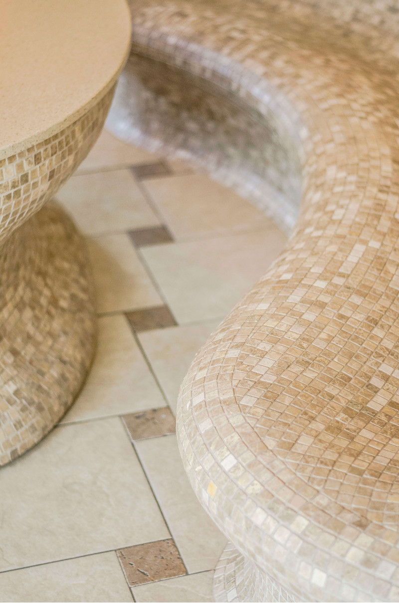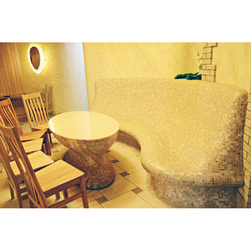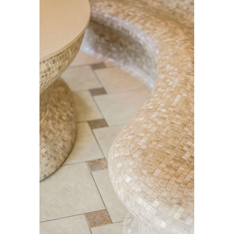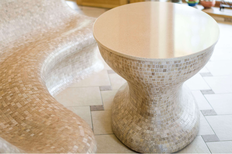 Beheizte Bank- und Tischformen werden individuell aus speziellem extrudiertem Polystyrol gefertigt. Arbeitsplatte - Marmor. Finish - Mosaikfliesen. Die Bank wird über das Heizsystem beheizt.