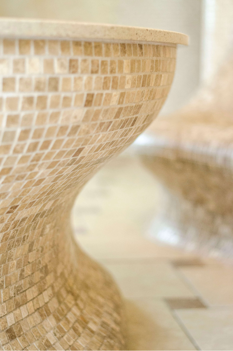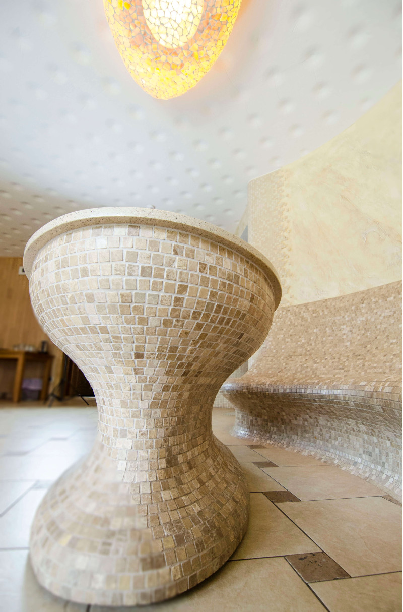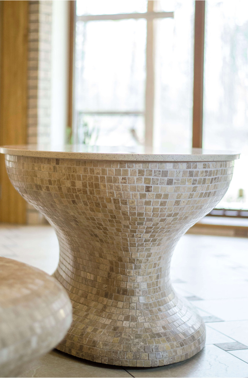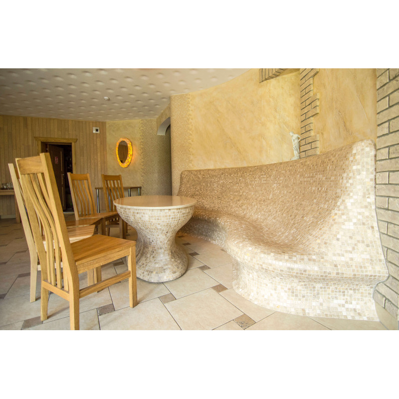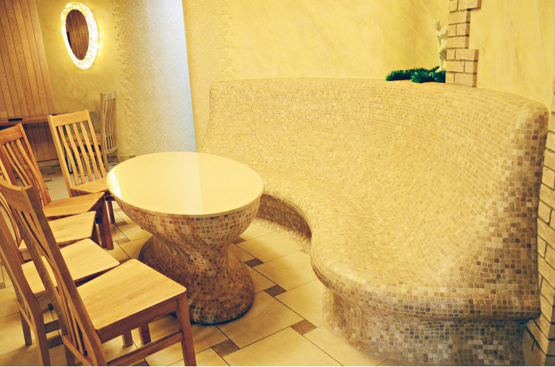 Beheizte Bank- und Tischformen werden individuell aus speziellem extrudiertem Polystyrol gefertigt. Arbeitsplatte - Marmor. Finish - Mosaikfliesen. Die Bank wird über das Heizsystem beheizt.