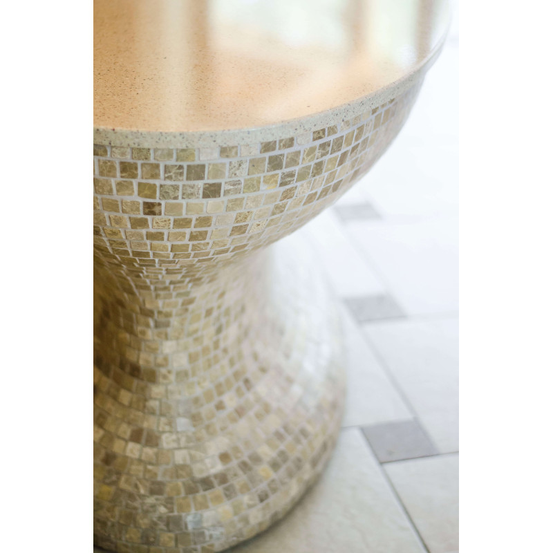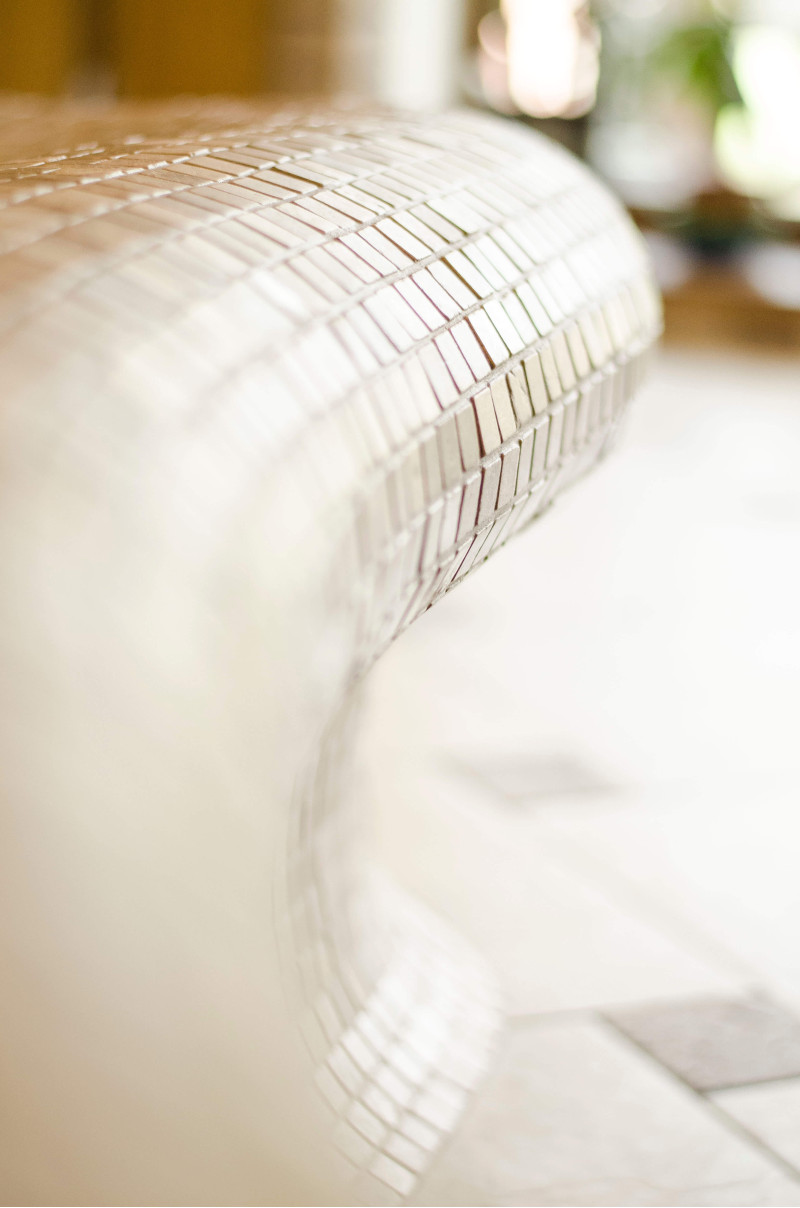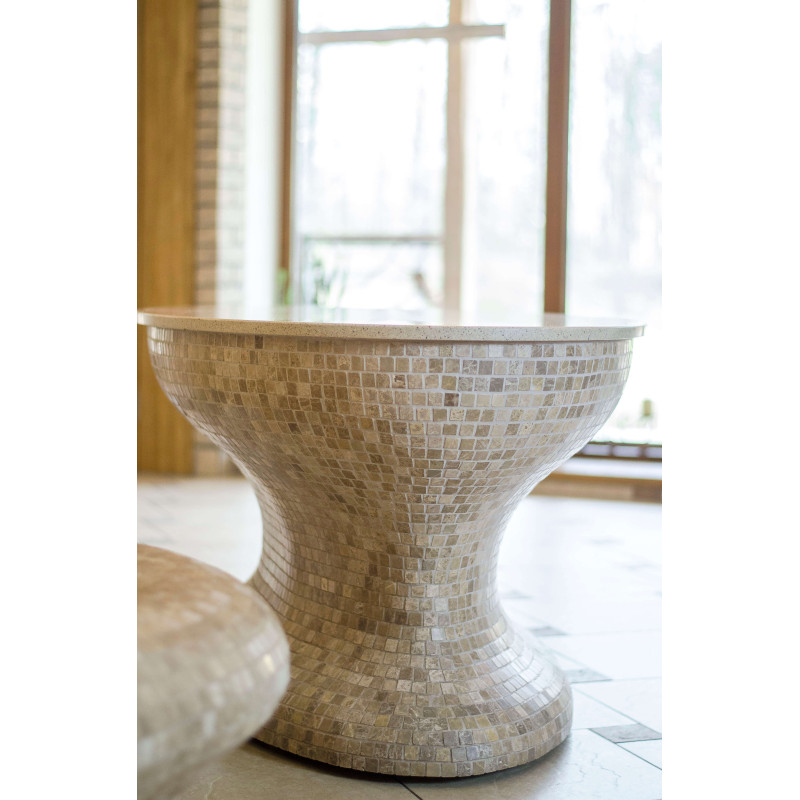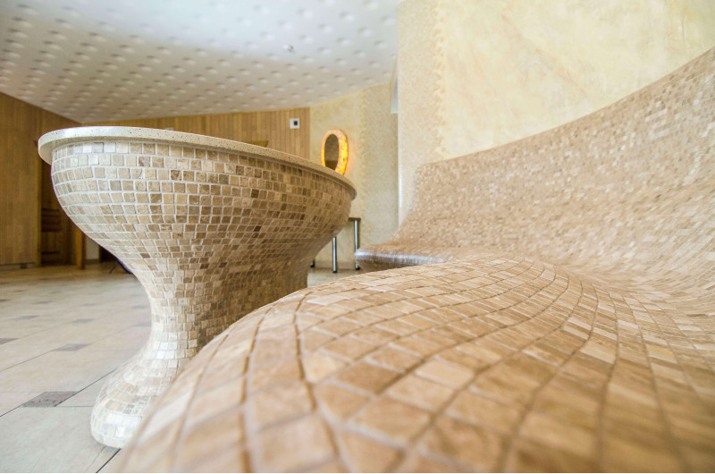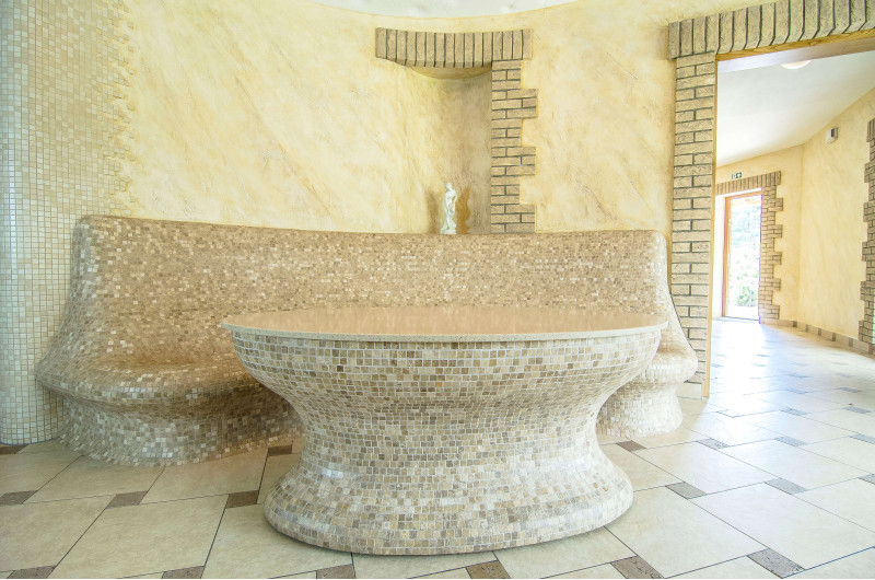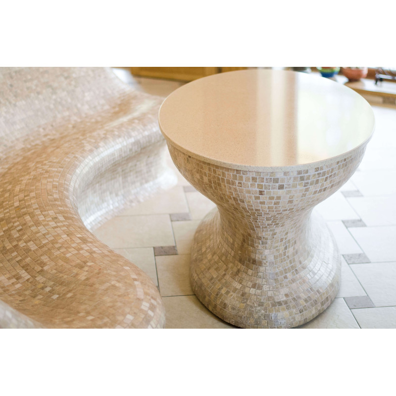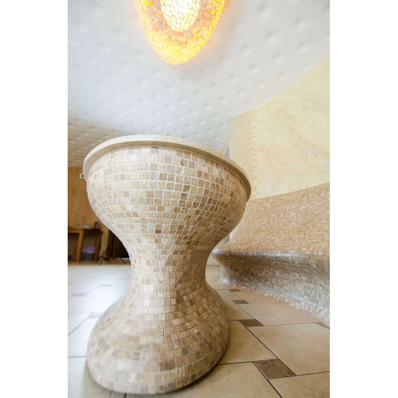 Beheizte Bank- und Tischformen werden individuell aus speziellem extrudiertem Polystyrol gefertigt. Arbeitsplatte - Marmor. Finish - Mosaikfliesen. Die Bank wird über das Heizsystem beheizt.