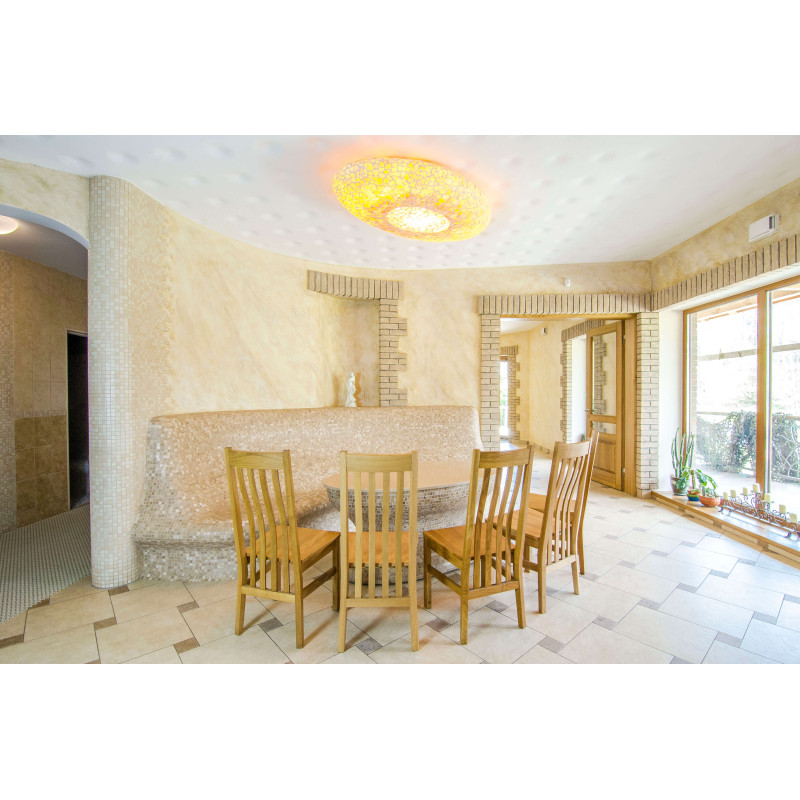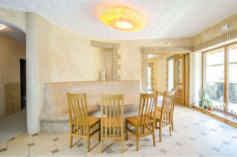 Verfügt über eine helle und luftige Saunabank und einen Tisch.