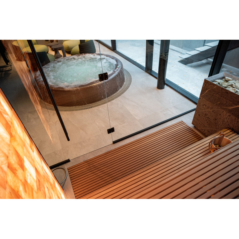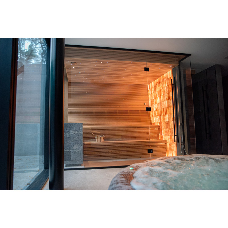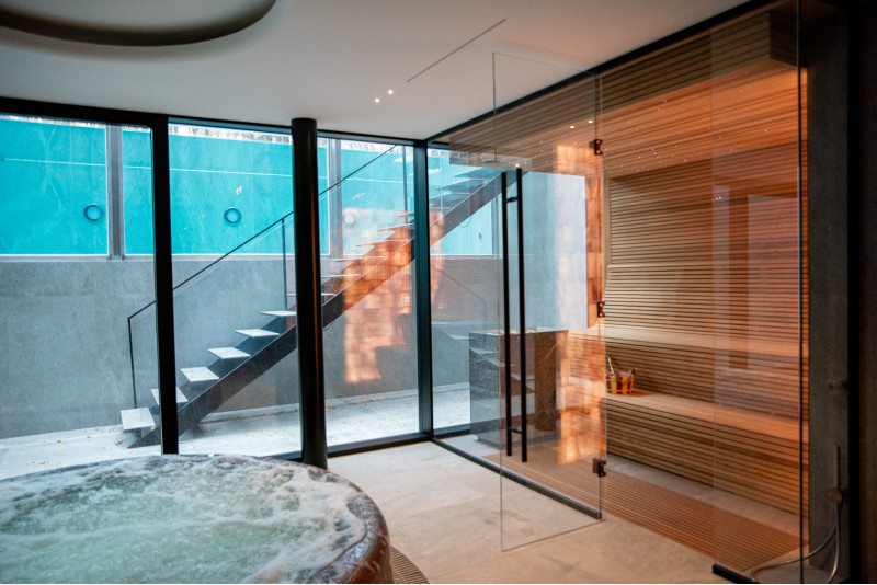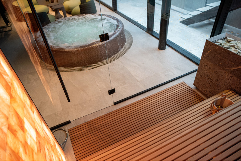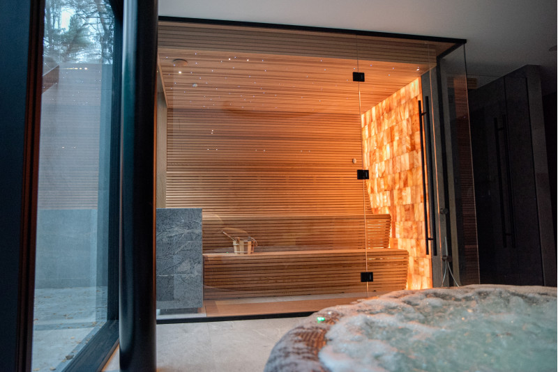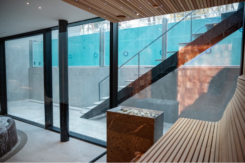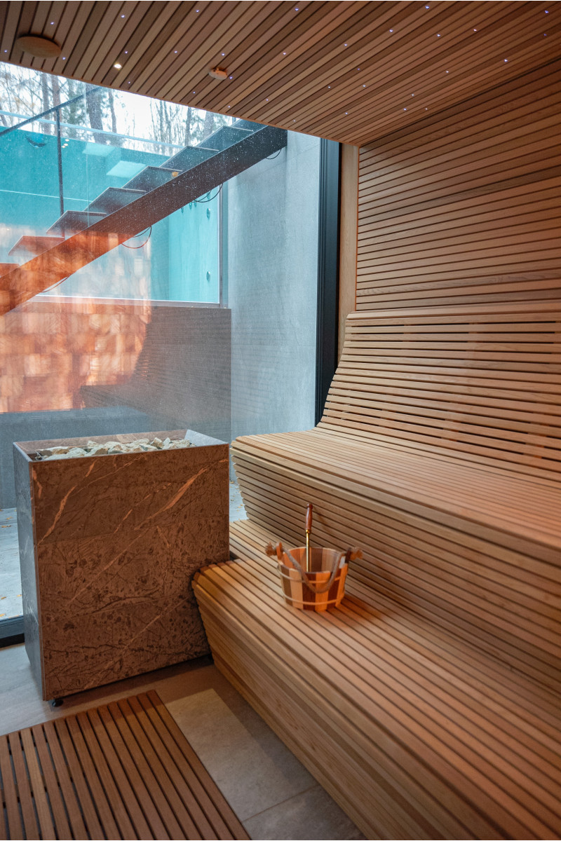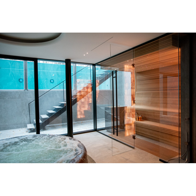 Individuelles Projekt einer Sauna, eines Außenpools, einer Aufgussvorrichtung und eines Whirlpools