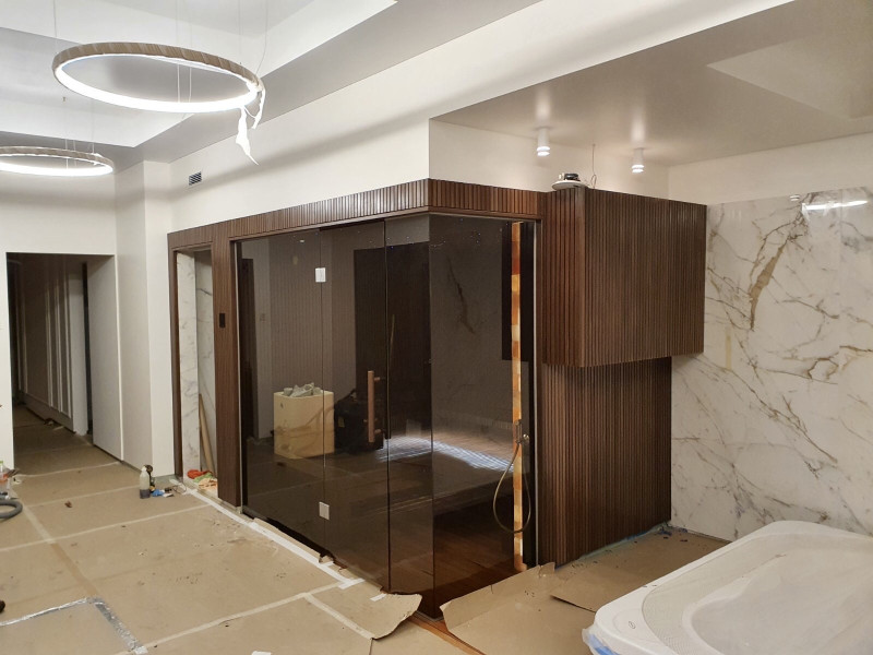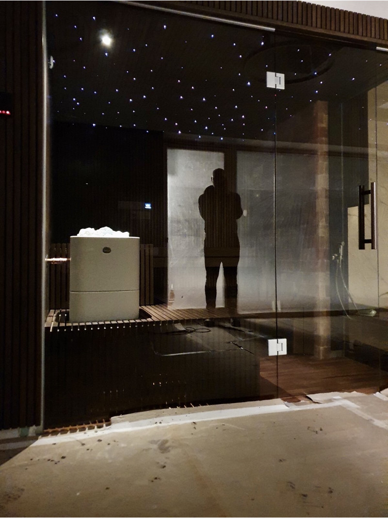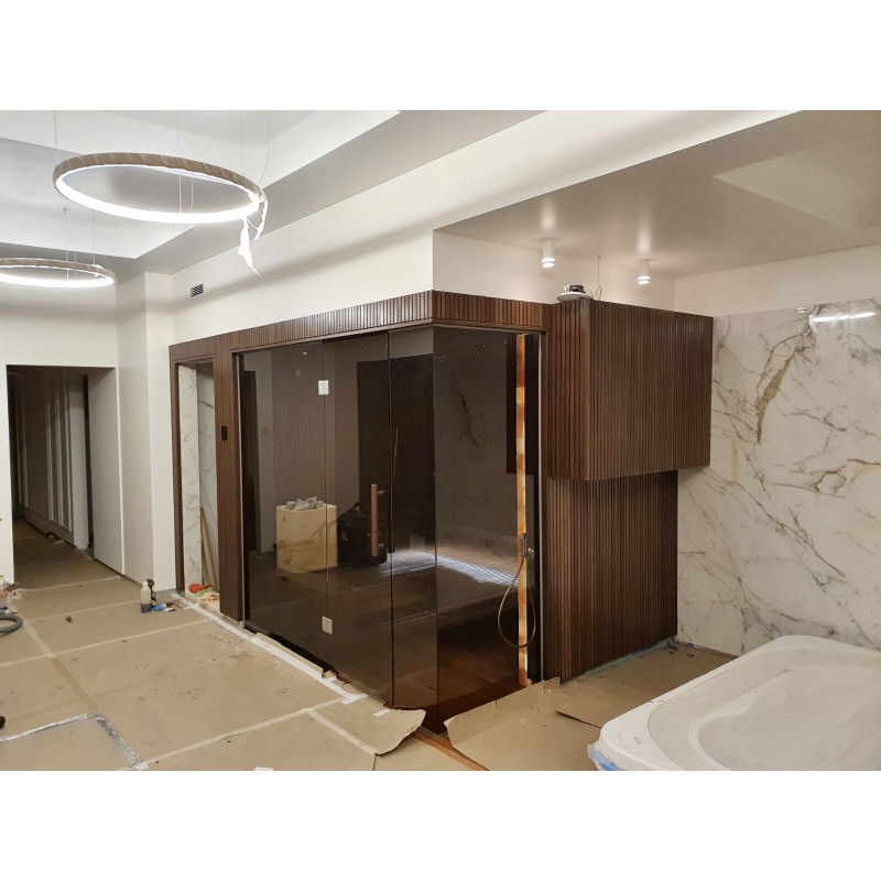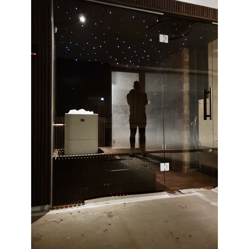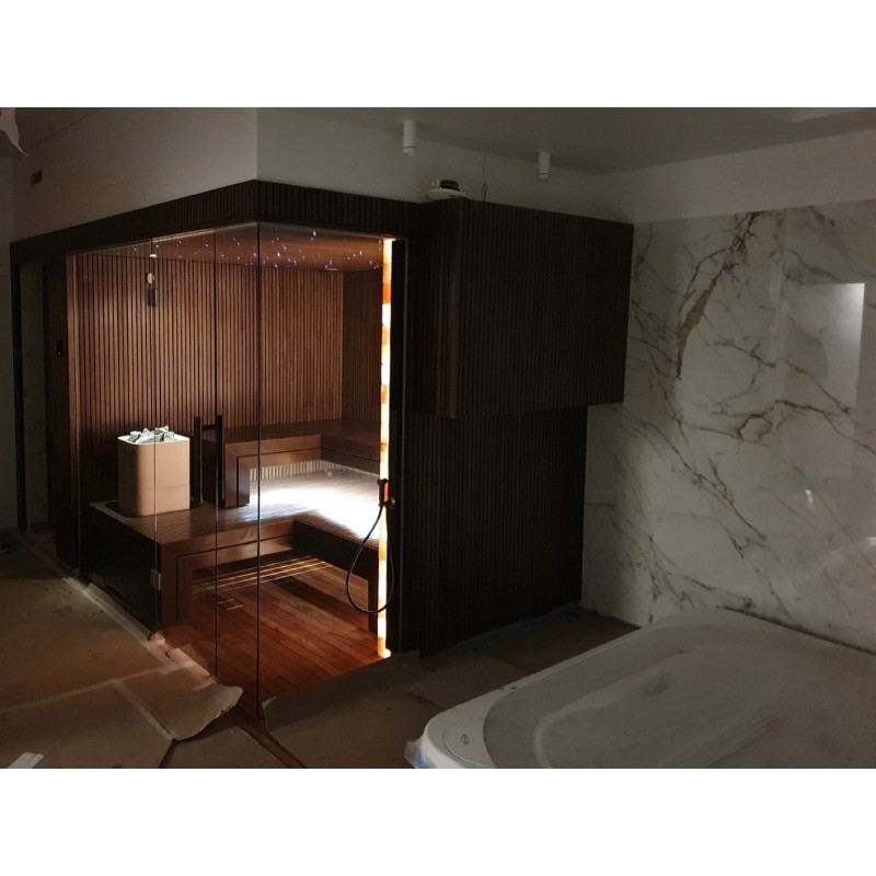In Vilnius wurde ein individuelles Saunaprojekt realisiert. Ausgewähltes Lindenholz mit natürlichem Wachs mit Farbe bedeckt. Weißes Heizgerät Tulikivi Kuura 2 mit einem separaten Dampfbad-Dampfgenerator (Harvia 4,5 kW), der in den Heizer eingeführt wurde. Dieses System produziert eine sehr hohe Menge an Sekundärfeuchte.