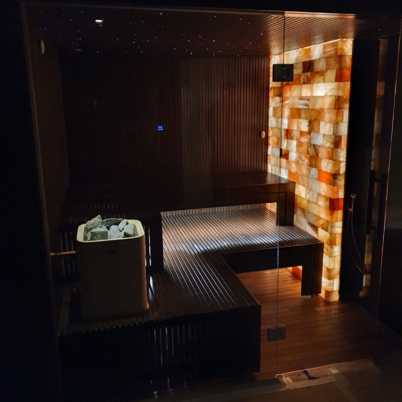 Die für die Saunadekoration ausgewählten Himalaya-Salzsteine mit integrierter Beleuchtung schaffen eine gemütliche Atmosphäre und verstärken die Wirkung der Sauna zusätzlich. Himalaya-Salzsteine sind ein natürlicher Ionisator, der die Luftqualität effektiv verbessert, indem er negative Ionen emittiert. Negativ ionisierte Luft verbessert die Gesundheit, hilft bei der Behandlung vieler Beschwerden wie: Asthma bronchiale, Lungen- und Bronchialerkrankungen, Postinfarkt, Bluthochdruck, Magen-Darm-Geschwüre, Gastritis, Schilddrüsenerkrankungen, Dermatitis, verschiedene Allergien, Nervenerkrankungen, hilft bei der Überwindung von Schlaganfällen. Die Durchführung der Prozeduren in einer solchen Sauna hat zwei Vorteile.