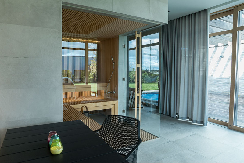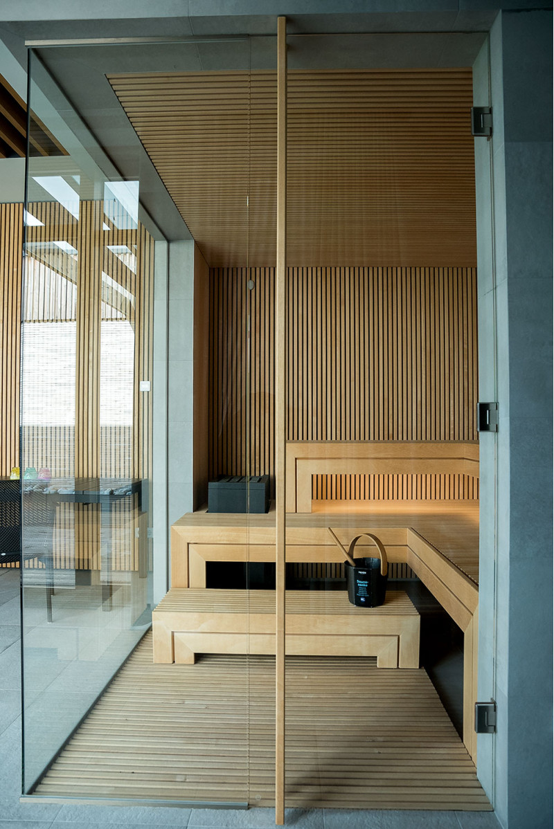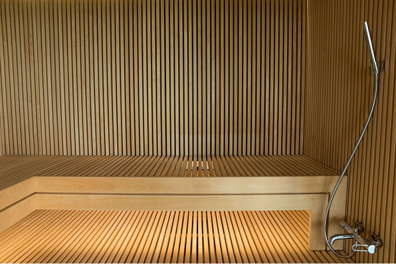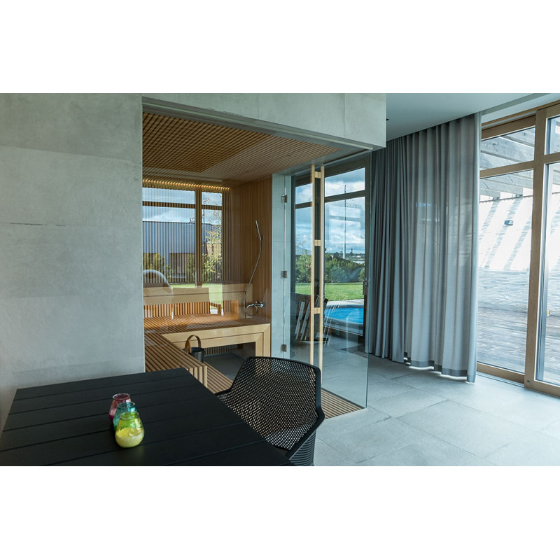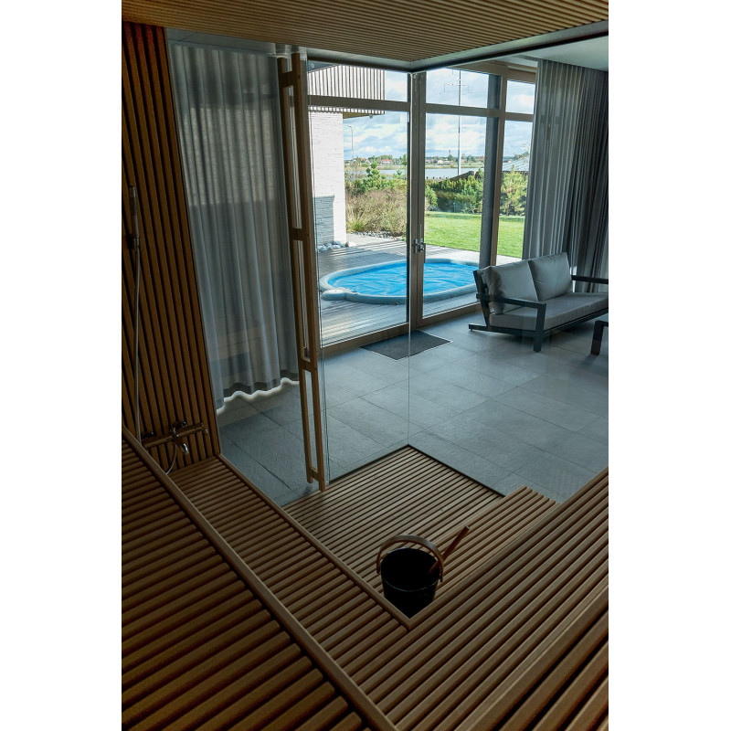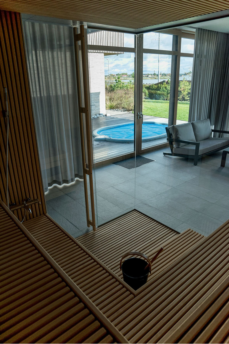 Das exklusive Design dieser Sauna entsteht durch die Dekoration mit durchbrochenem Holz-Brüssel. Auch in der Sauna kamen sich wiederholende Holzmotive zum Einsatz. Es ist ein sauberer und harmonischer Raum entstanden, der nicht durch eine Saunaglasvitrine unterteilt wird, sondern im Gegenteil erweitert und den Blick auf die herrliche Natur freigibt.