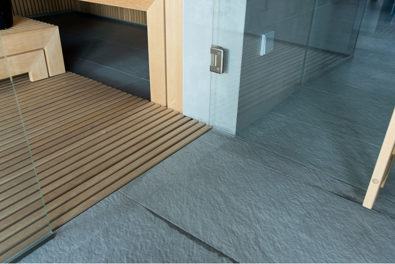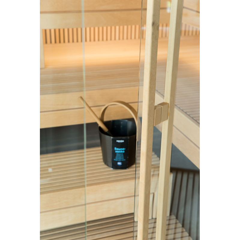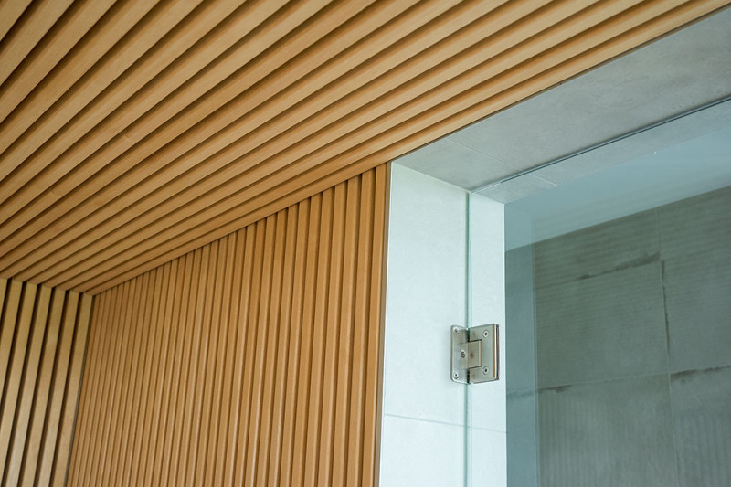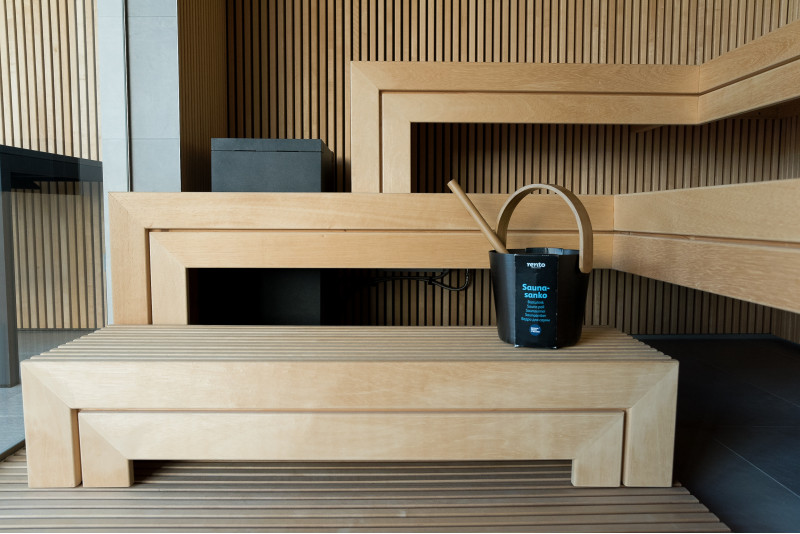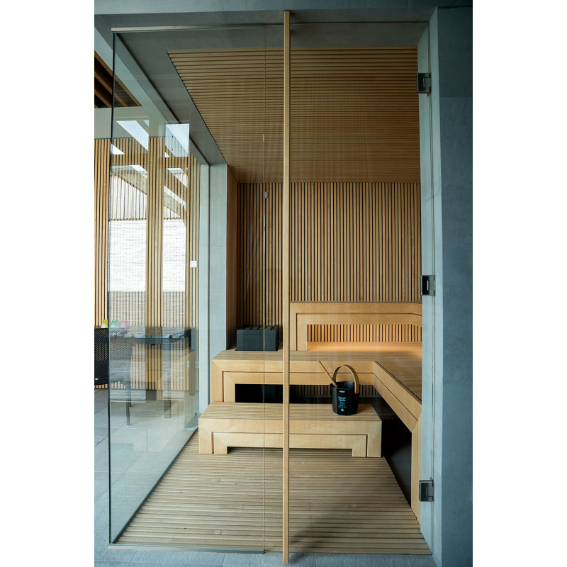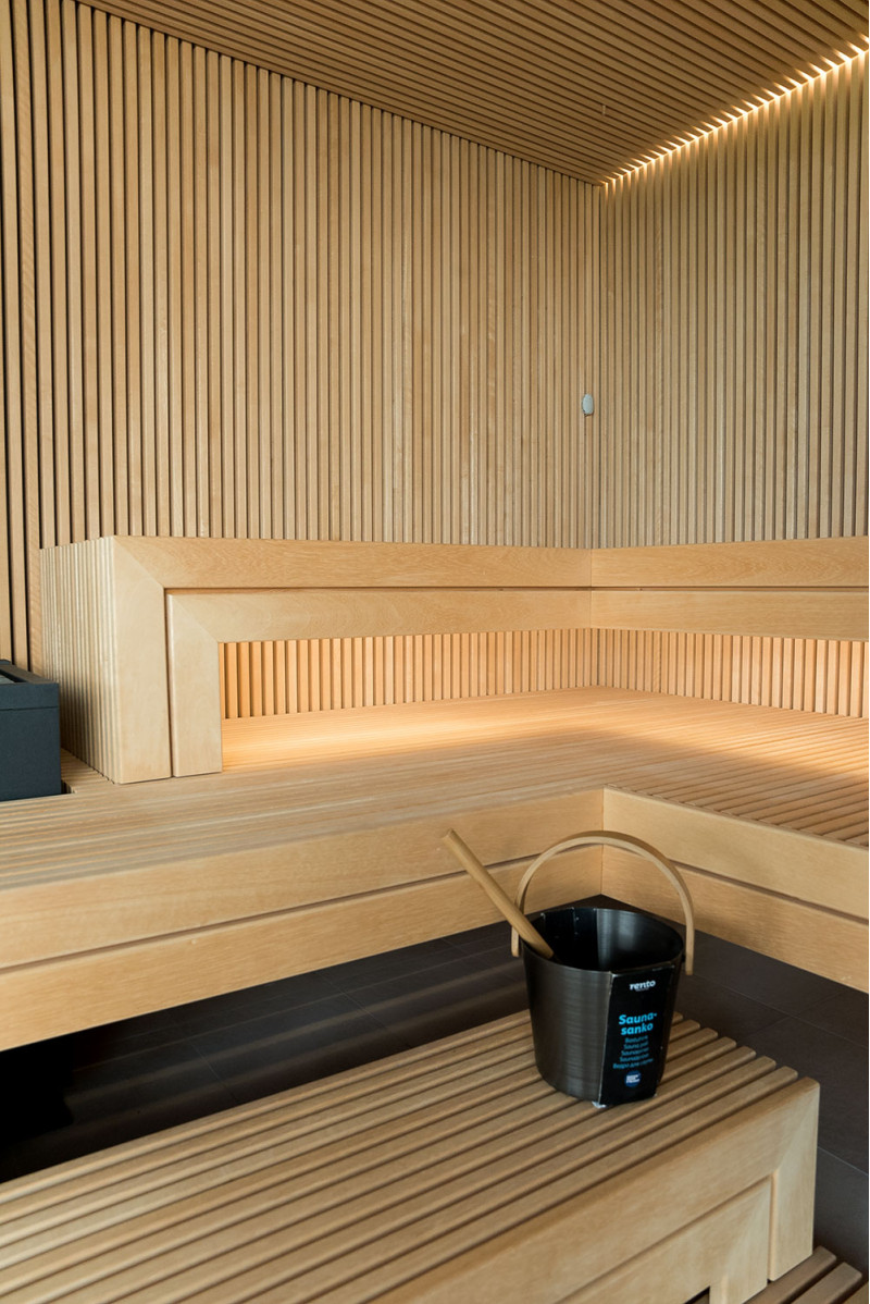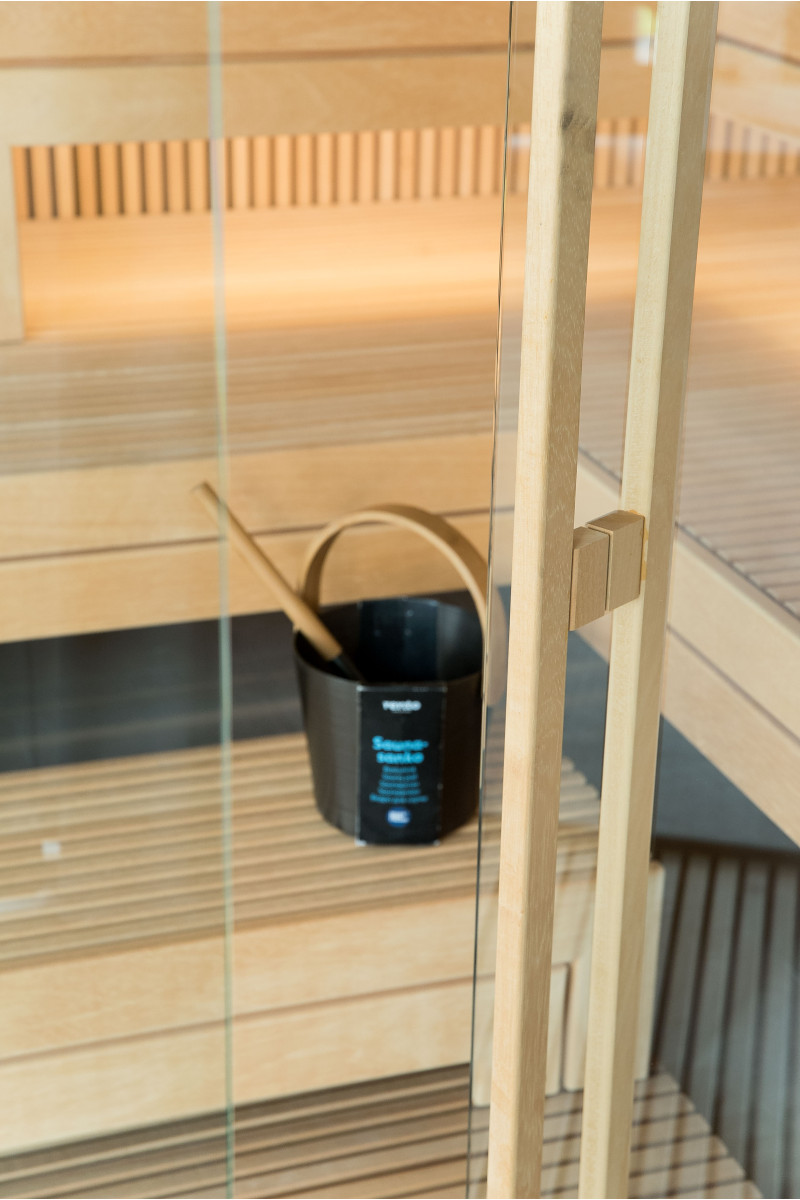 Das exklusive Design dieser Sauna entsteht durch die Dekoration mit durchbrochenem Holz-Brüssel. Auch in der Sauna kamen sich wiederholende Holzmotive zum Einsatz. Es ist ein sauberer und harmonischer Raum entstanden, der nicht durch eine Saunaglasvitrine unterteilt wird, sondern im Gegenteil erweitert und den Blick auf die herrliche Natur freigibt.