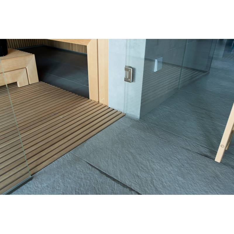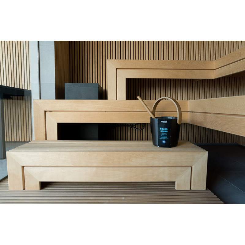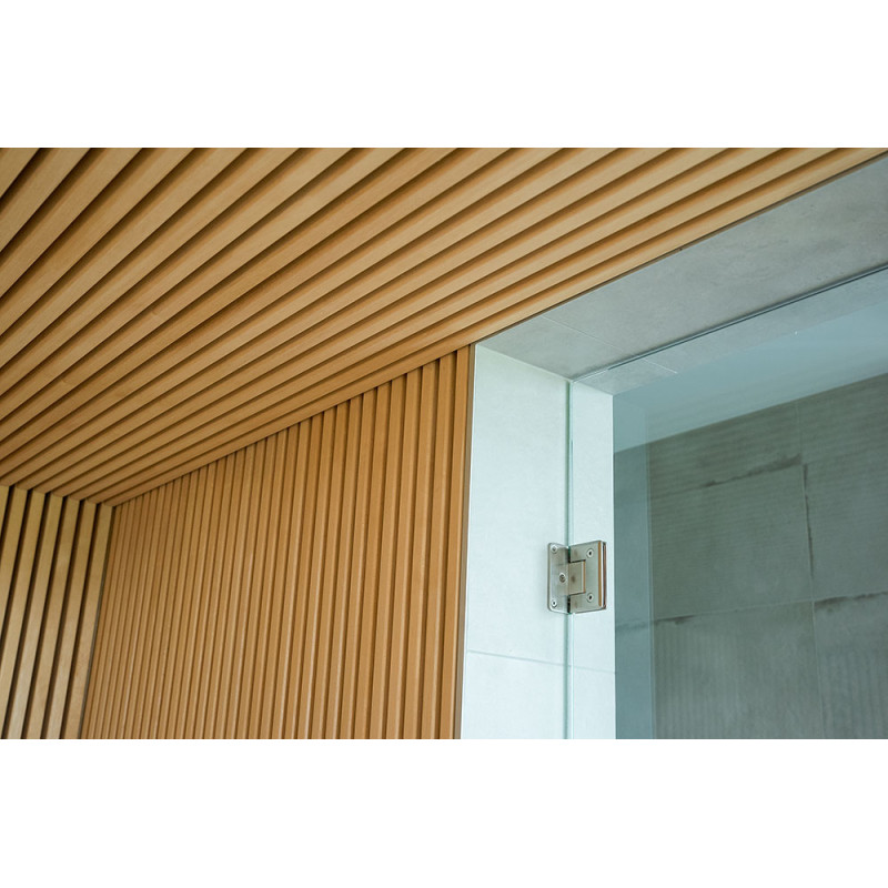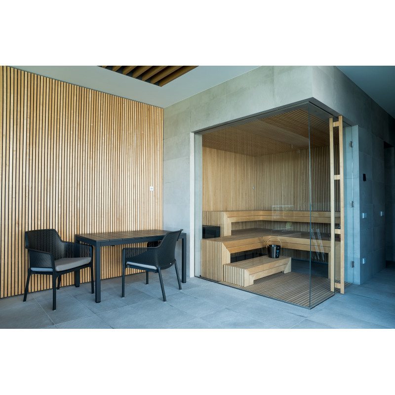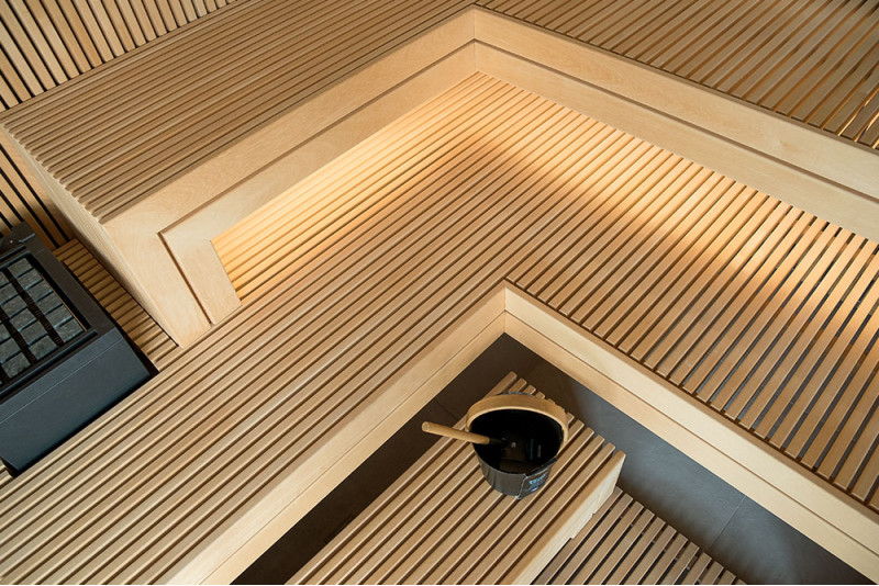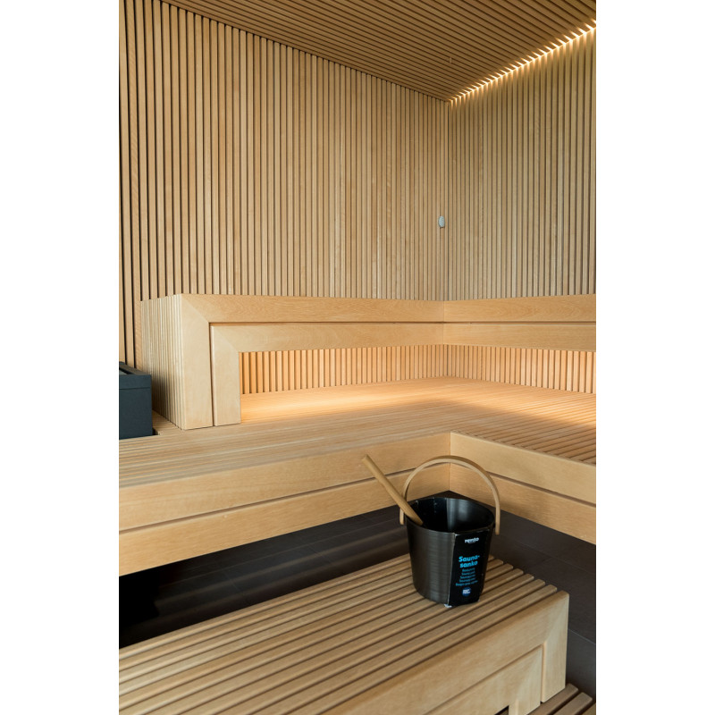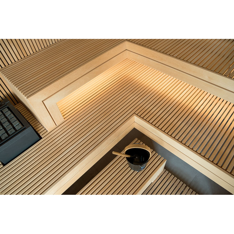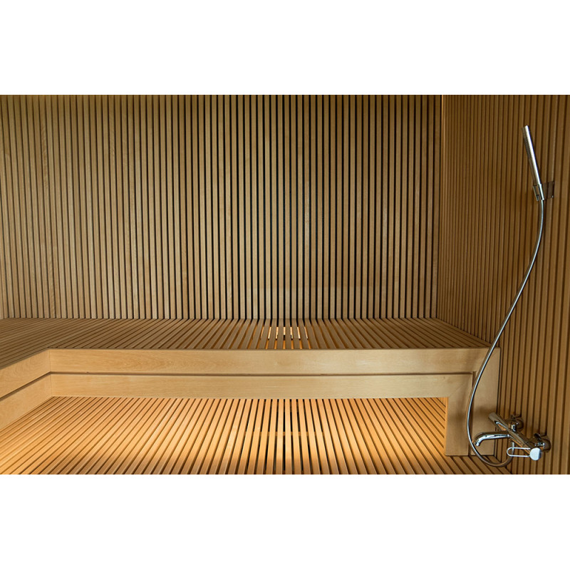 Als sehr helles Holz wurde Abachi gewählt. Weiche und niedrige Hitze. Diese positive Eigenschaft ermöglicht es Ihnen, die Freuden der Sauna bequem zu genießen. Lichtleiterbeleuchtung betont die Struktur des Holzes. Die unter den Liegen und der Decke angebrachte Beleuchtung windet sich horizontal über die gesamte Wand und beleuchtet die durchbrochenen Holzleisten angenehm.