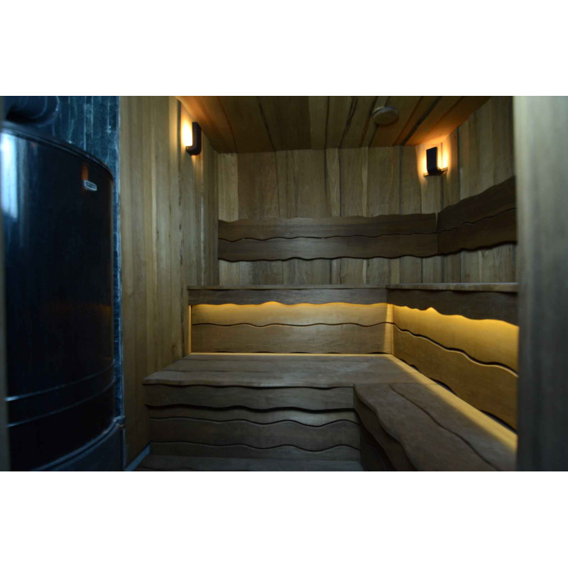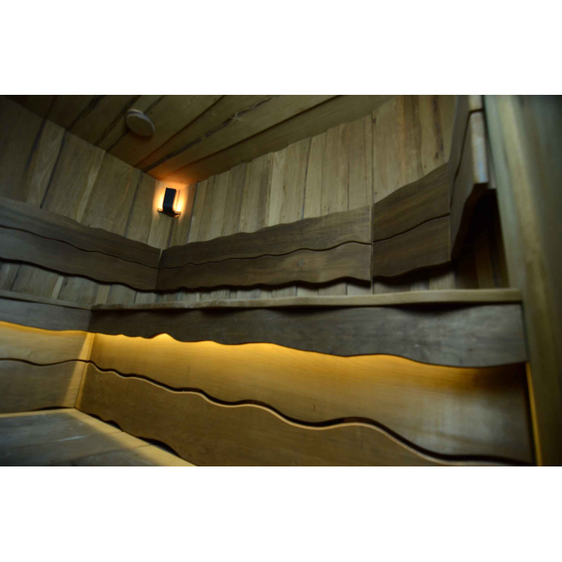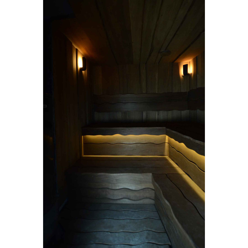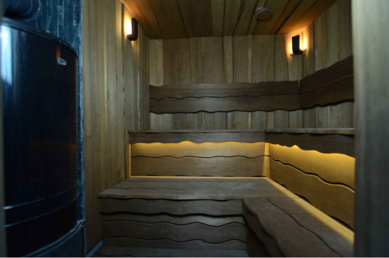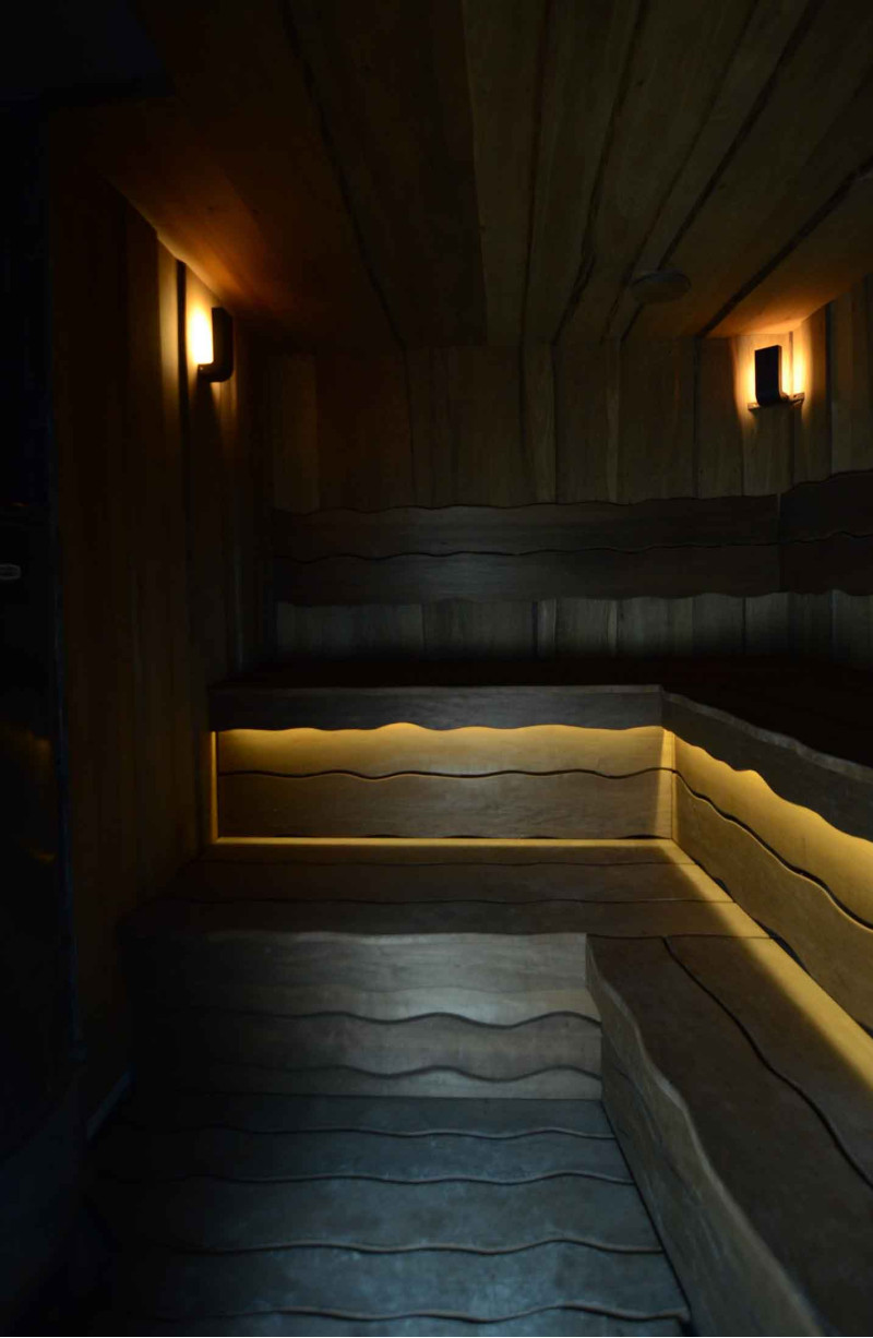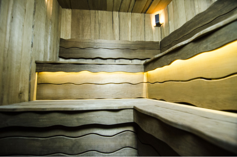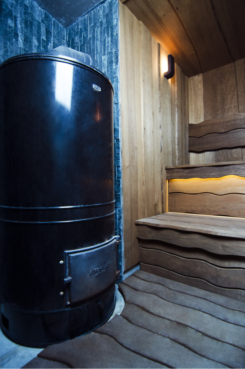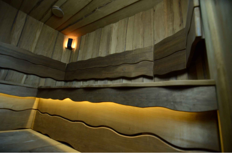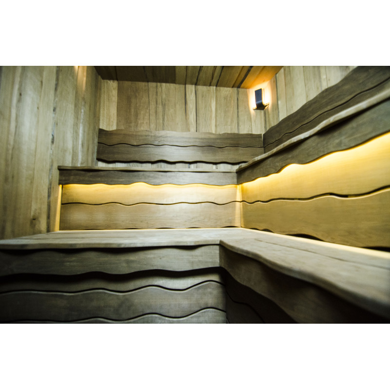 Gebranntes Espenholz wurde verwendet, um die Wände und die Decke der Sauna sowie die Bänke und Rückenlehnen zu schmücken. Um der Sauna Gemütlichkeit und Natürlichkeit zu verleihen, wurden gehobelte Einschnittbretter gewählt.