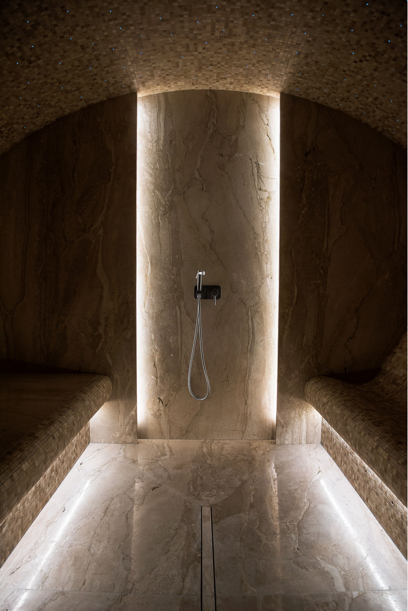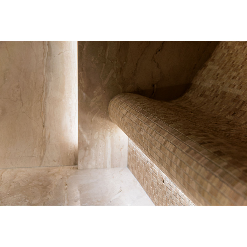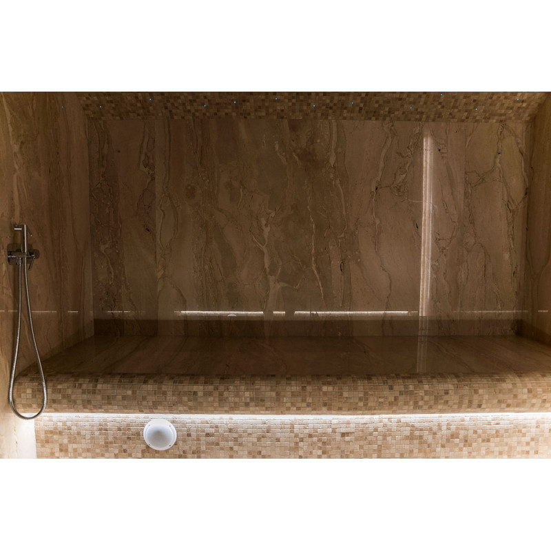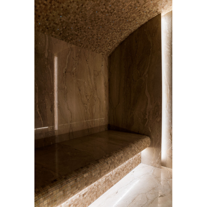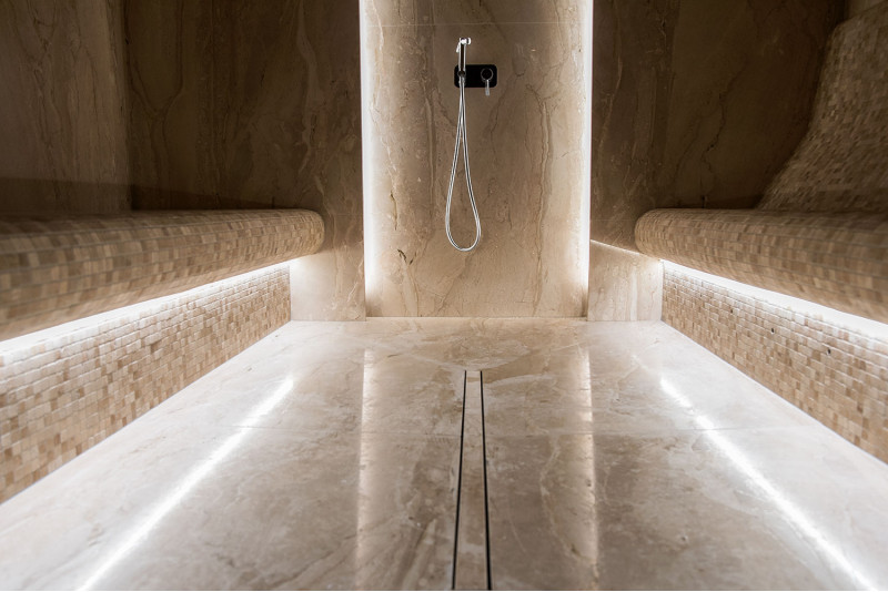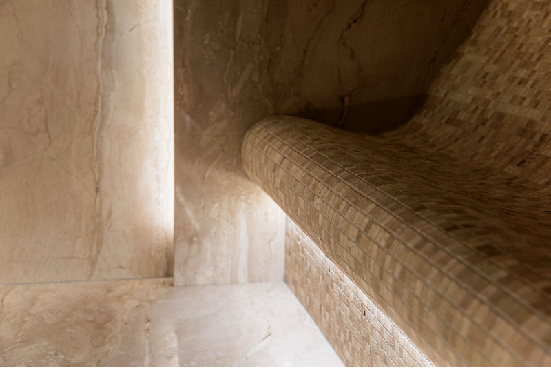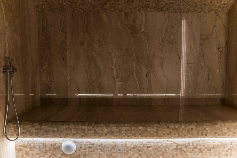 Die Wände des Dampfbades sind mit Marmorplatten ausgekleidet, die Betten und Decken sind aus Marmormosaikfliesen. Eines der Betten, das breitere zum Liegen, das andere mit ergonomisch geformter Rundung - zum Sitzen. Beheizt wird die Sauna von einem 9kW Pego Dampfgenerator, der von der berührungsempfindlichen Fasel-Steuerung gesteuert wird. Die LED-Beleuchtung in der Sauna befindet sich unter den Betten und an den Wänden ist das System „Žvaigždėtas dangus“ in die Decke eingelassen. Die Duftpumpe verströmt einen angenehmen Duft und Frische in der Sauna.