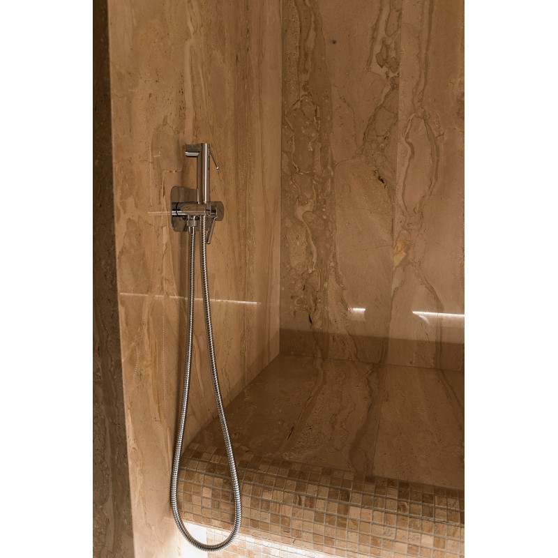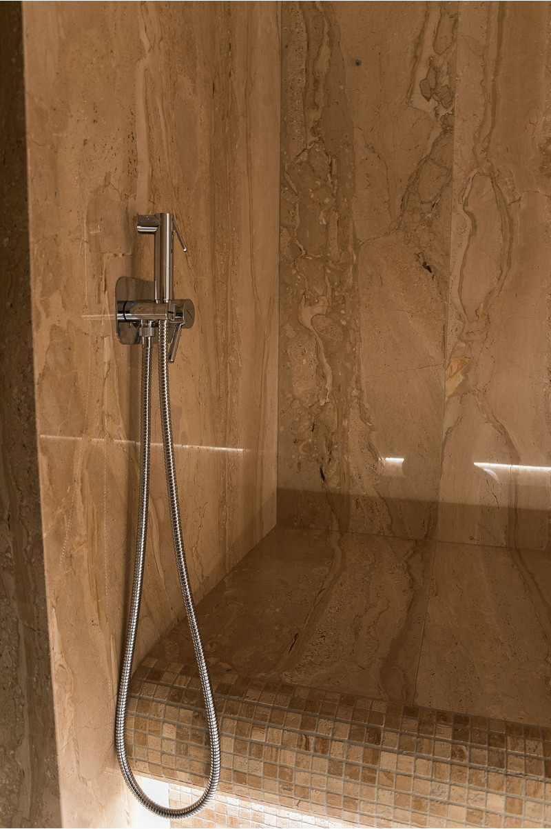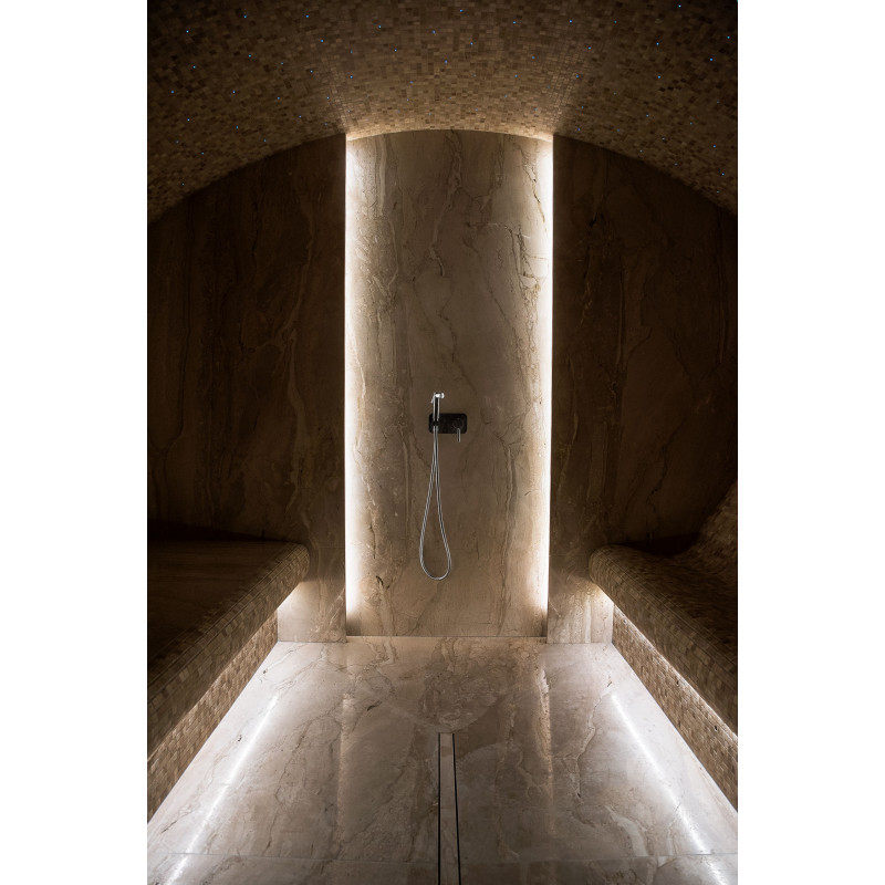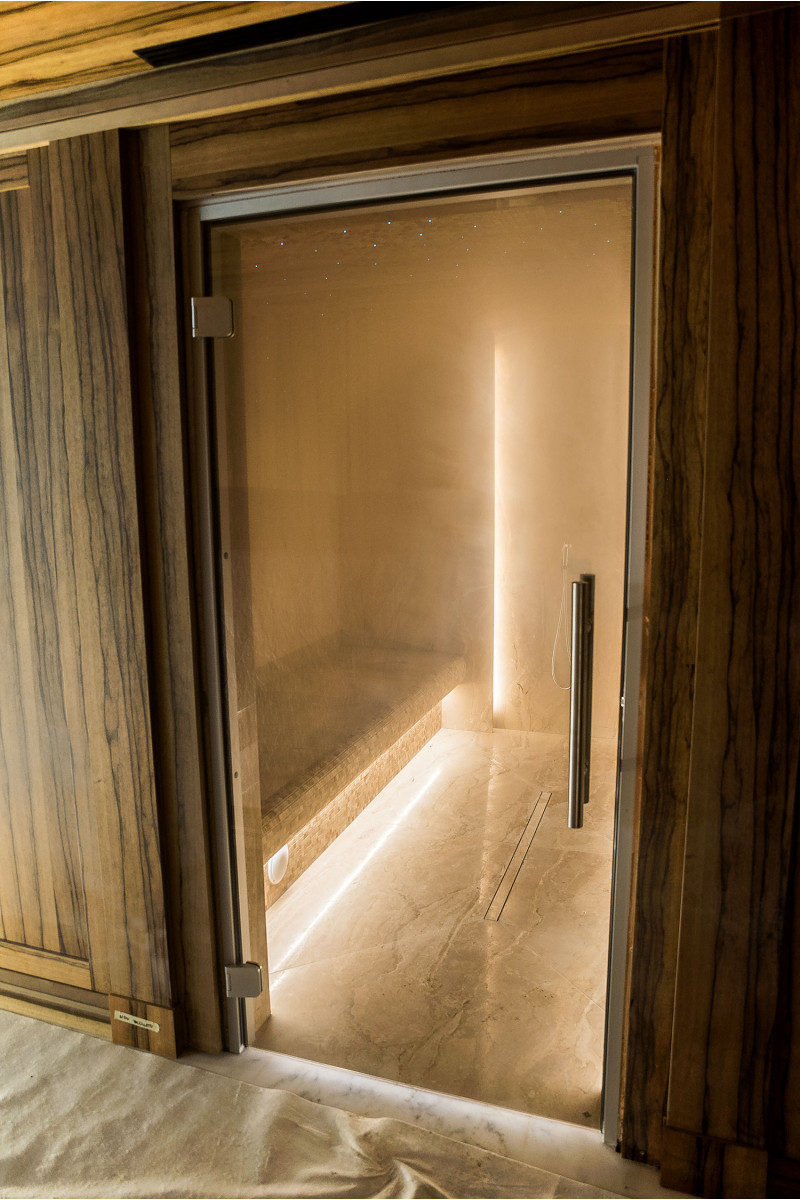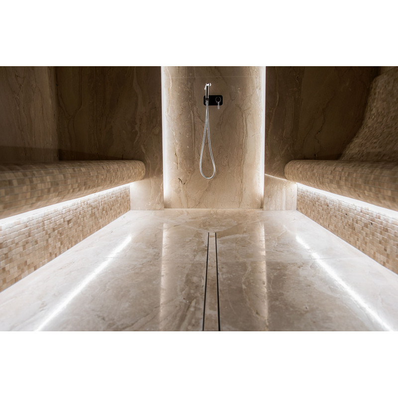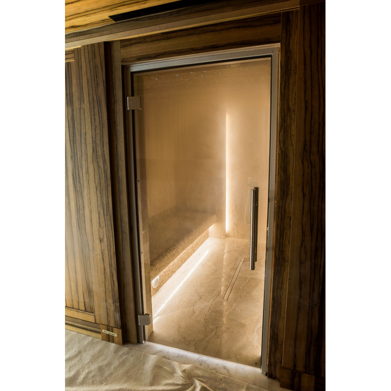 Die Wände des Dampfbades sind mit Marmorplatten ausgekleidet, die Betten und Decken sind aus Marmormosaikfliesen. Eines der Betten, das breitere zum Liegen, das andere mit ergonomisch geformter Rundung - zum Sitzen. Beheizt wird die Sauna von einem 9kW Pego Dampfgenerator, der von der berührungsempfindlichen Fasel-Steuerung gesteuert wird. Die LED-Beleuchtung in der Sauna befindet sich unter den Betten und an den Wänden ist das System „Žvaigždėtas dangus“ in die Decke eingelassen. Die Duftpumpe verströmt einen angenehmen Duft und Frische in der Sauna.