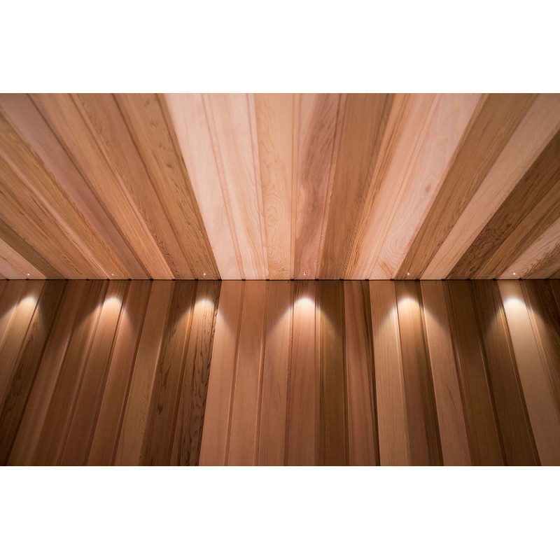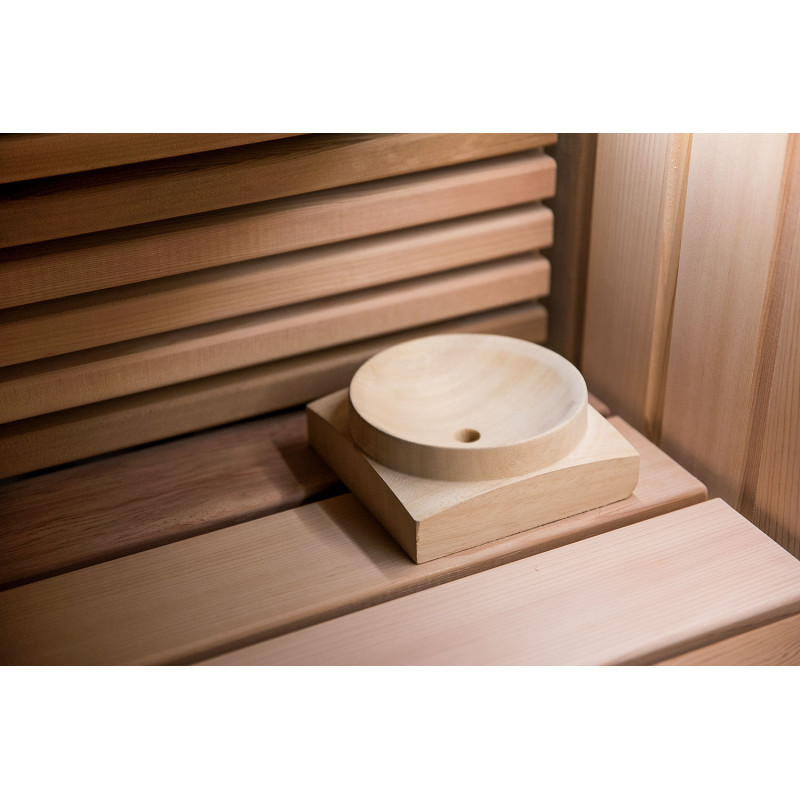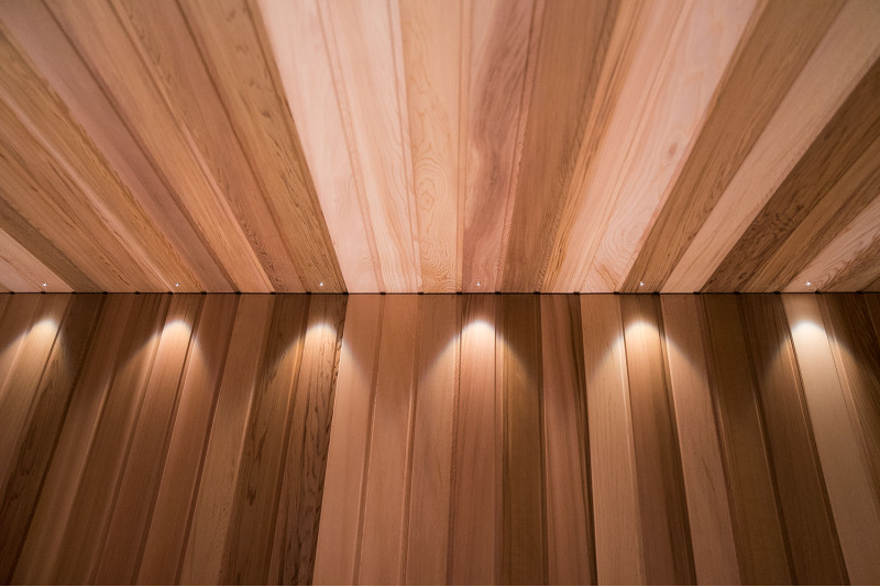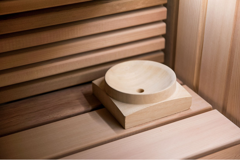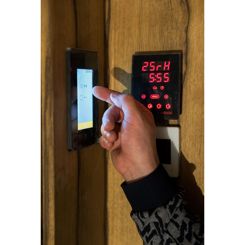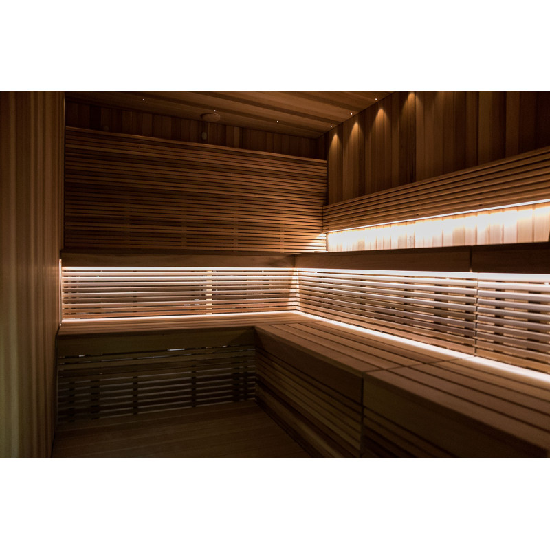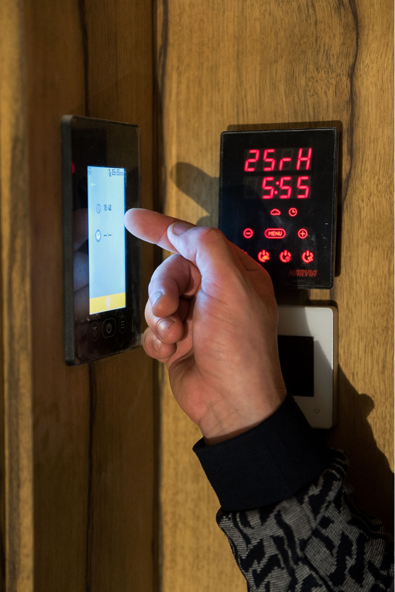 Für die Sauna wurde ein sehr schönes Holz gewählt - rote kanadische Zeder. Dekorative Holzblöcke werden von einem LED-System beleuchtet, die Decke verfügt über ein eingebettetes Glasfaser-Beleuchtungsset von Cariitti. Unter den Saunaliegen ist der EOS bi-O Mat Heizer mit integriertem Verdampfer installiert, der von der Harvia Xenio Combi CX110C Steuereinheit gesteuert wird.