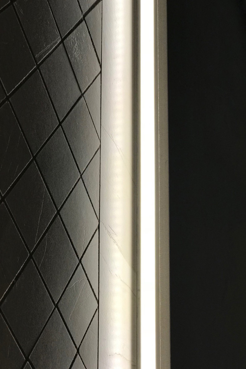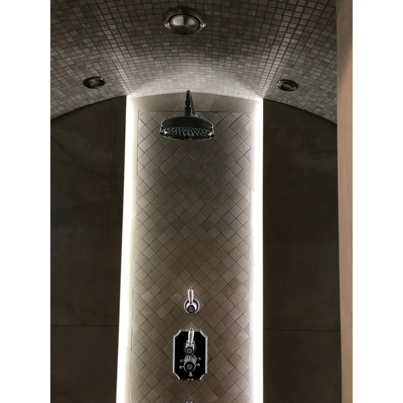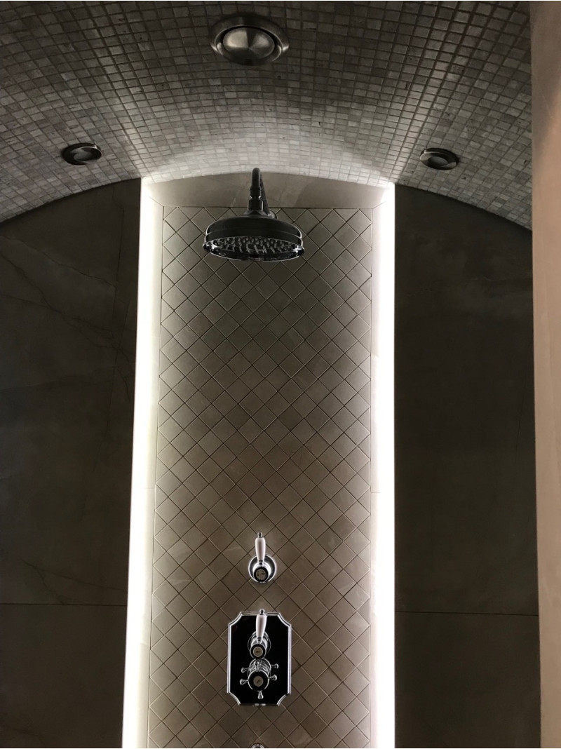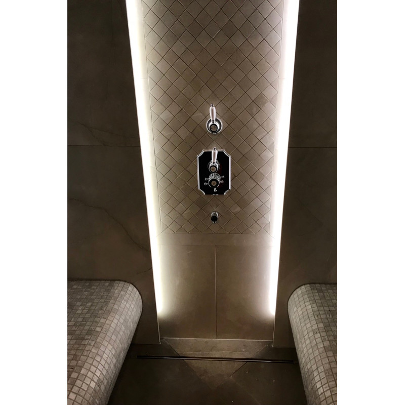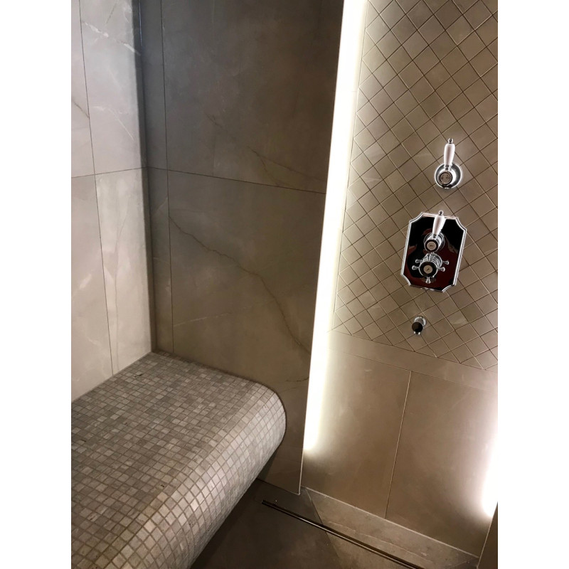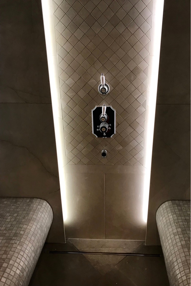 Eingebauter LED-Streifen unter den Liegen, an den Wänden und vier Kronleuchtern an der Decke.