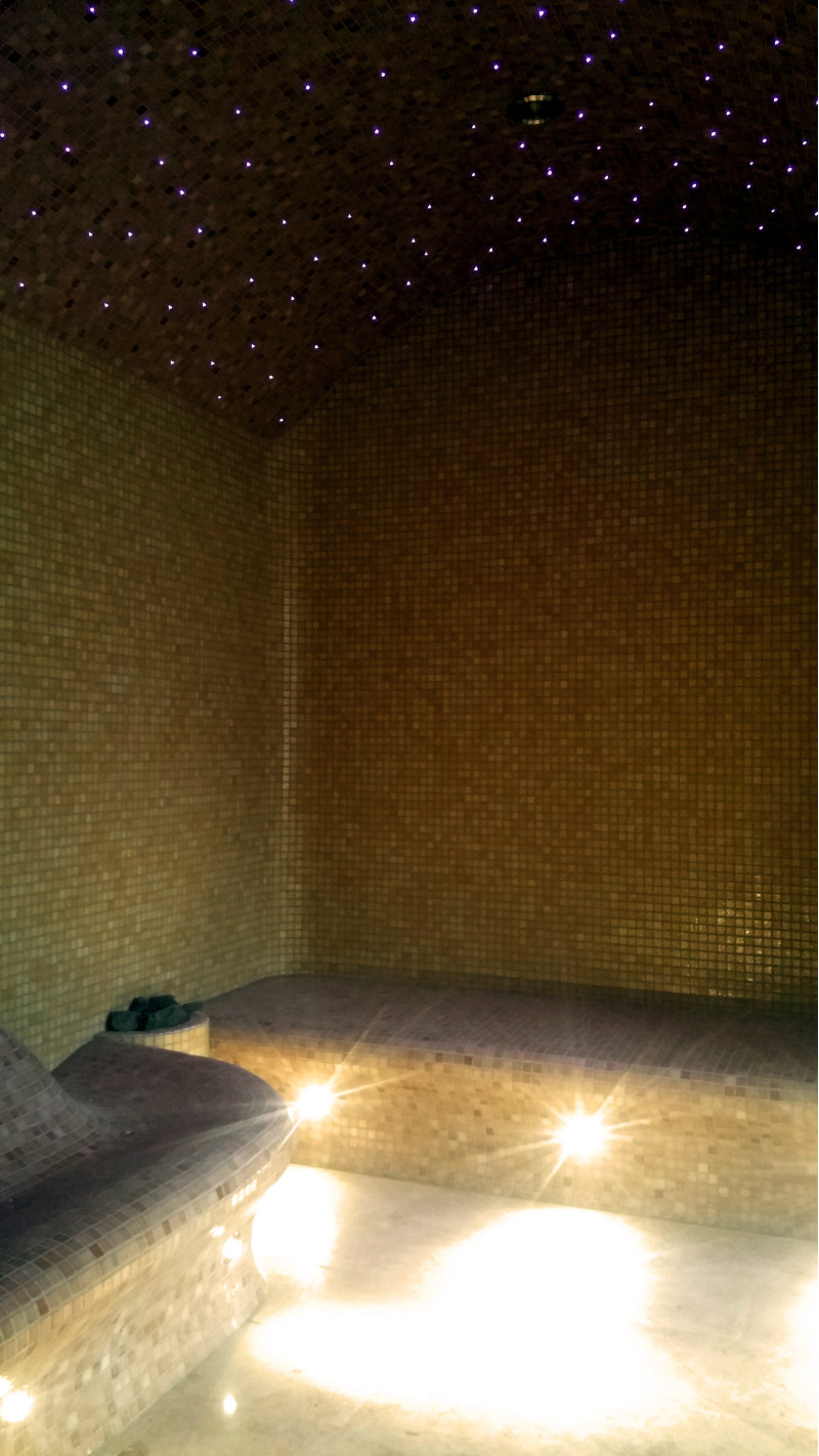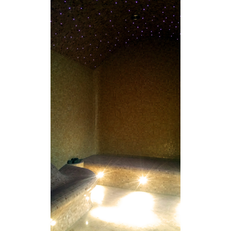 Faseroptisches Beleuchtungssystem für die Decke - "Sternenhimmel". Unter den Bänken sorgt eine LED-Beleuchtung für die Bodenbeleuchtung.