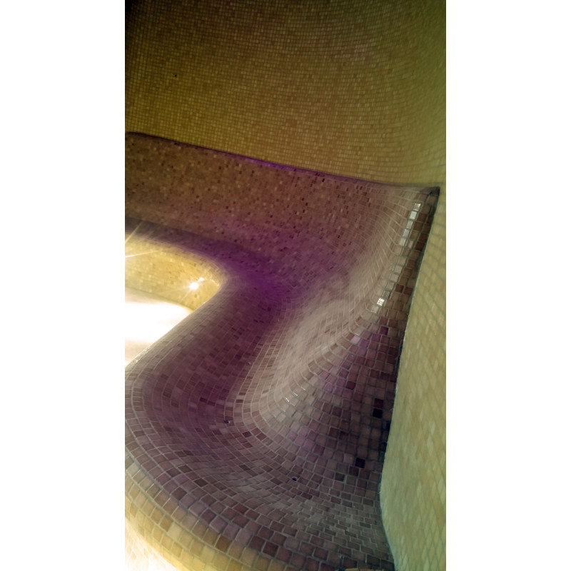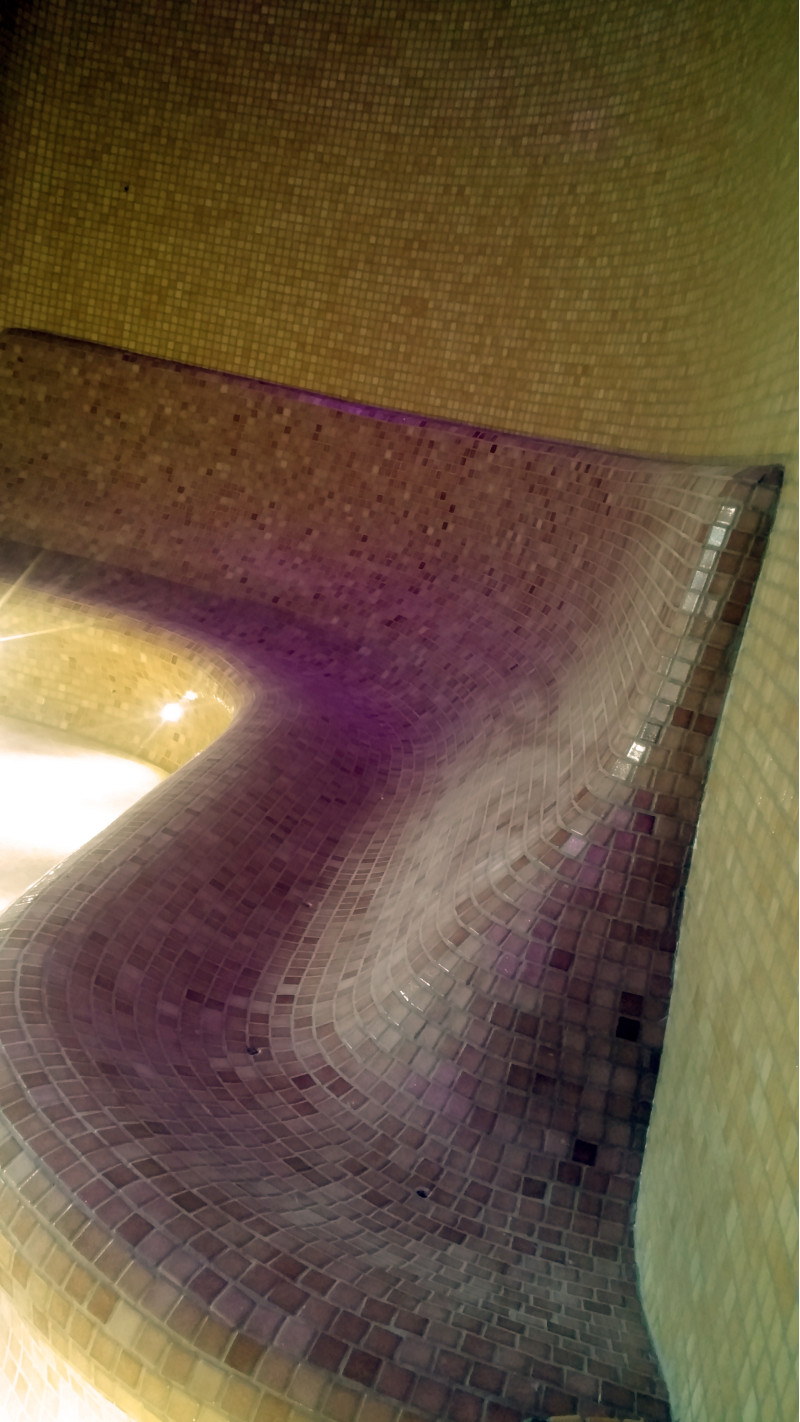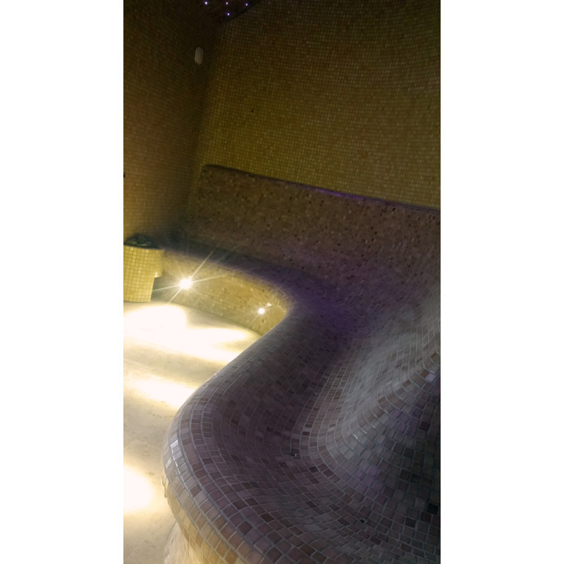 Veredelung - Böden, Wände, Bänke mit Mosaikfliesen aus zerkleinertem Glas.