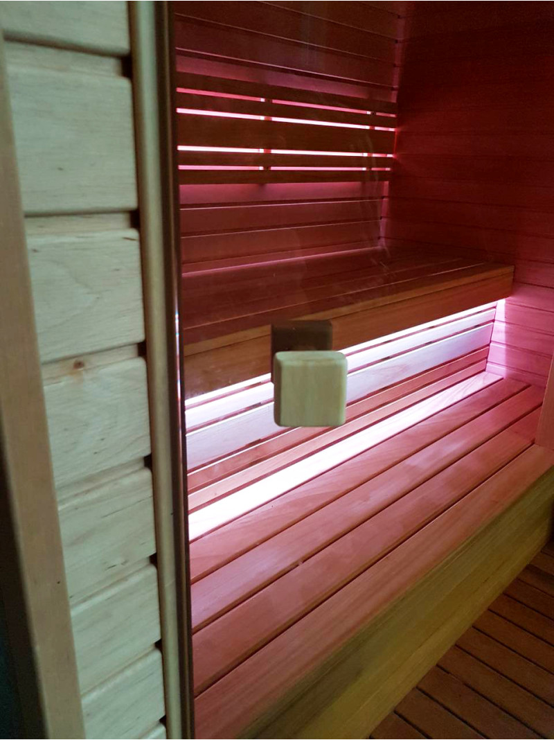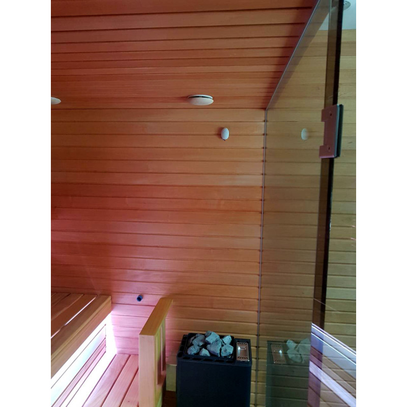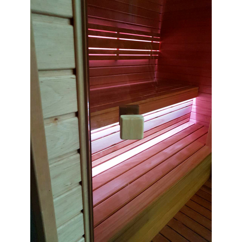 Die Saunabeleuchtung ist ein sehr wichtiges Detail, das in der Sauna eine halbentspannende Wirkung hat. Unter den Bänken und Rückenlehnen befindet sich eine LED-RGB-Farbbeleuchtung, deren Farbe Sie jederzeit ändern können. Die Sauna ist außerdem mit einem faseroptischen Weißlichtsystem "Moon" ausgestattet.