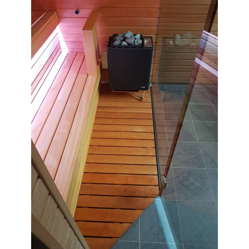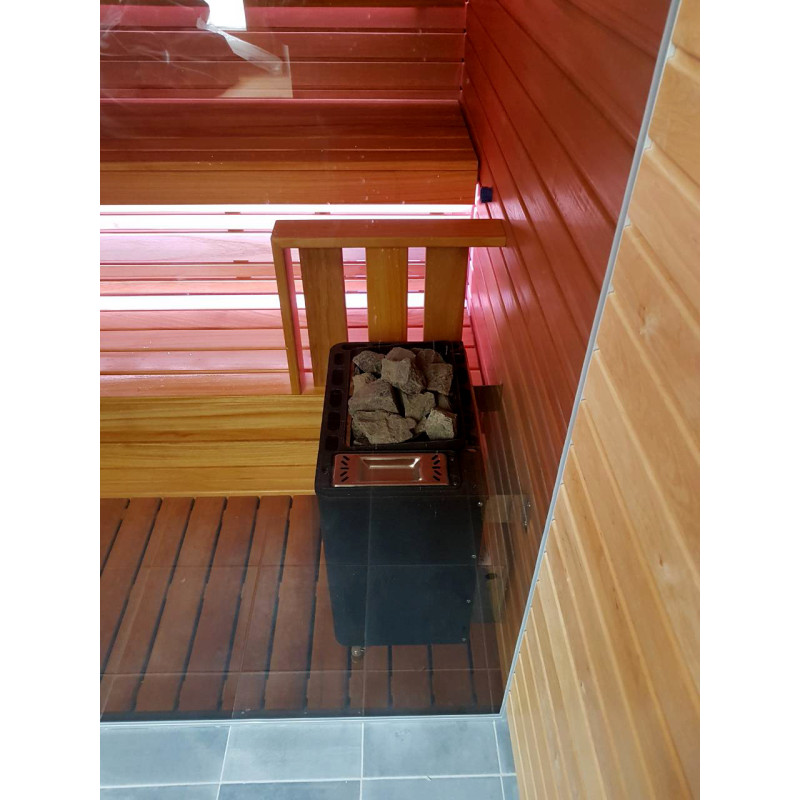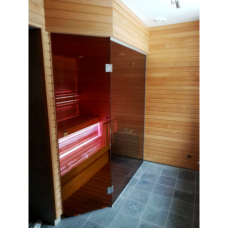 Anstelle traditioneller Türen und Wände verfügt diese kombinierte Sauna über eine modern wirkende Vitrine aus gehärtetem getöntem Glas. Eine solche Vitrine ist modern und vermittelt ein Raumgefühl.