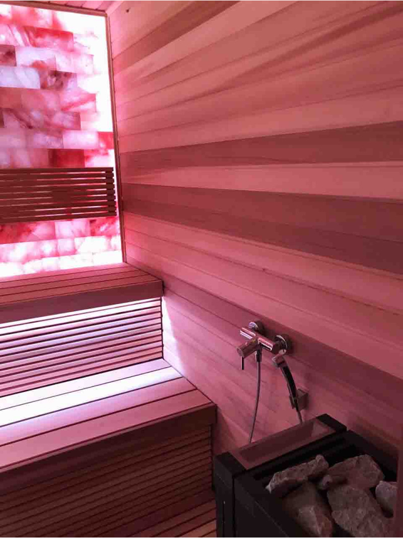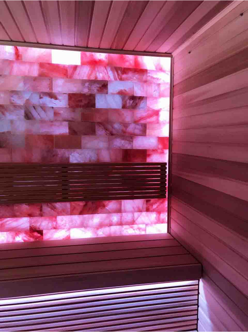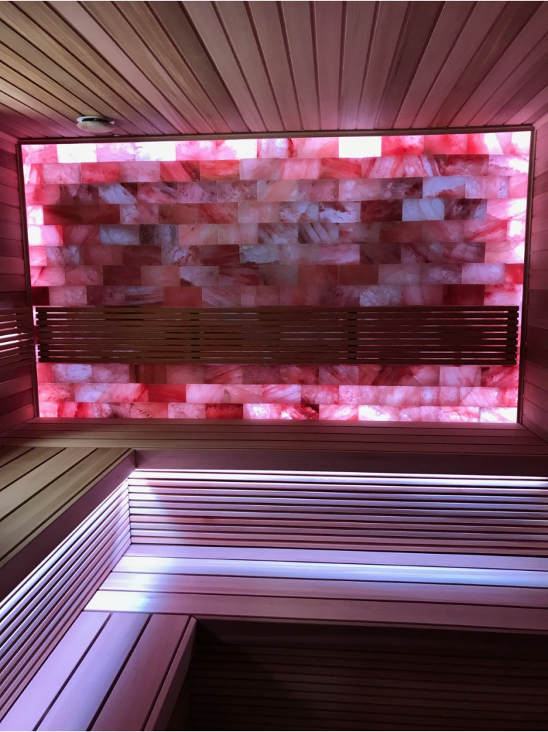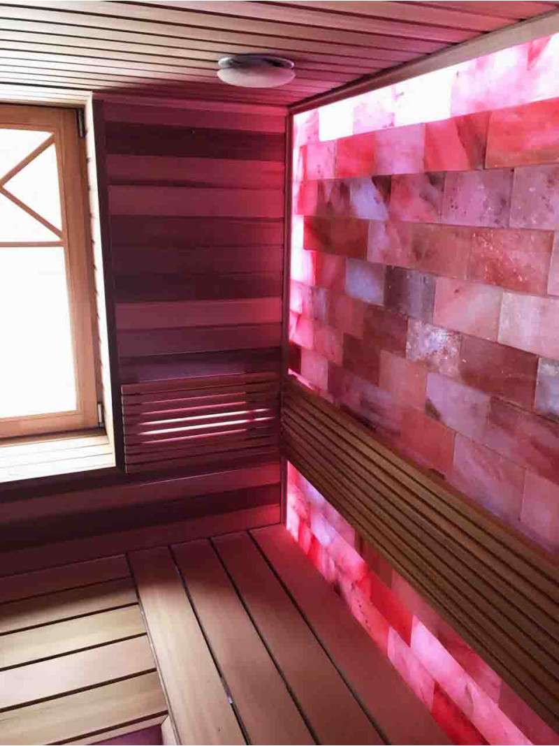Die Luftqualität und das Saunagefühl werden durch die große Wand aus Himalaya-Salzen stark verbessert. Ausgestrahlte negative Ionen verbessern die Gesundheit, helfen bei der Überwindung vieler Beschwerden wie: Asthma bronchiale, Lungen- und Bronchialerkrankungen, Postinfarkt, Bluthochdruck, Magen-Darm-Geschwüre, Gastritis, Schilddrüsenerkrankungen, Dermatitis, verschiedene Allergien, Nervenerkrankungen, hilft Stress zu überwinden. Die Durchführung von Verfahren in einer solchen Sauna hat zwei Vorteile.