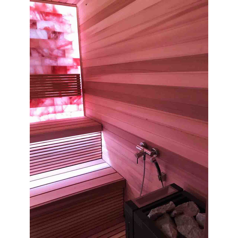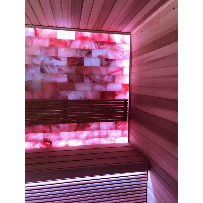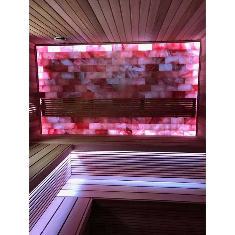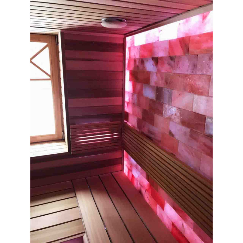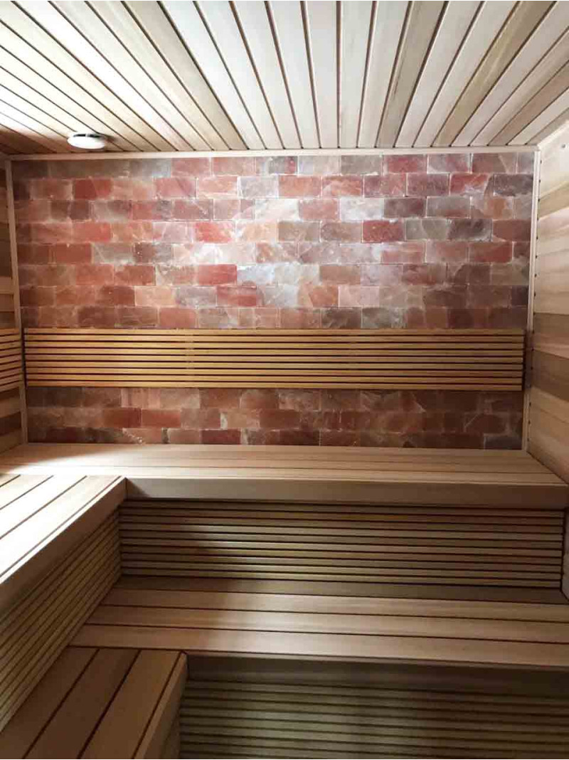 Die Luftqualität und das Saunagefühl werden durch die große Wand aus Himalaya-Salzen stark verbessert. Ausgestrahlte negative Ionen verbessern die Gesundheit, helfen bei der Überwindung vieler Beschwerden wie: Asthma bronchiale, Lungen- und Bronchialerkrankungen, Postinfarkt, Bluthochdruck, Magen-Darm-Geschwüre, Gastritis, Schilddrüsenerkrankungen, Dermatitis, verschiedene Allergien, Nervenerkrankungen, hilft Stress zu überwinden. Die Durchführung von Verfahren in einer solchen Sauna hat zwei Vorteile.