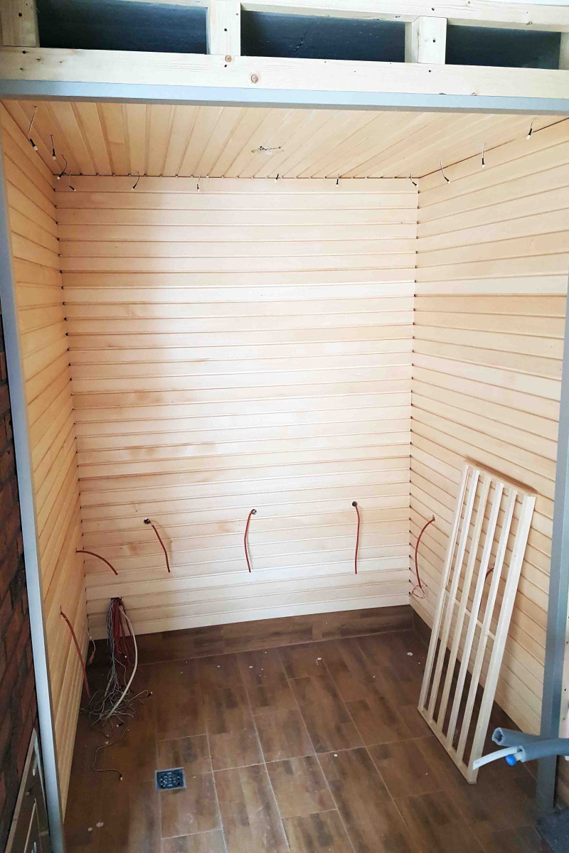 Die Innenausstattung der Sauna besteht aus Lindenholzbänken, Wänden, Decken und Bodenrosten. Die Bänke sind mit einem speziellen Paraffinöl imprägniert. Das Öl schützt die Holzoberfläche vor Feuchtigkeitseinwirkung und macht das Holz leichter zu reinigen und zu pflegen. Die Wände sind mit Wasserbadlack lackiert, der vor der Einwirkung von Schmutz, Wasser und Laugen schützt.