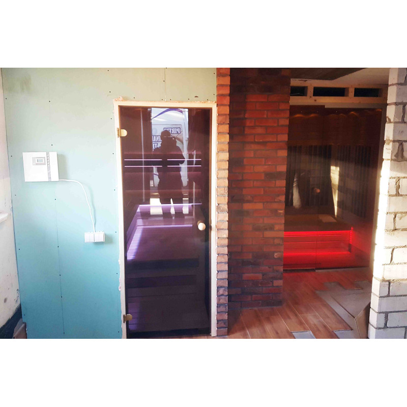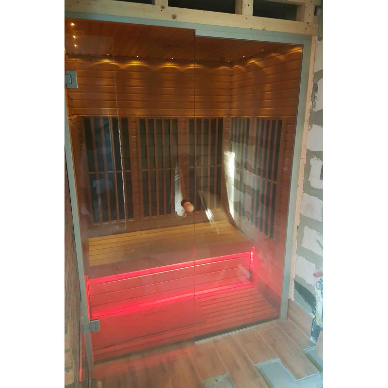 Saunabeleuchtung - LED "Saulė" - 12 Glühbirnen in der Decke, feuchtigkeits- und temperaturbeständig. Unter den Bänken für eine gemütliche Atmosphäre - farbige RGB-Beleuchtung, gesteuert durch einen kabellosen Farbwechsler.
