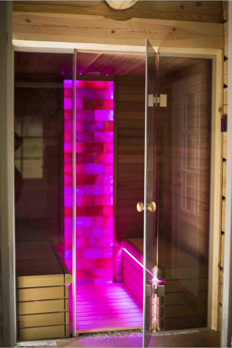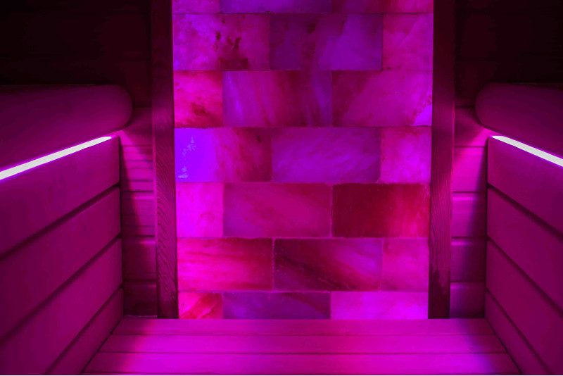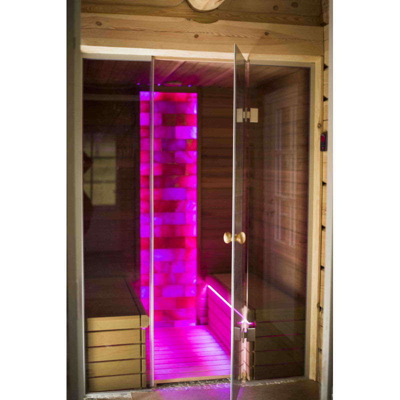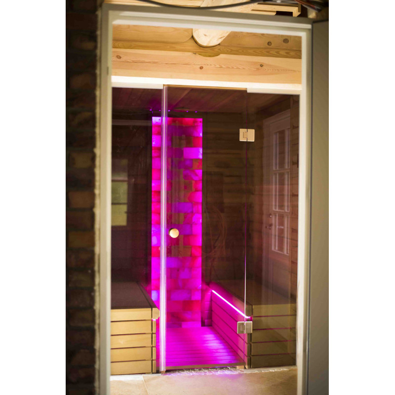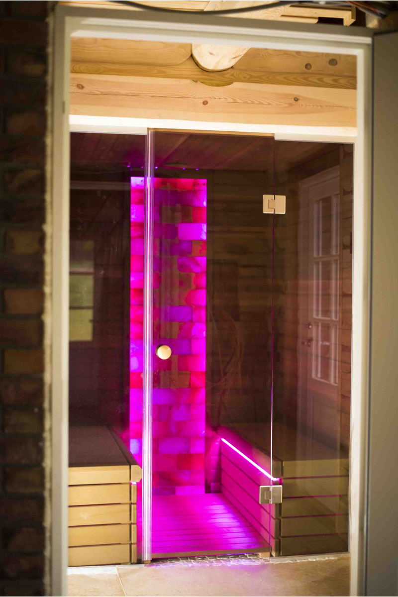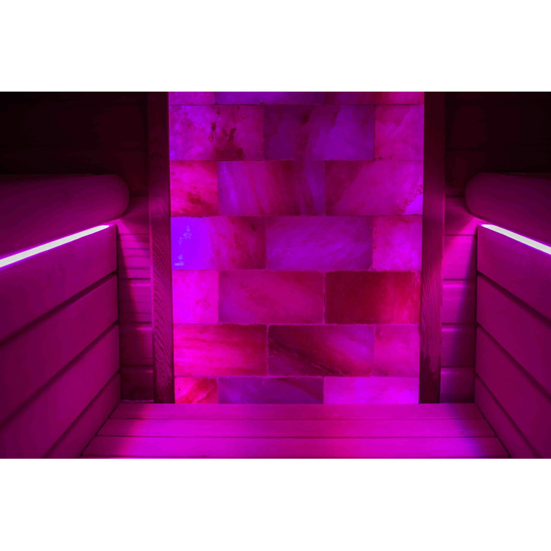 Die für die Saunadekoration gewählte Himalaya-Salzziegelwand mit der eingebauten farbigen RGB-Beleuchtung, die über einen drahtlosen Farbwechsler gesteuert wird, schafft eine gemütliche Umgebung und verstärkt die Wirkung der Sauna zusätzlich.