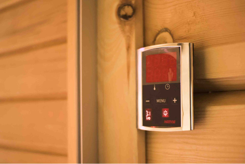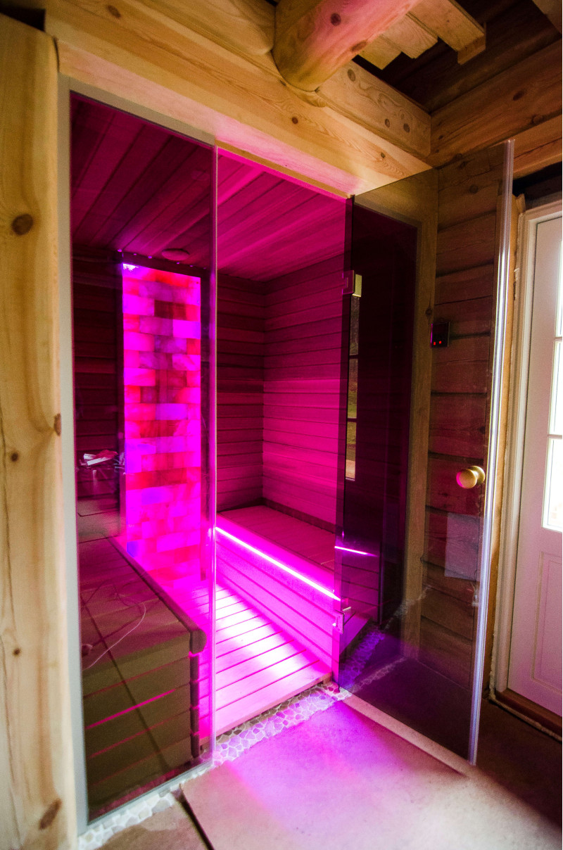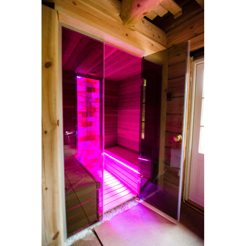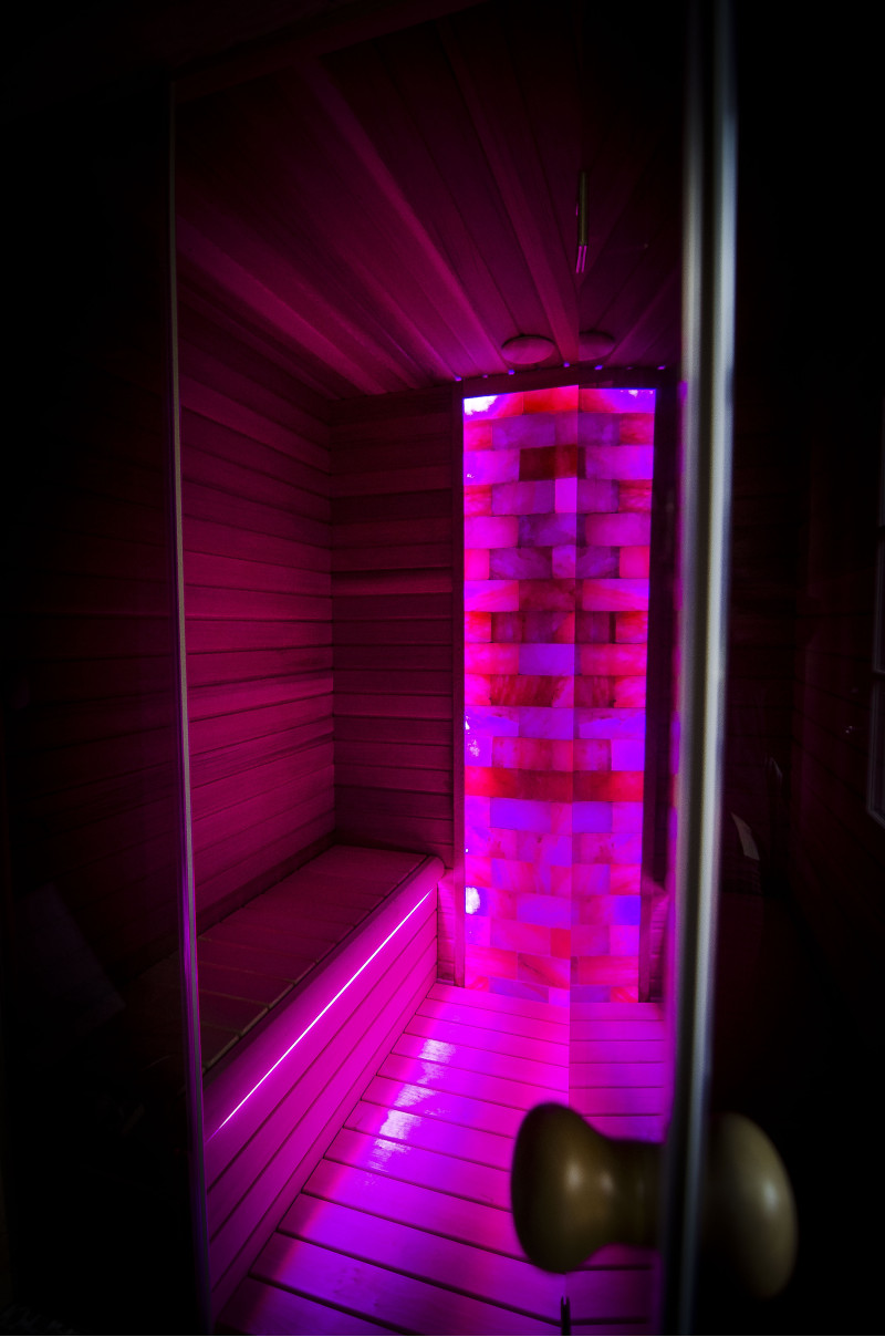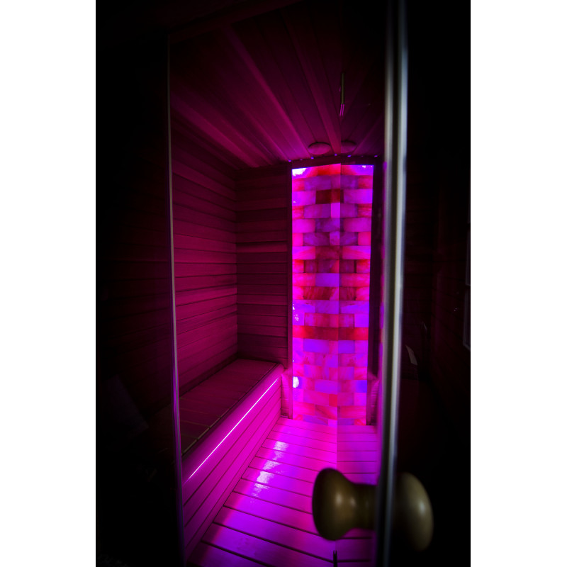Die für die Saunadekoration gewählte Himalaya-Salzziegelwand mit der eingebauten farbigen RGB-Beleuchtung, die über einen drahtlosen Farbwechsler gesteuert wird, schafft eine gemütliche Umgebung und verstärkt die Wirkung der Sauna zusätzlich.