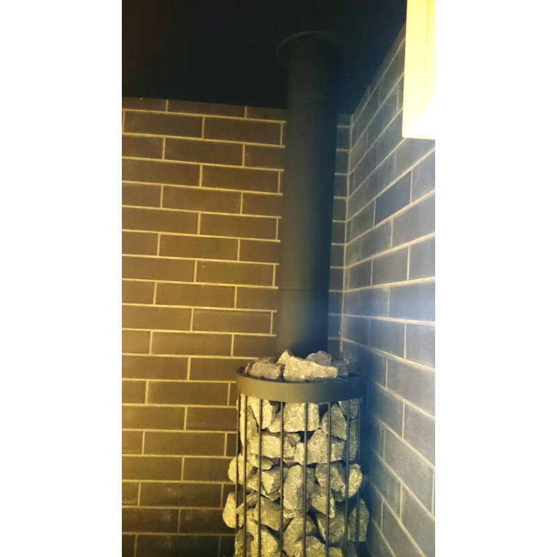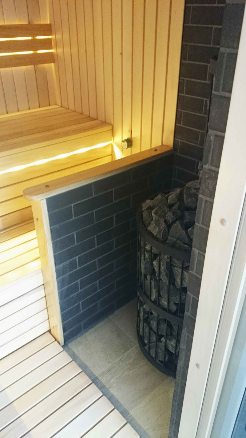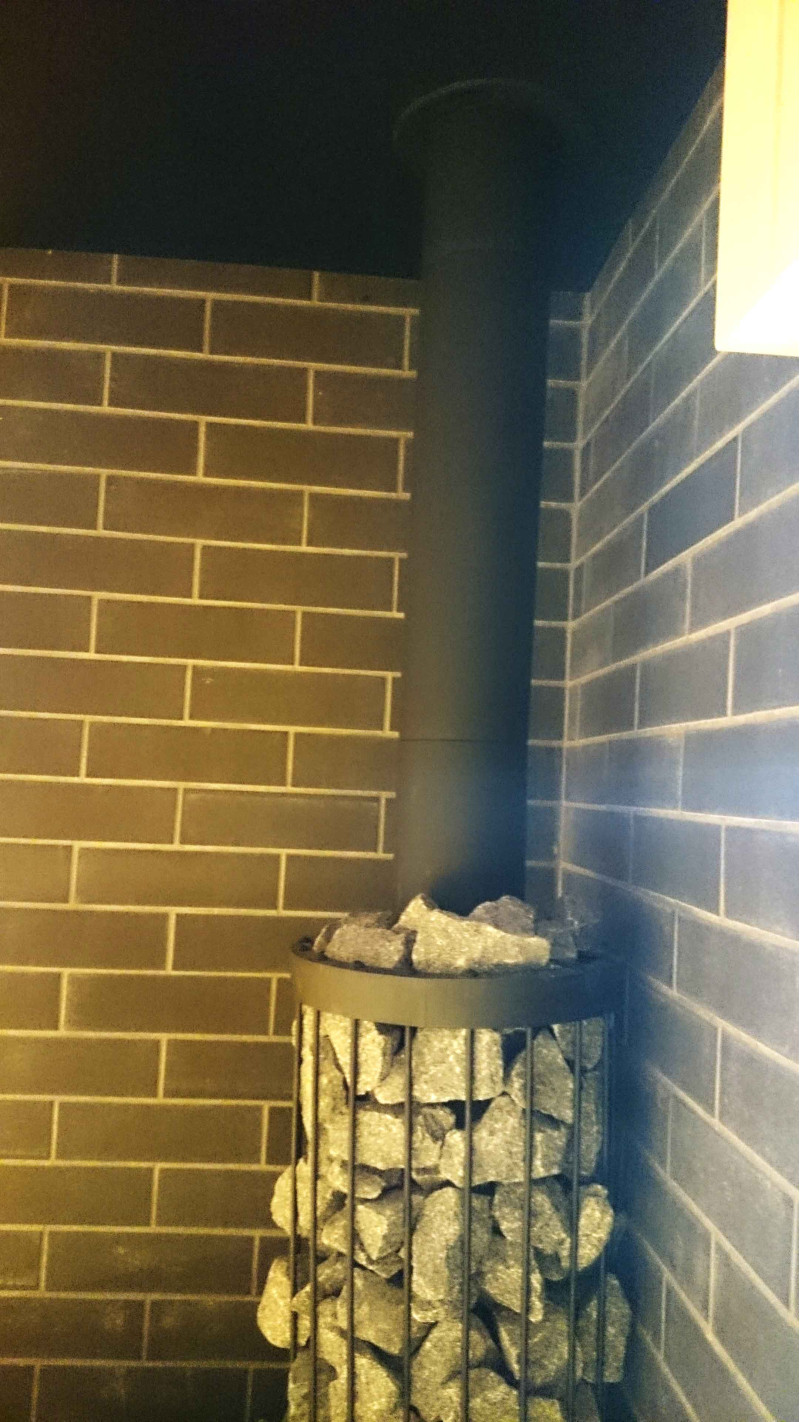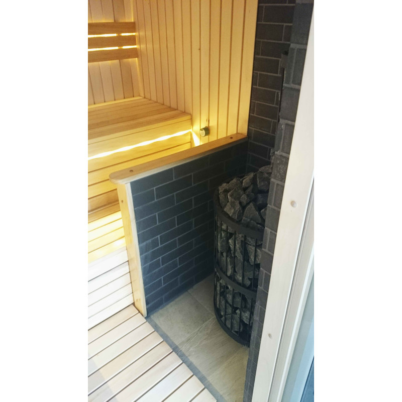 Dieses Saunaprojekt mit einer Schutzwand für den Ofen. Die Wand besteht aus einer hitzebeständigen Minerit-Platte auf einem Metallrahmen.