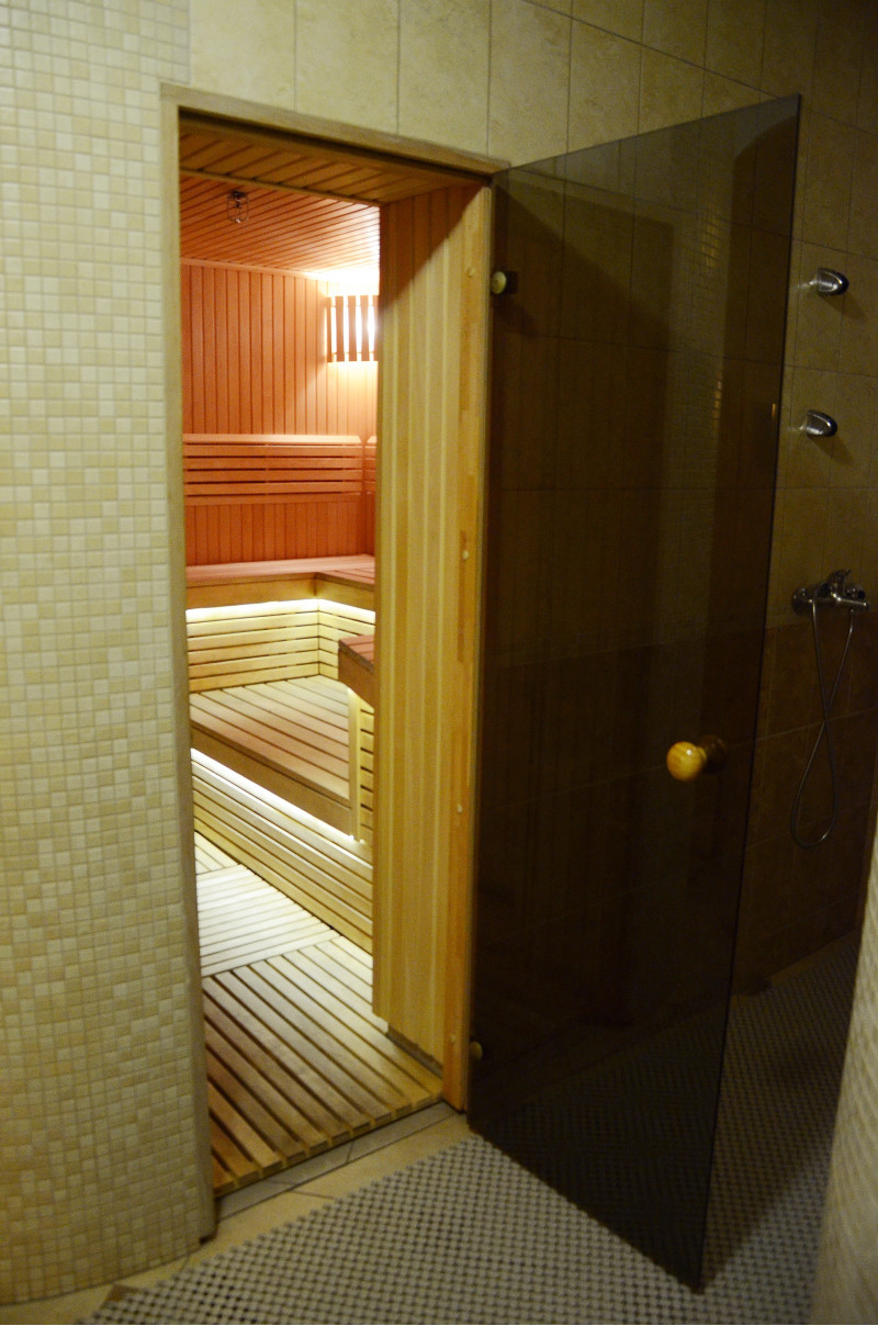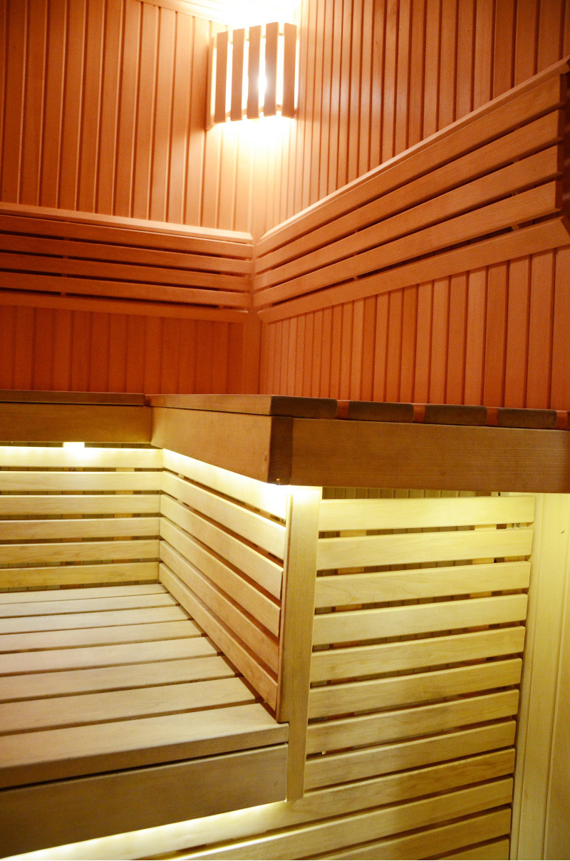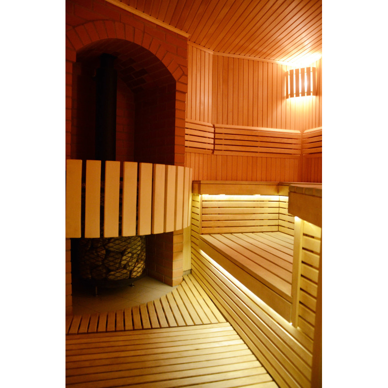 Die Wände und Bänke der Sauna sind aus hochwertigster Lindenholzvertäfelung, die sich durch ihre helle, schöne Farbe auszeichnet und ein angenehmes natürliches Aroma verströmt. Auch Leuchtenabdeckungen, Rückenlehnen und ein originaler Schutzzaun um die Heizung sind aus Holz.