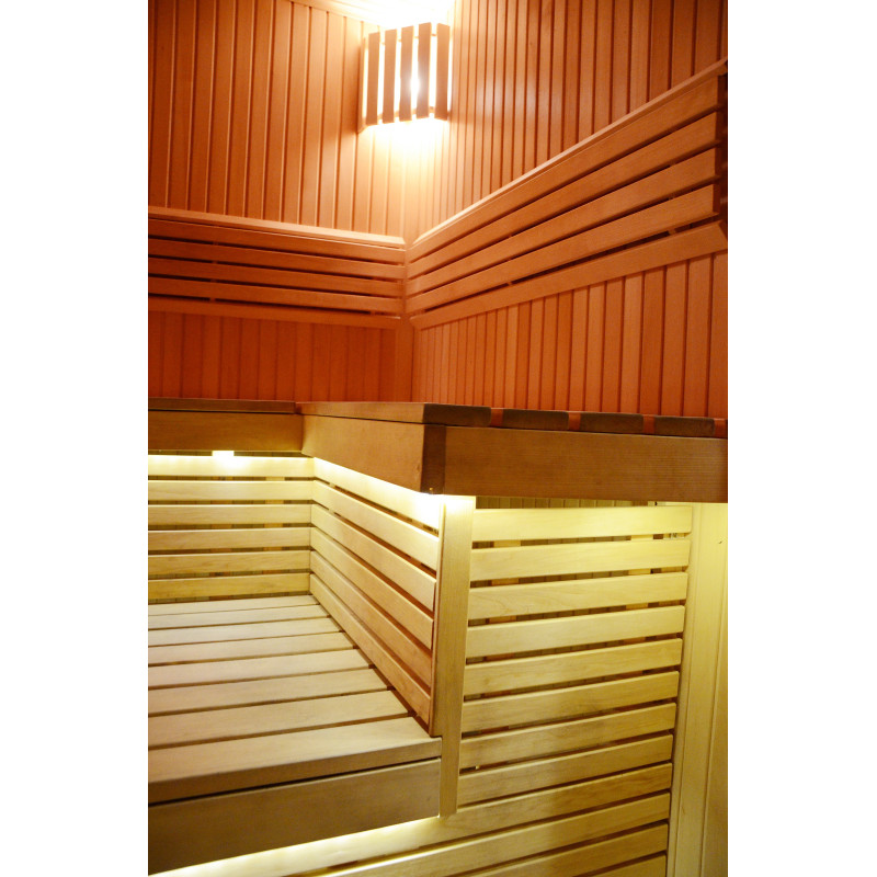Beleuchtung - 2 Harvia-Leuchten in den oberen Ecken, weiße warme LED-Beleuchtung unter den Bänken.