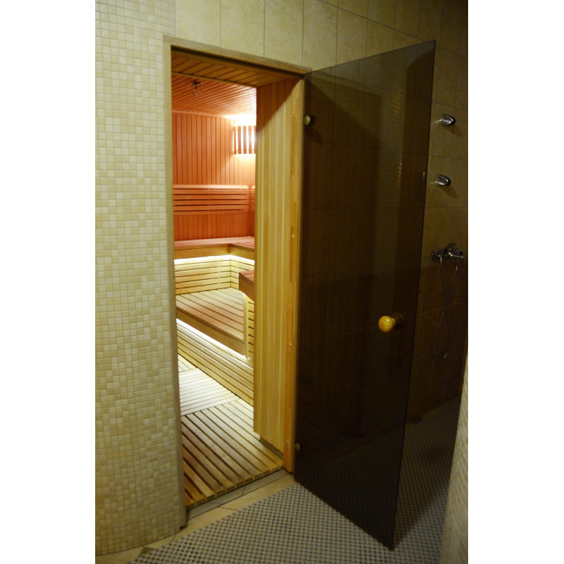 Tür aus gehärtetem getöntem Glas, mit rundem Holzgriff, Rahmen aus Espe.
