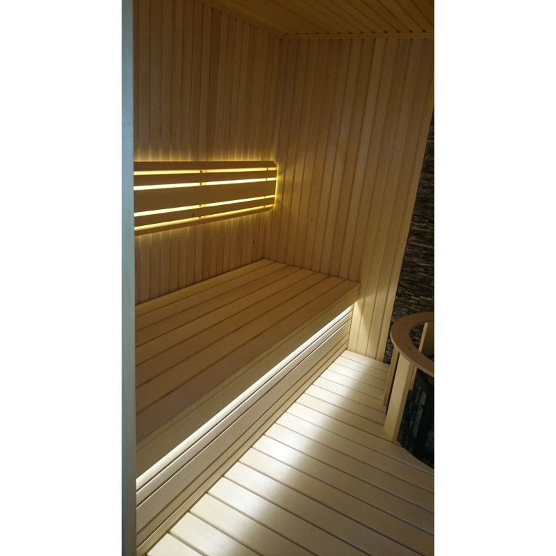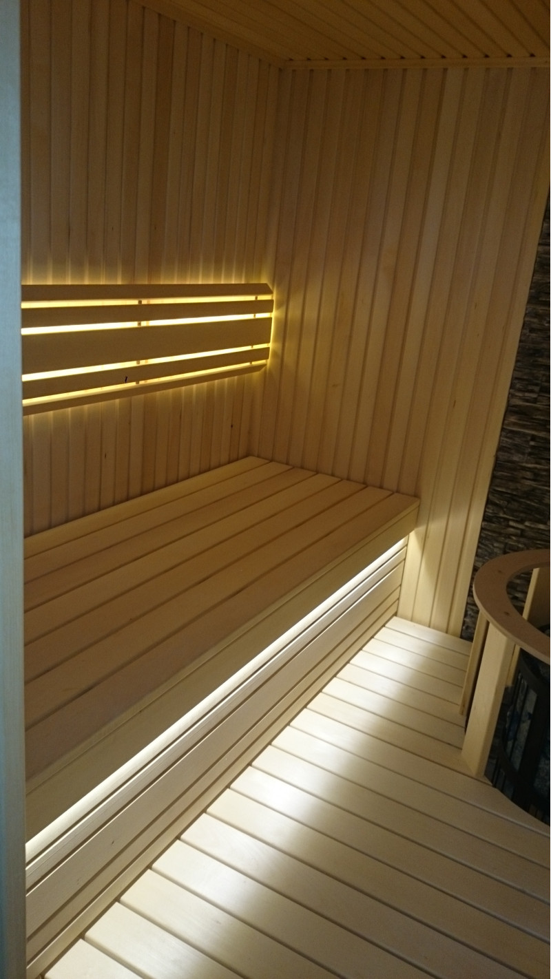 Beleuchtung schafft die größte Gemütlichkeit in der Sauna. In diesem Fall wird eine warmweiße LED-Beleuchtung in den Rückenlehnen und unter den Sitzbänken installiert.