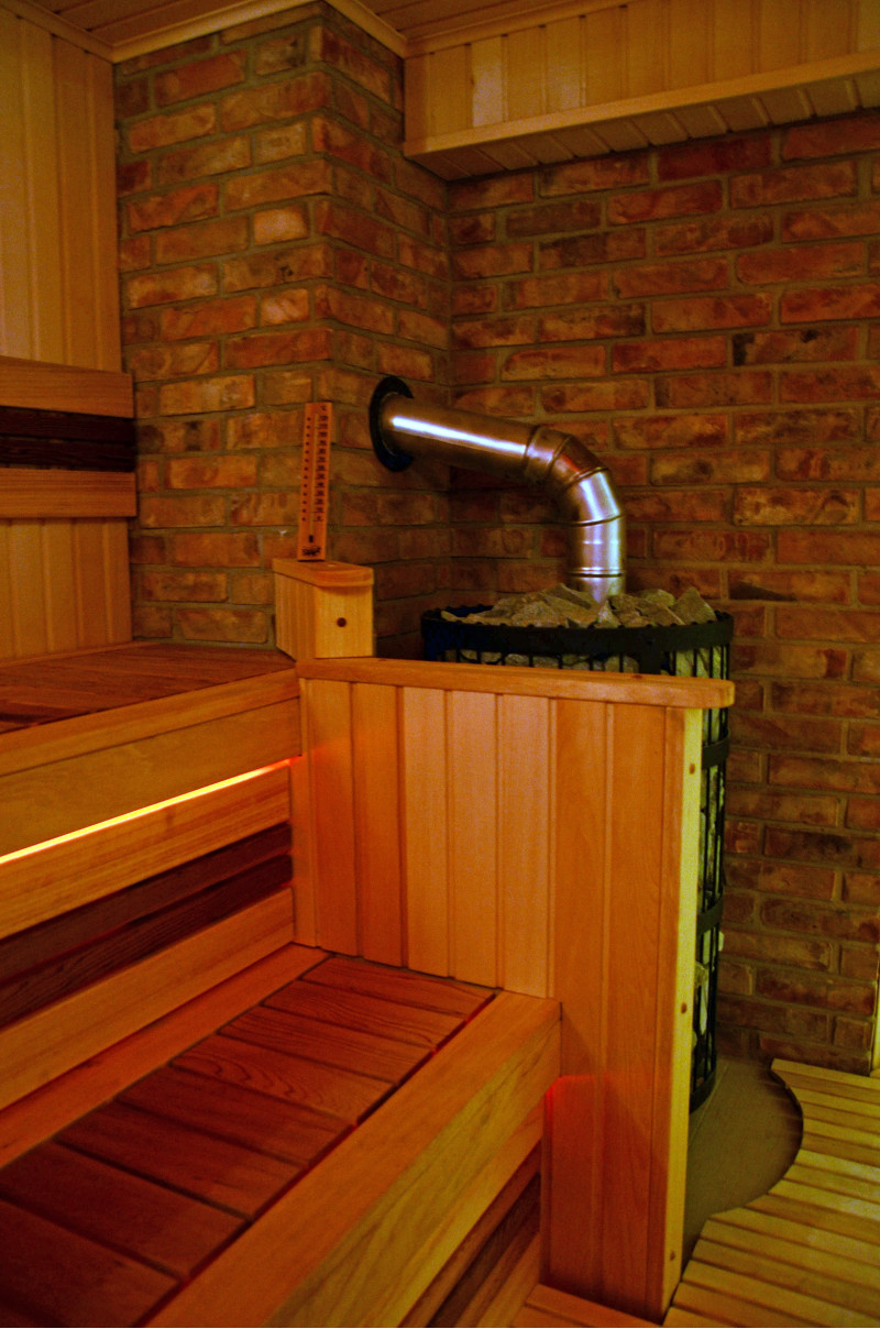 Bänke sind aus afrikanischem Abachi- und kanadischem Zedernholz gefertigt. Dieses Holz heizt sich am wenigsten auf, daher ist es schön, auf solchen Bänken zu sitzen. Die Bänke sind geräumig und es ist bequem, sich in der Sauna im Sitzen oder Liegen zu sonnen.