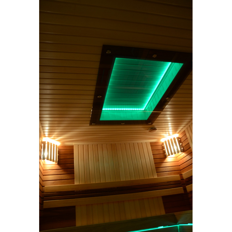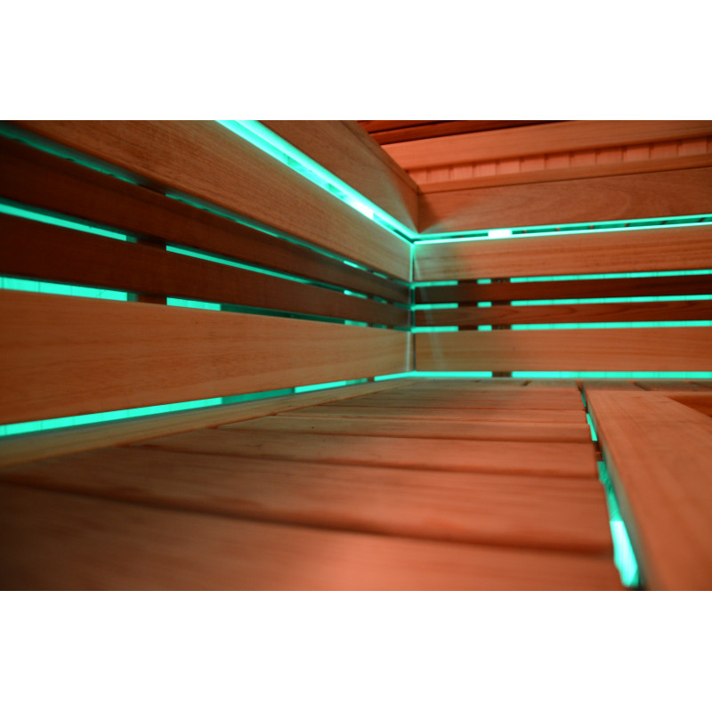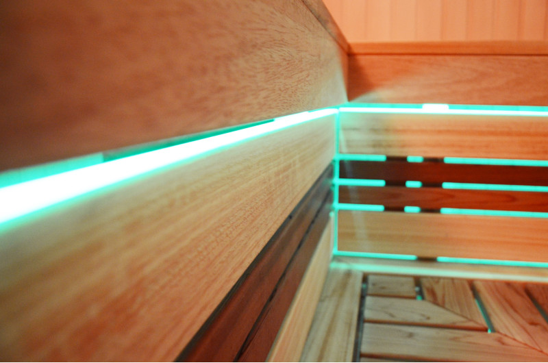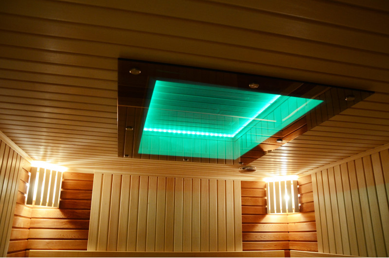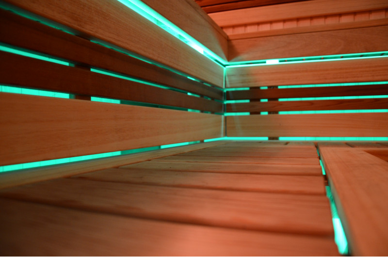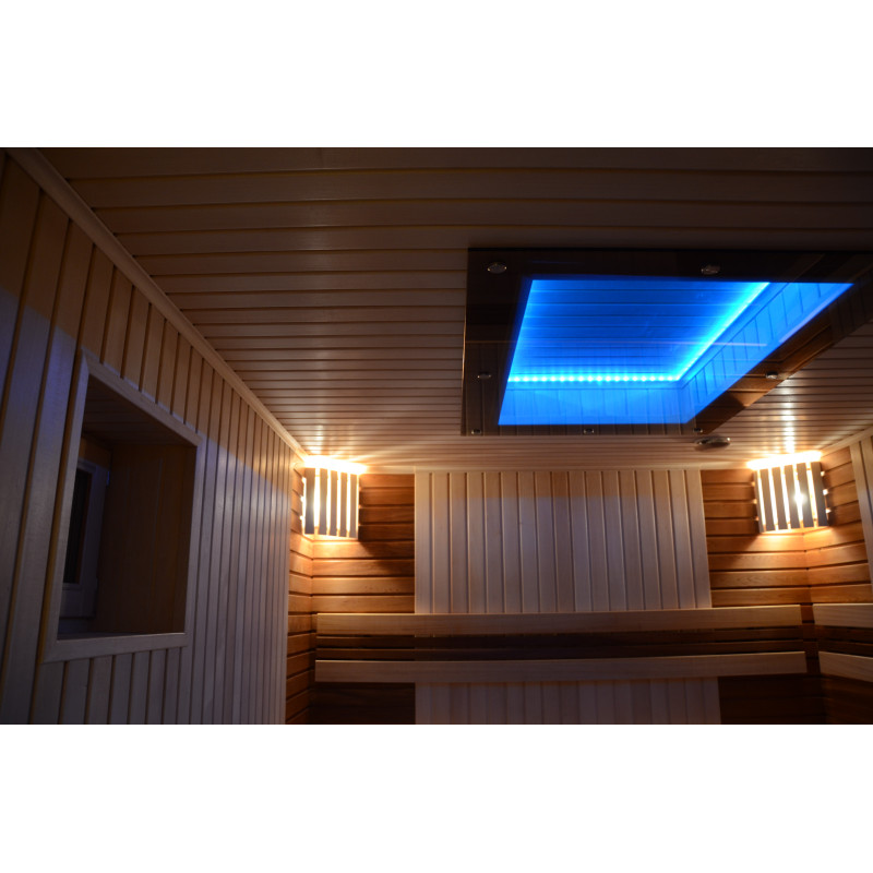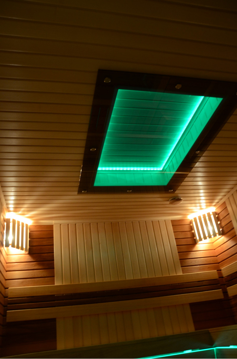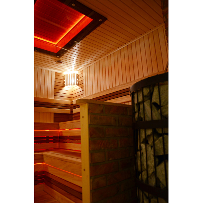 An der Decke und unter den Bänken - LED-RGB-Farbbeleuchtung, deren Farben geändert werden können, um die richtige Atmosphäre und Stimmung zu schaffen. Wandbeleuchtung - LED-Lampen in warmer Farbe weiß mit Holzabdeckungen. Die Abdeckungen helfen, das Licht zu dimmen und der Sauna mehr Gemütlichkeit zu verleihen. Außerdem schützt es die Leuchten vor Wasser, Dampf und Hitze.