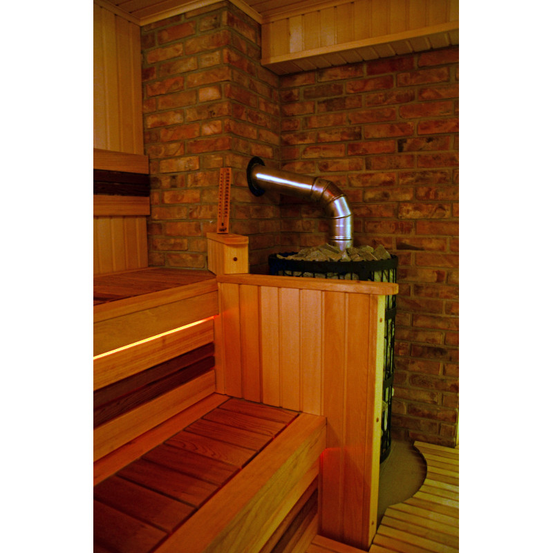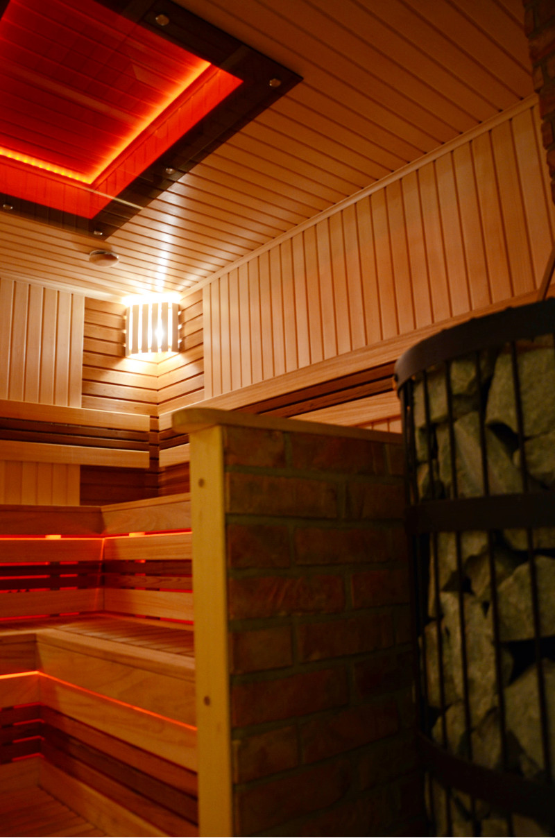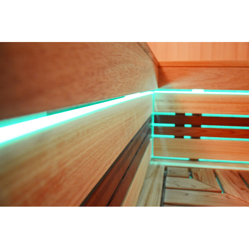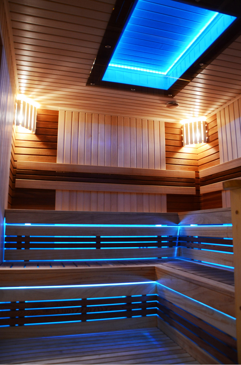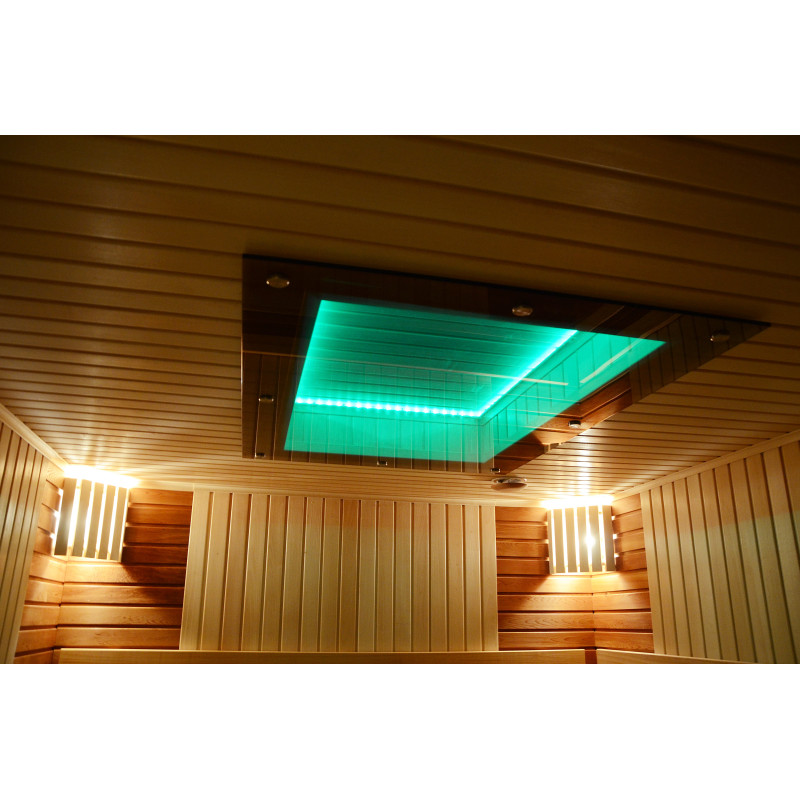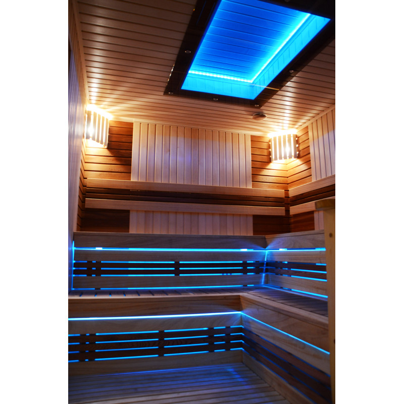An der Decke und unter den Bänken - LED-RGB-Farbbeleuchtung, deren Farben geändert werden können, um die richtige Atmosphäre und Stimmung zu schaffen. Wandbeleuchtung - LED-Lampen in warmer Farbe weiß mit Holzabdeckungen. Die Abdeckungen helfen, das Licht zu dimmen und der Sauna mehr Gemütlichkeit zu verleihen. Außerdem schützt es die Leuchten vor Wasser, Dampf und Hitze.