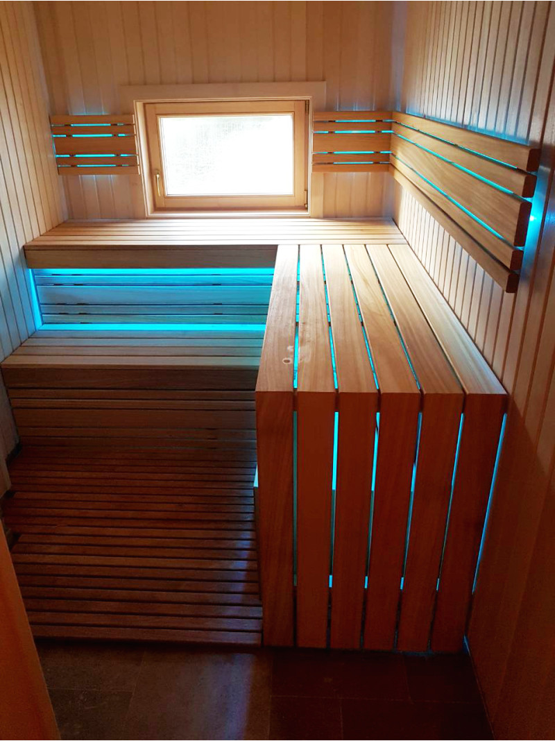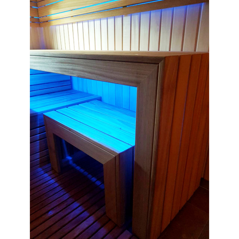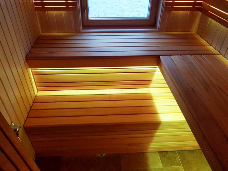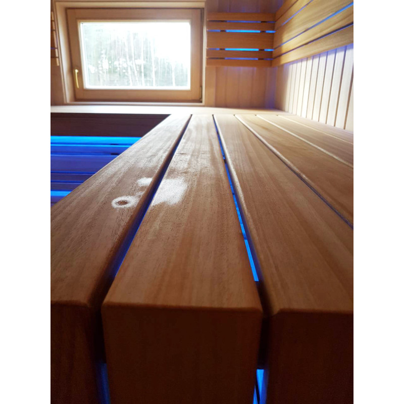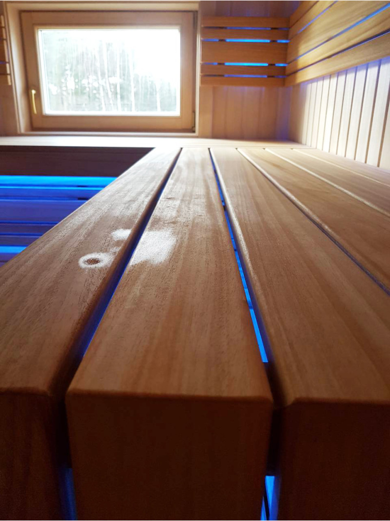 Die Innenholzdetails und Bänke der Sauna sind aus afrikanischem Abachi-Holz. Aufgrund seiner Struktur ist dieses Holz weich und sehr wärmearm, wodurch es sich sehr gut für den Einbau von Saunabänken eignet.