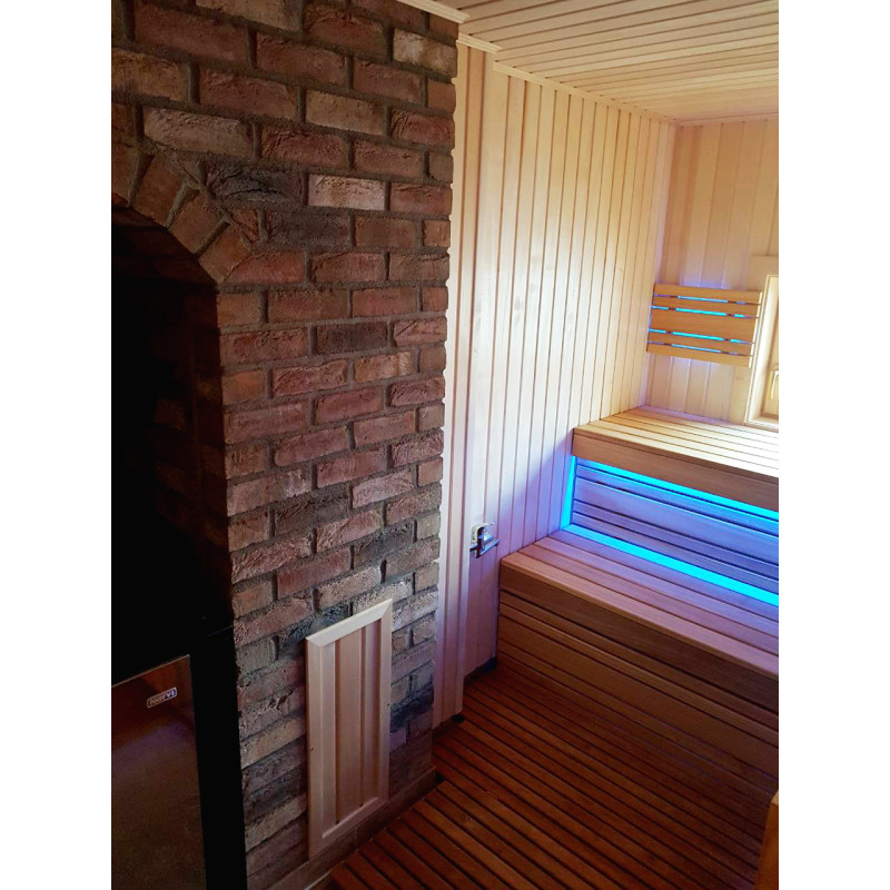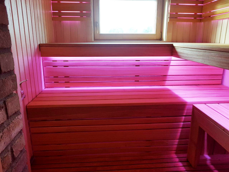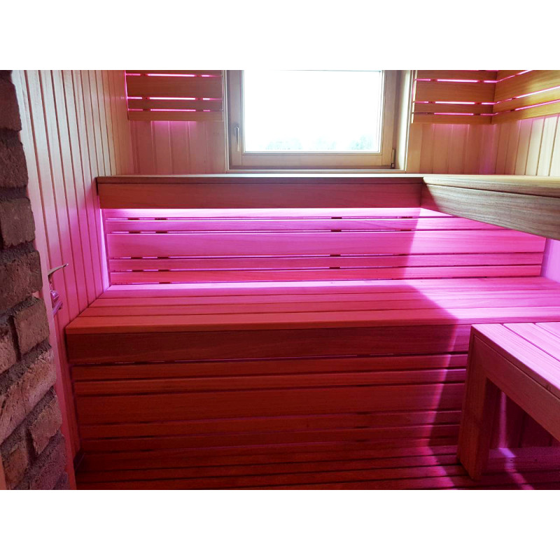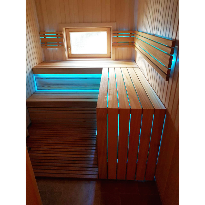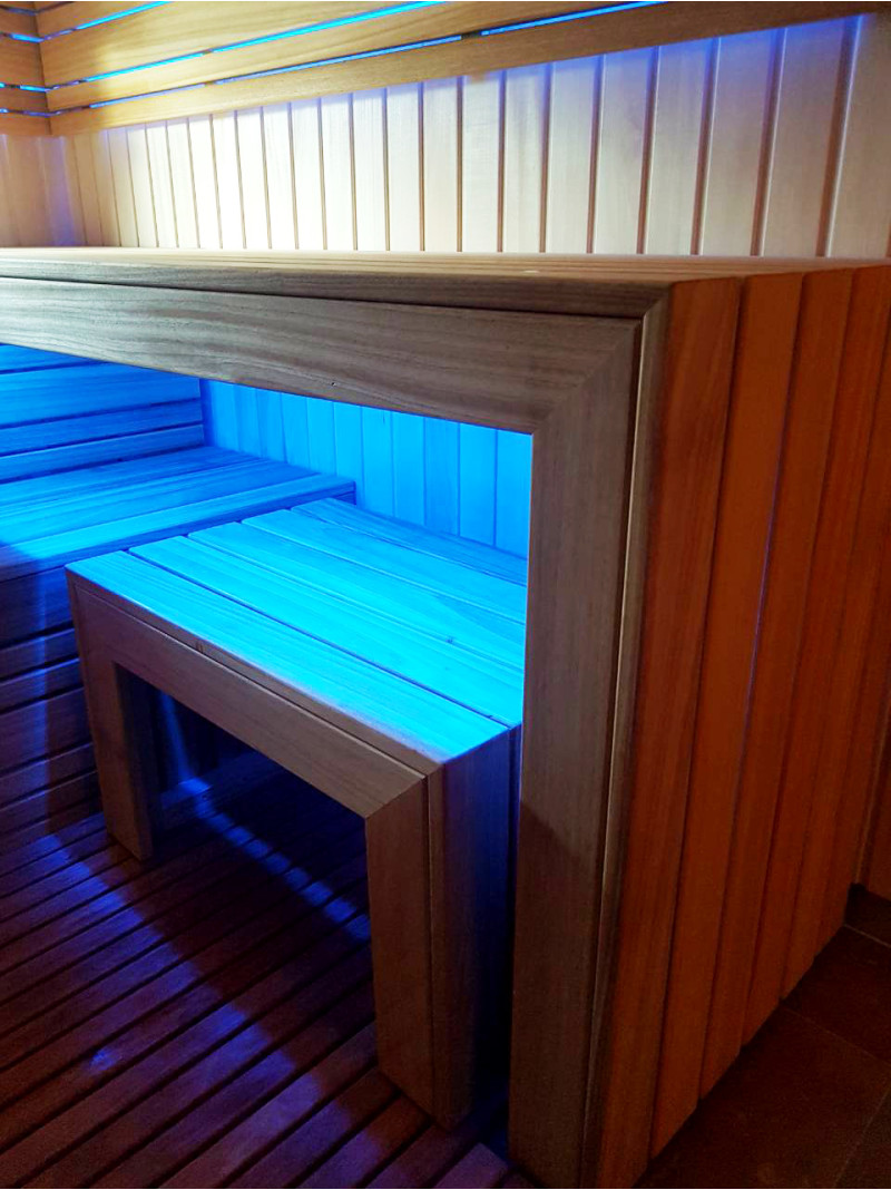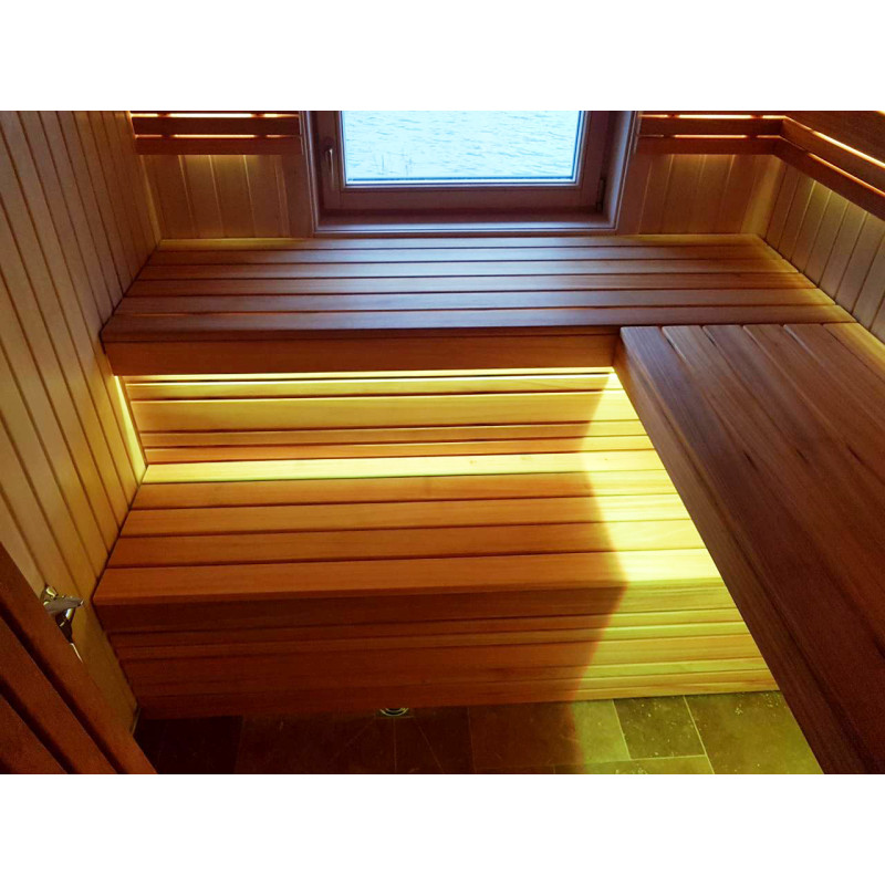 Die Innenholzdetails und Bänke der Sauna sind aus afrikanischem Abachi-Holz. Aufgrund seiner Struktur ist dieses Holz weich und sehr wärmearm, wodurch es sich sehr gut für den Einbau von Saunabänken eignet.