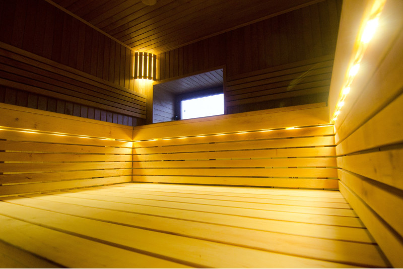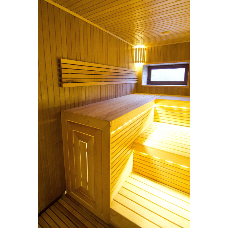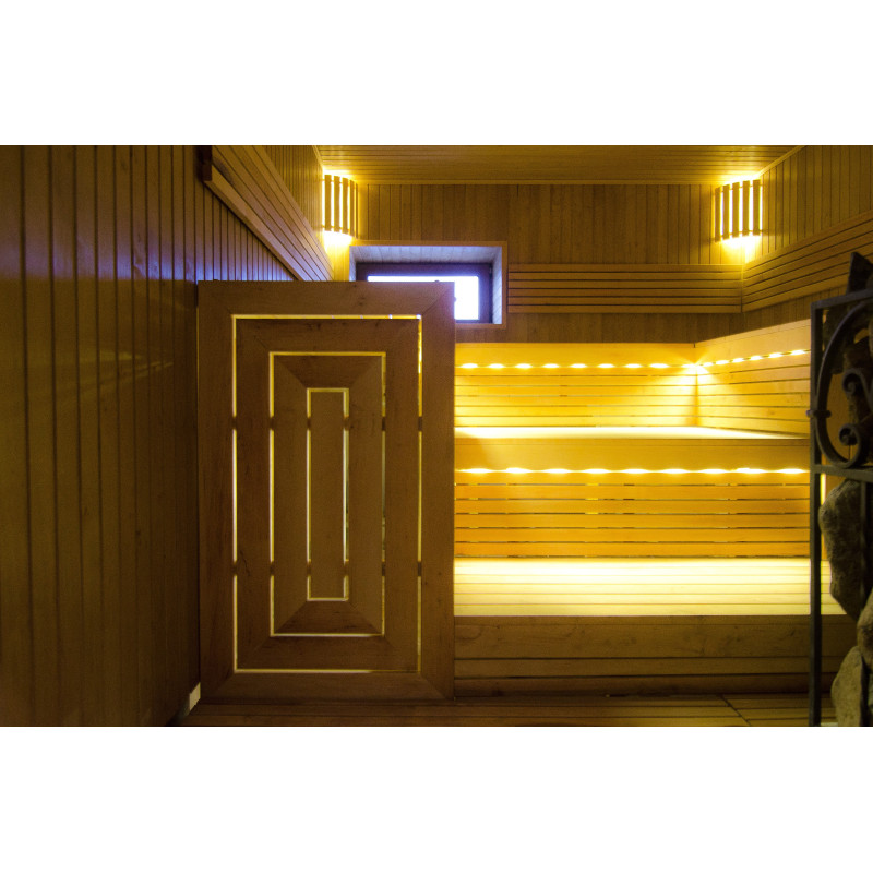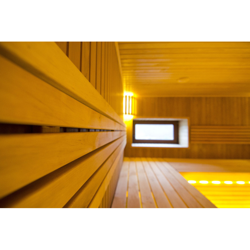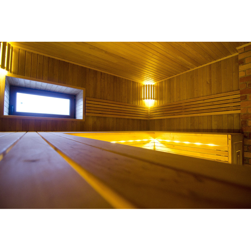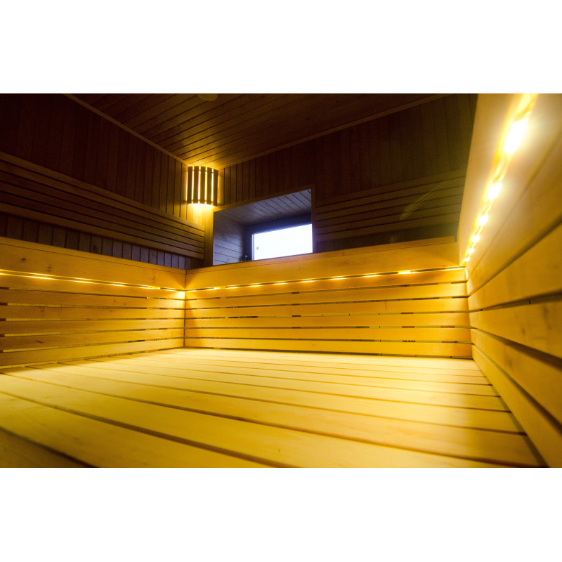 Die Sauna ist mit warmfarbiger LED-Beleuchtung unter den Liegen und Wandleuchten mit Holzabdeckungen ausgestattet.