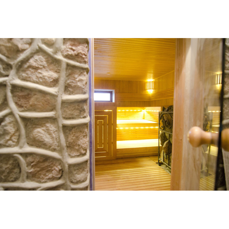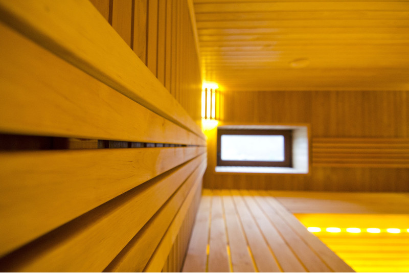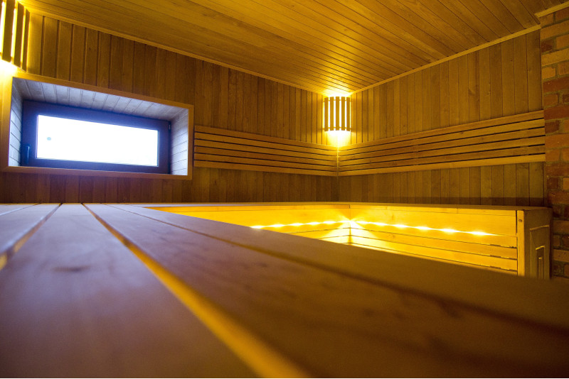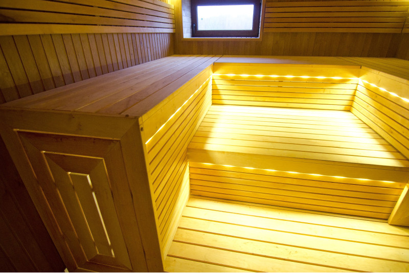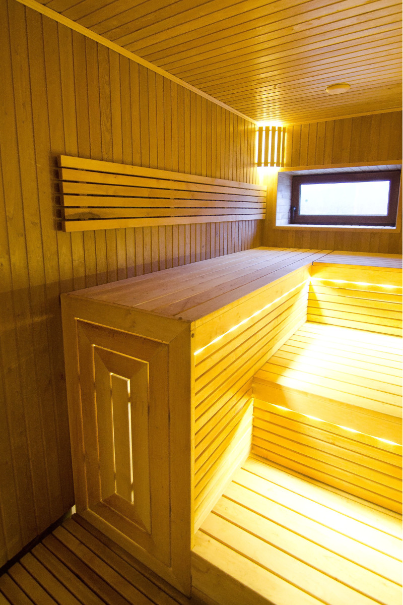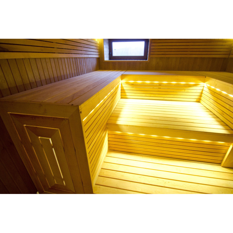 Die Sauna ist mit warmfarbiger LED-Beleuchtung unter den Liegen und Wandleuchten mit Holzabdeckungen ausgestattet.