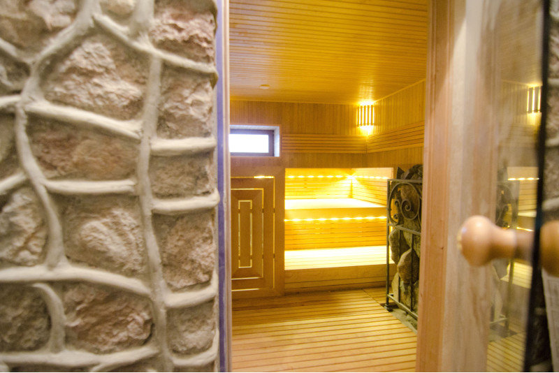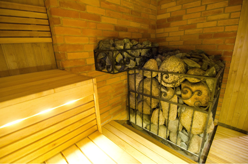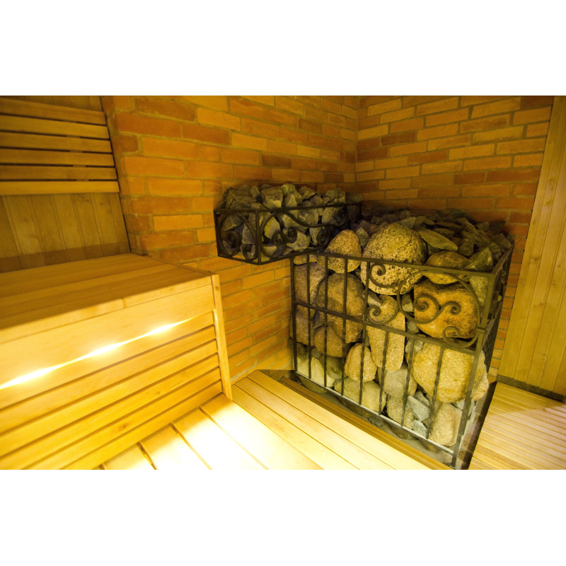 Kretinga verfügt über eine Sauna von exklusivem Design, bei der ein stilistischer Abschluss der Bänkeenden und ein Schmiedeofen ein besonderes Bild erzeugen.