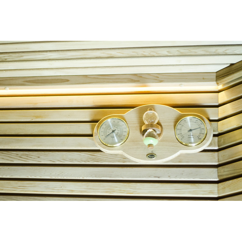 Saunazubehör: Eimer- und Schöpfkellen-Set, Holzthermometer mit Hygrometer und Sanduhr.