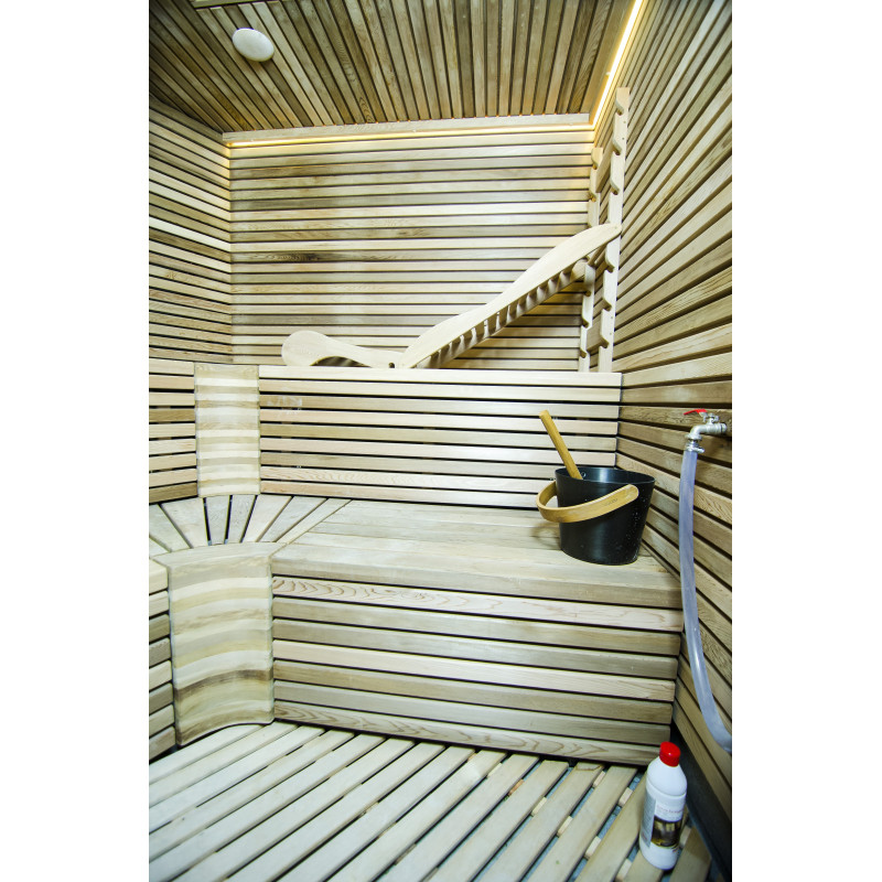 Beleuchtung - warmweißer LED-Streifen. Die Decke ist mit einem polierten Edelstahlblech ausgestattet, das mit einem Lichtsystem "Starry Sky" ausgestattet ist. Es ist eine ideale Beleuchtungslösung für Ihre Sauna oder andere Dunkelkammern.