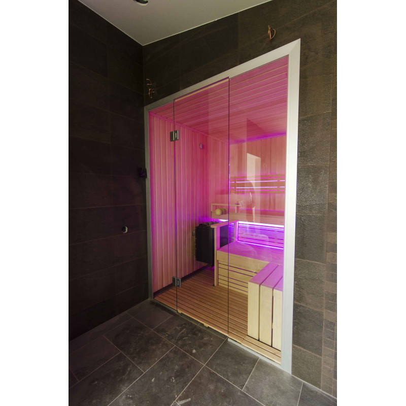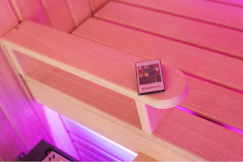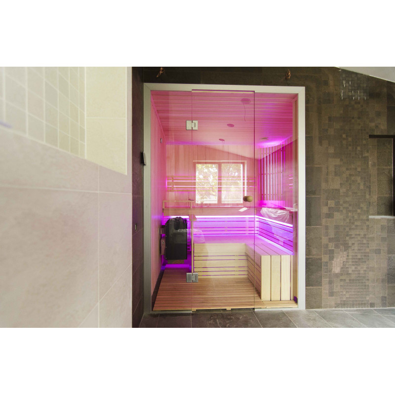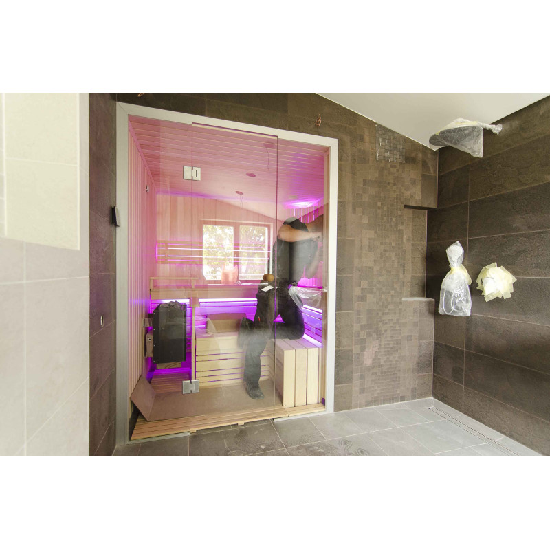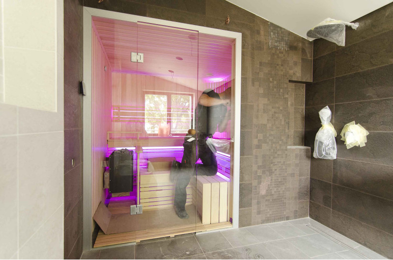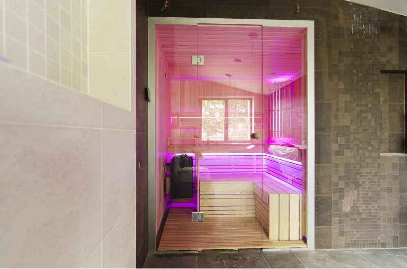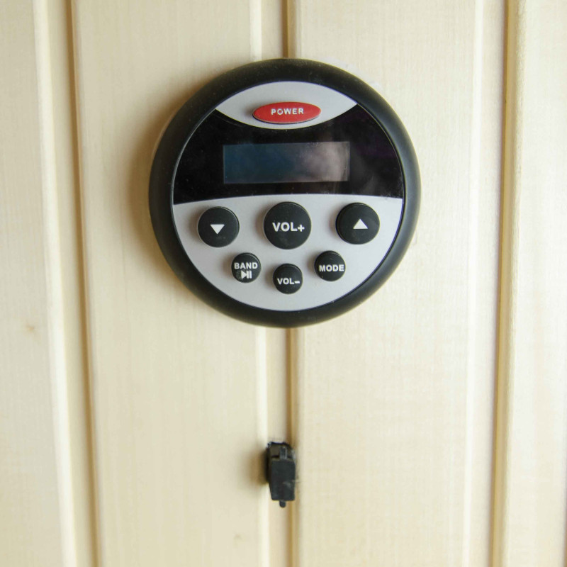 In Melnrage wurde ein modernes Saunaprojekt zur privaten Nutzung realisiert. Im Badezimmer gab es eine Ecke für die Freuden einer Familiensauna. Die großen Fenster der Saunavitrine öffnen durch das Badfenster den Blick in die Natur, sorgen für eine konstante Lichtquelle und vergrößern optisch den Raum der nicht sehr großen Saunakabine. Neben der tollen Aussicht wird das Saunavergnügen durch die Sound - eingebaute Musikanlage gesteigert. Der Mediaplayer ist speziell für den Einsatz in einer heißen, feuchten Sauna angepasst. Es verfügt über einen USB-Anschluss, Bluetooth, Radio, LCD-Bildschirm, Gummi-Bedientasten. Die Lautsprecher sind zudem beständig gegen Saunafeuchtigkeit, Korrosion und Temperatur.