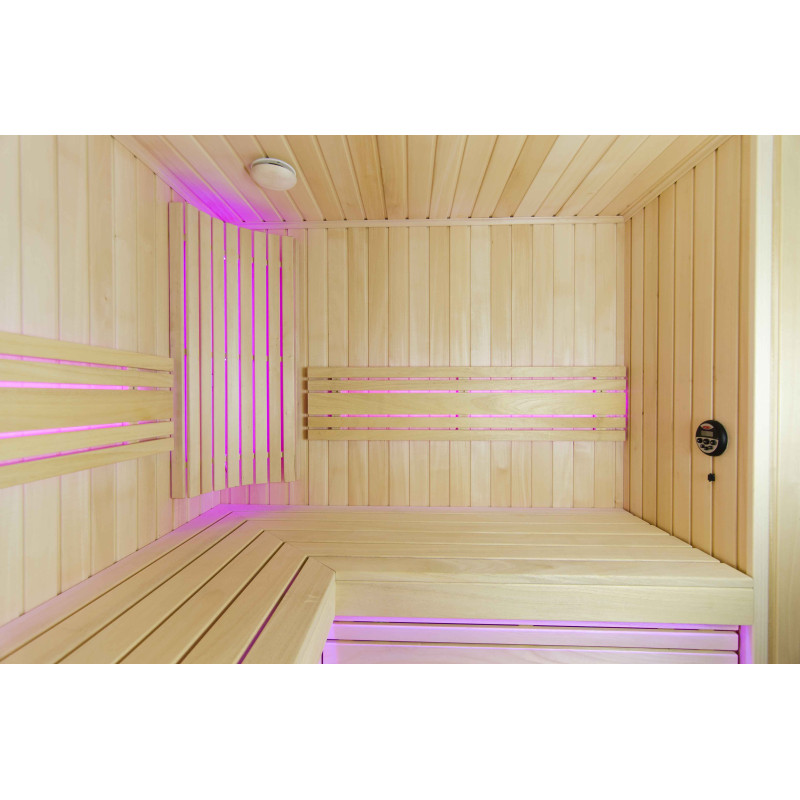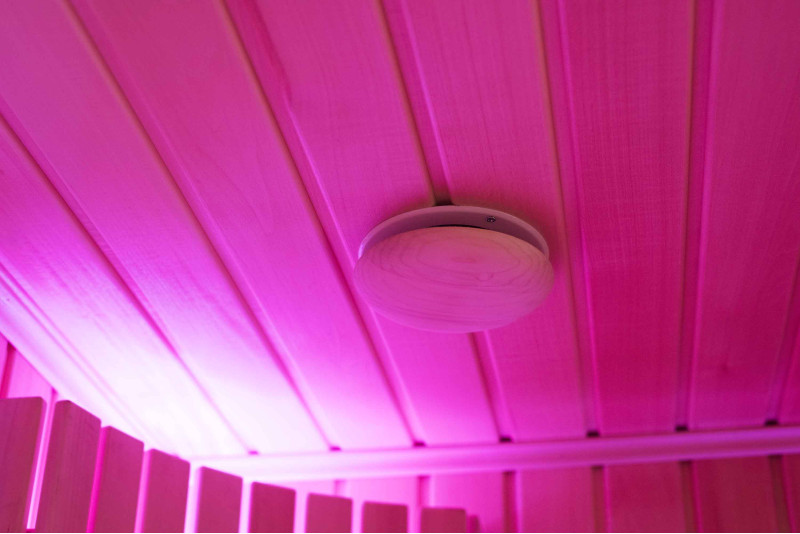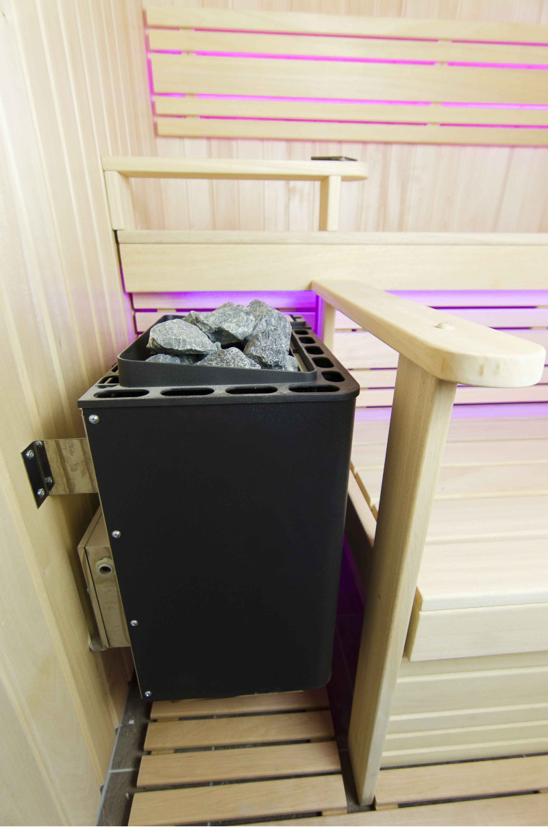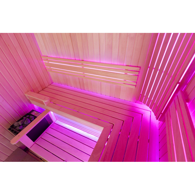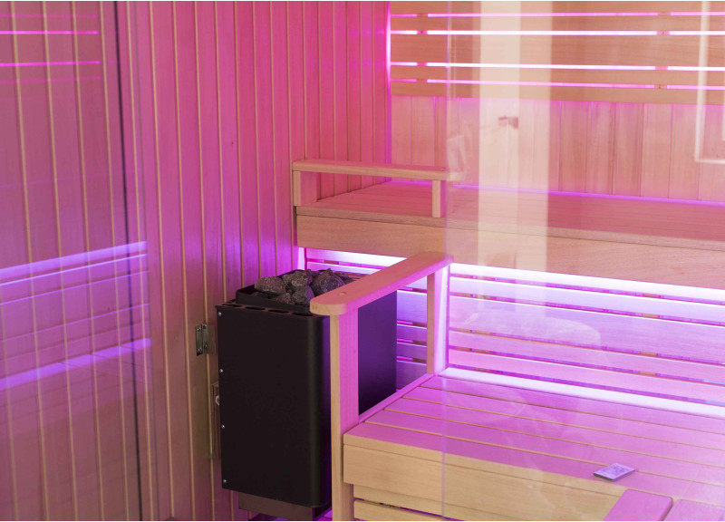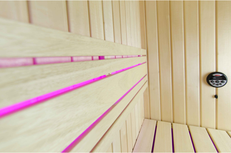 Das Innere der Sauna ist aus hochwertigstem Lindenholz, die Solarien aus Abachi-Holz - nicht heizend und perfekt für die Sauna.