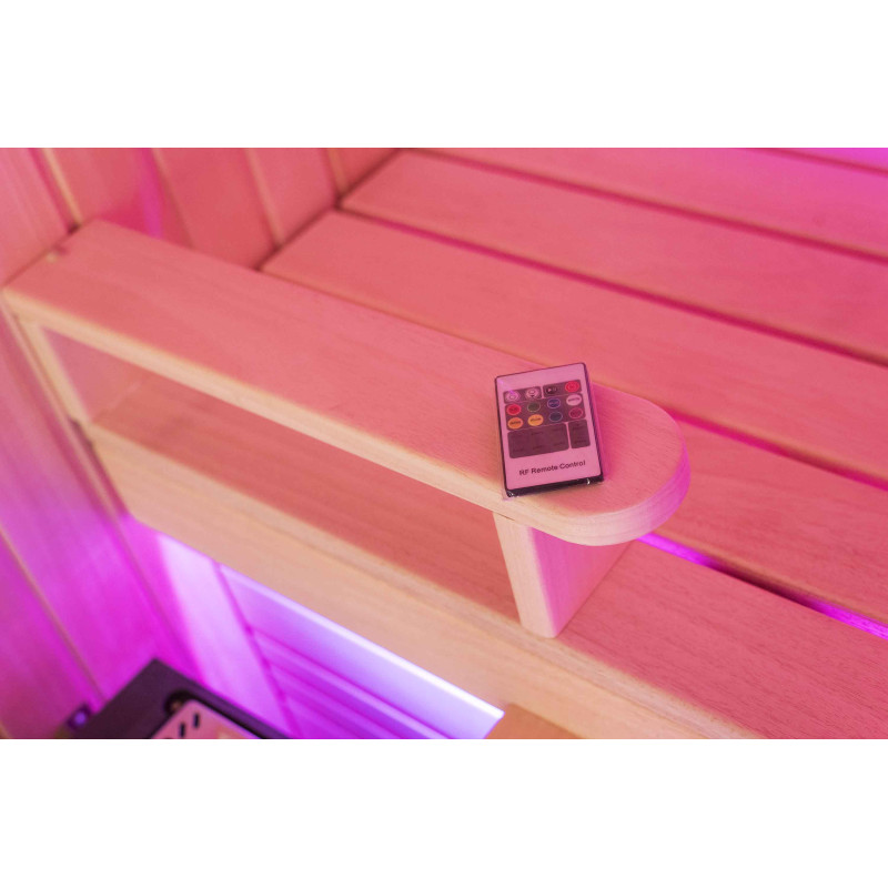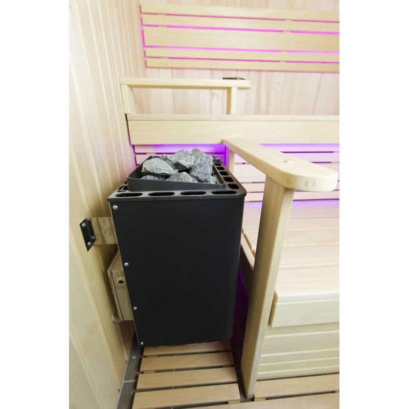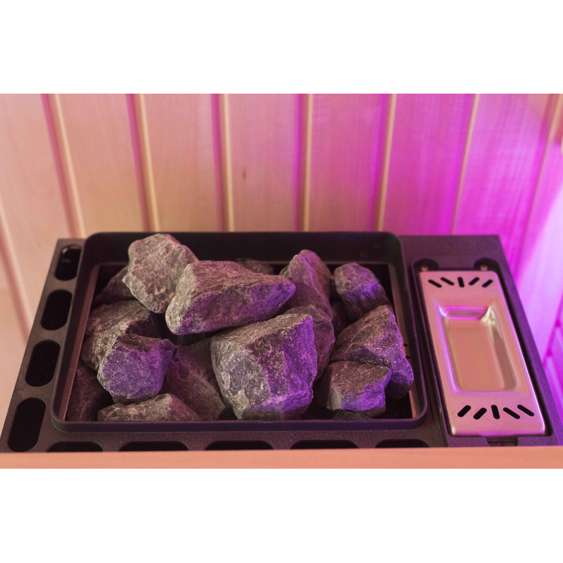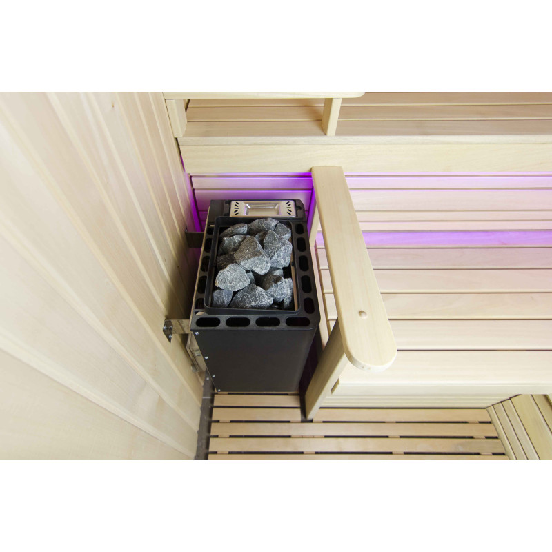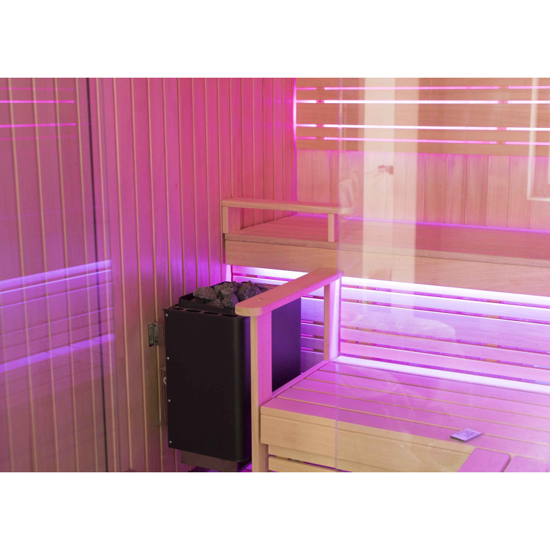Elektroheizgerät Modell - EOS Bi-O Thermat mit Dampfgenerator. Die Heizung wird an die Wand gehängt und über ein separates Bedienfeld gesteuert - Harvia Xenio Combi.