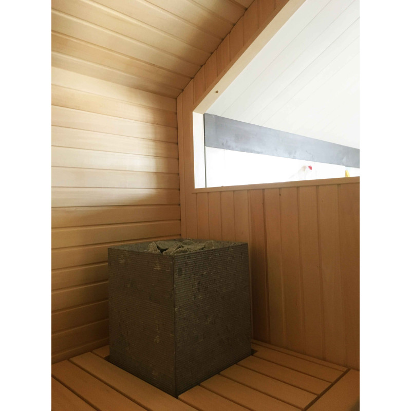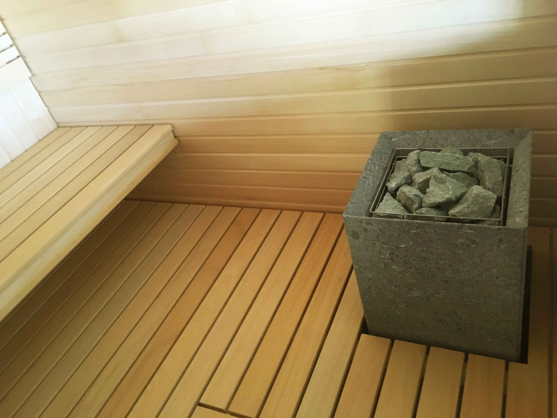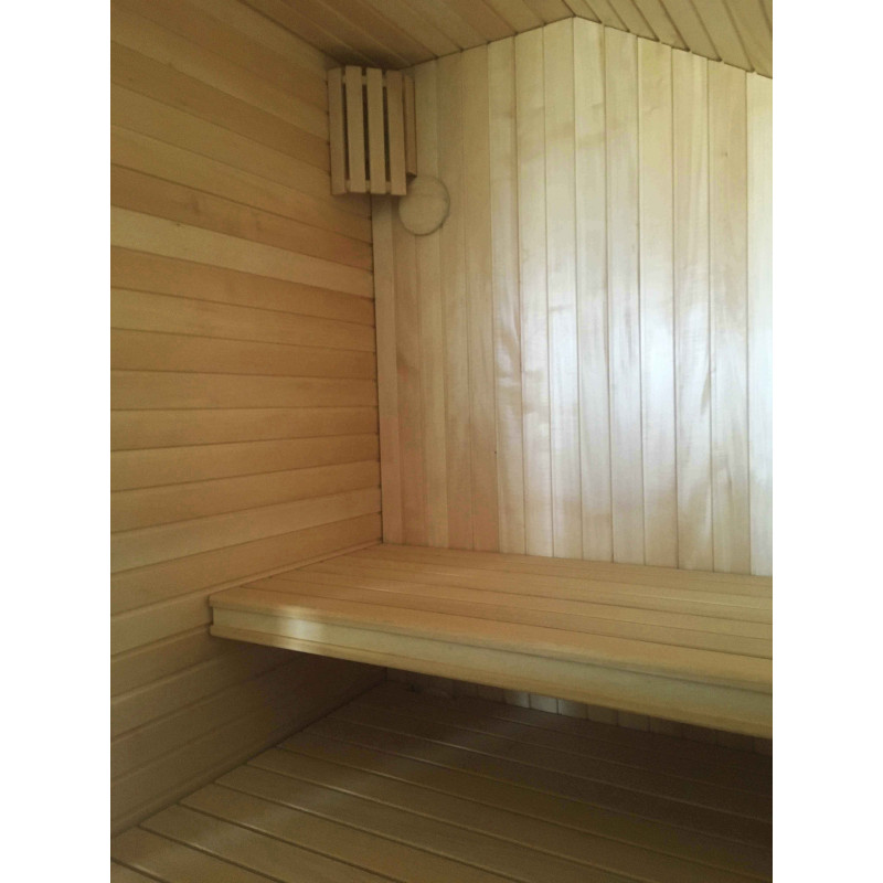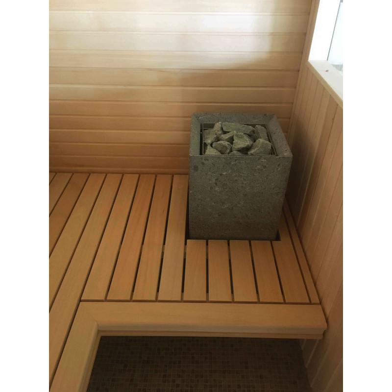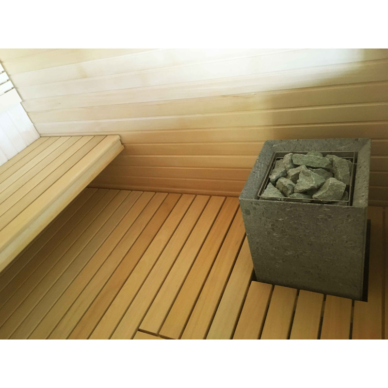 Die Wände und Decken der Sauna sind aus Lindenholz. Lindenverkleidung verleiht der Sauna mehr Licht und verströmt einen angenehmen Holzgeruch. Für die Sitzbänke, Rückenlehnen und den Zaun um die Heizung wurde eine hochwertige Abachi-Holzverkleidung gewählt. Dieses weiche und unbeheizte Holz ist eine gute Wahl für Bänke, Stützen, bei denen das Holz die Haut berührt, ohne sie zu verbrennen. Das sorgt für Komfort und eine tolle Erholung in der Sauna. Bänke, Stützen und Wände sind lackiert, komplett vorbereitet für den Dauereinsatz.
