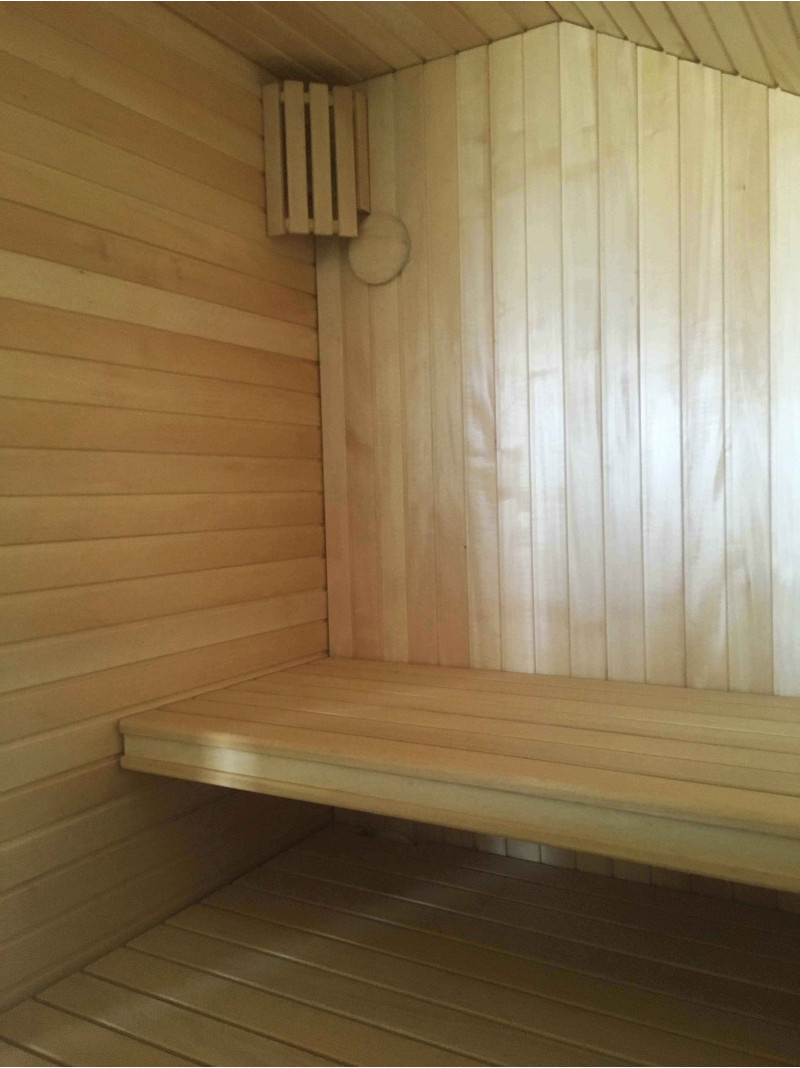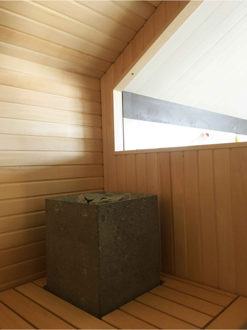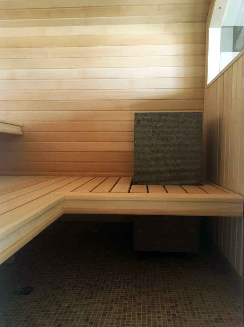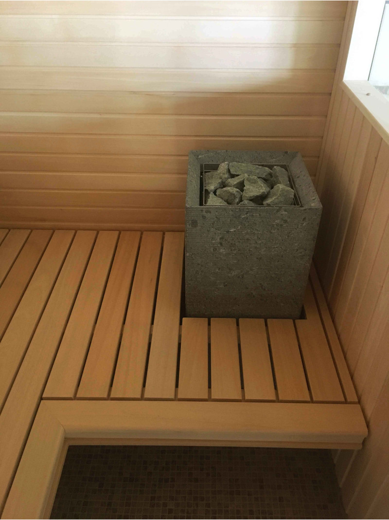 Die Wände und Decken der Sauna sind aus Lindenholz. Lindenverkleidung verleiht der Sauna mehr Licht und verströmt einen angenehmen Holzgeruch. Für die Sitzbänke, Rückenlehnen und den Zaun um die Heizung wurde eine hochwertige Abachi-Holzverkleidung gewählt. Dieses weiche und unbeheizte Holz ist eine gute Wahl für Bänke, Stützen, bei denen das Holz die Haut berührt, ohne sie zu verbrennen. Das sorgt für Komfort und eine tolle Erholung in der Sauna. Bänke, Stützen und Wände sind lackiert, komplett vorbereitet für den Dauereinsatz.