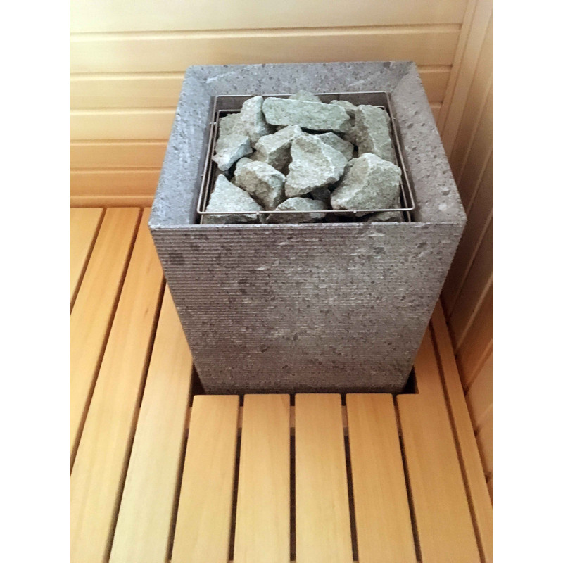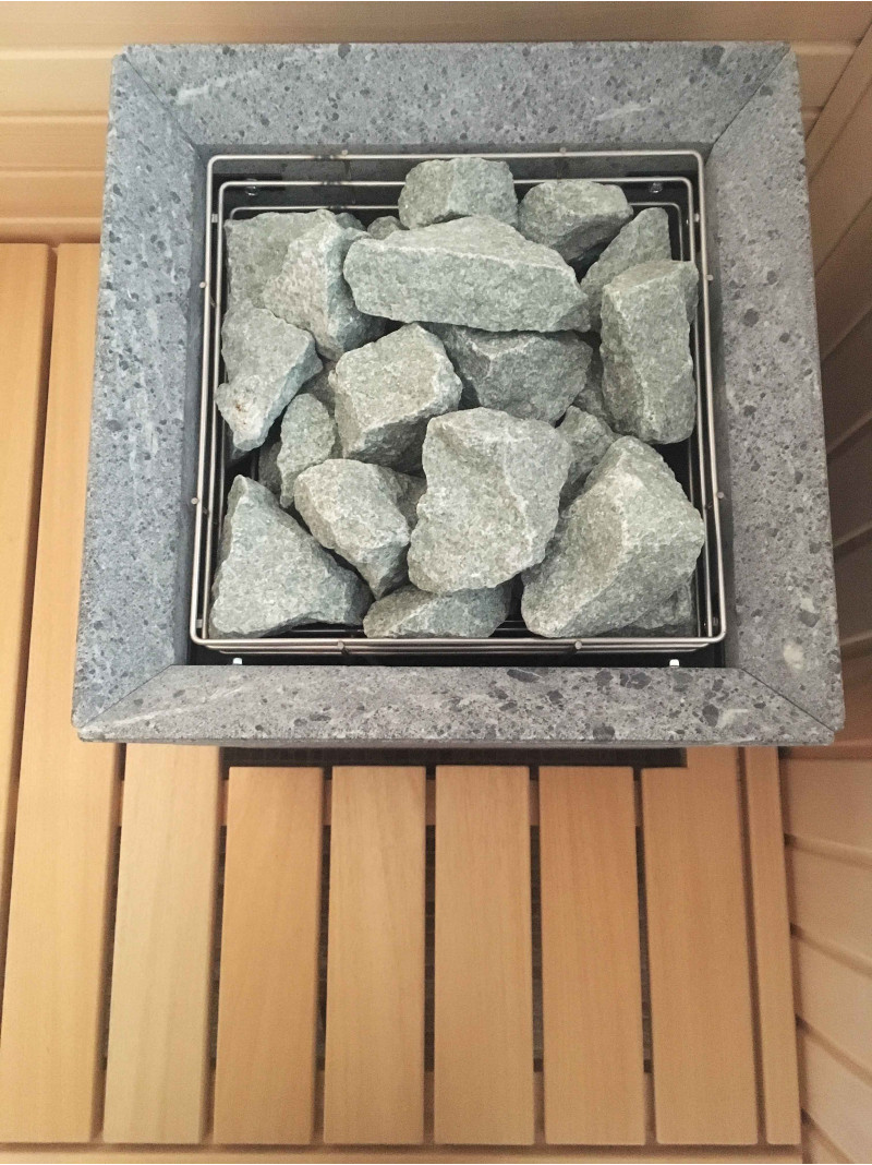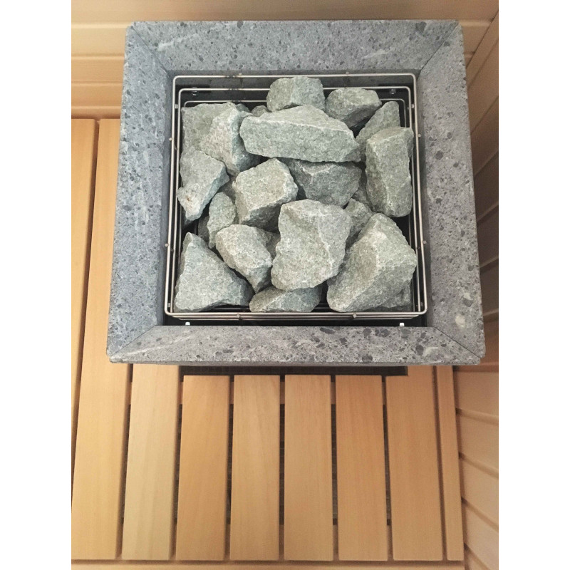 Elektroheizung Tulikivi Tuisku mit Speckstein-Finish. Gesteuert per Fernbedienung. Gefüllt mit einer großen Menge einer Mischung aus Olivindiabas und Jadeitsteinen. Aufgrund der kurzen Sicherheitsabstände zu brennbaren Oberflächen und der stark nicht heizenden Oberfläche des Ofens ist dieser eine gute Wahl für Familien mit Kindern und zur Integration des Ofens in Sitzbänke. Die von Jadeit freigesetzte Energie hat heilende Kräfte bei vielen Krankheiten. Die heilenden Eigenschaften von erhitztem Jadeit werden verstärkt. Das Gießen des Steins mit Wasser verbreitet einen angenehmen Geruch einer sauberen Umgebung in der Sauna und erleichtert das Atmen.