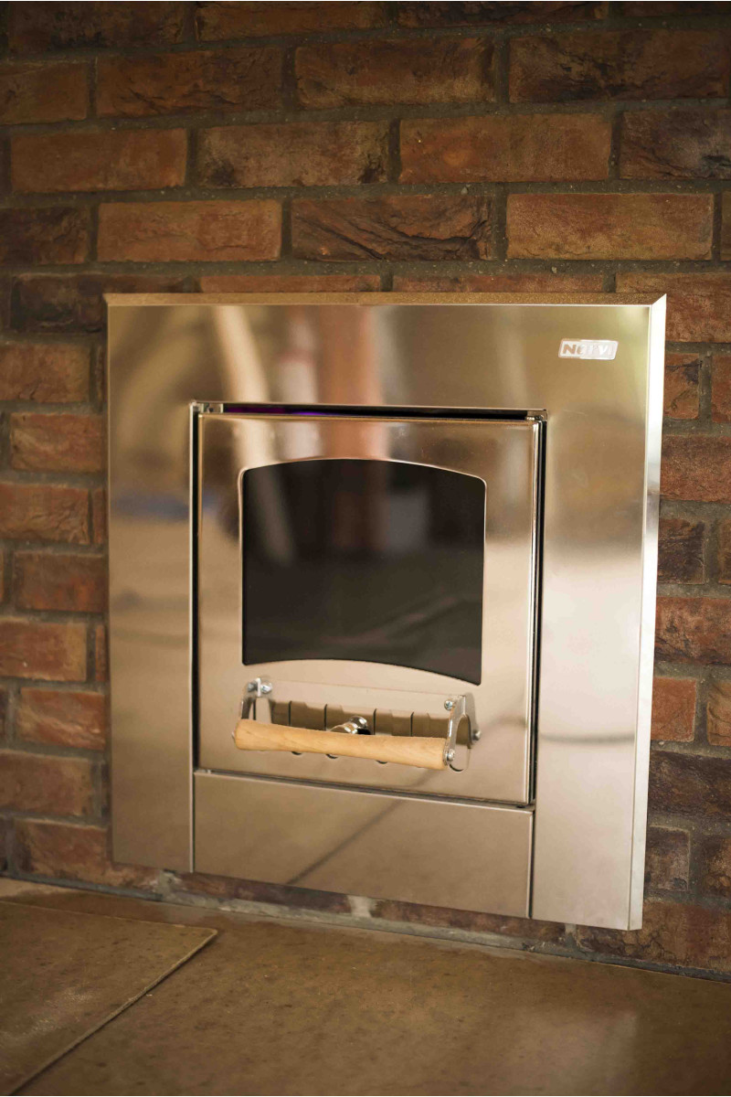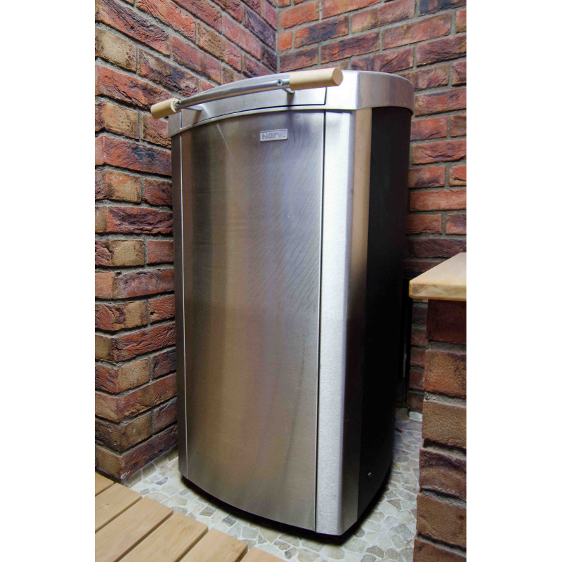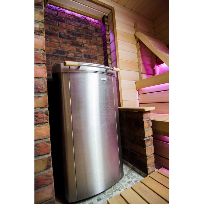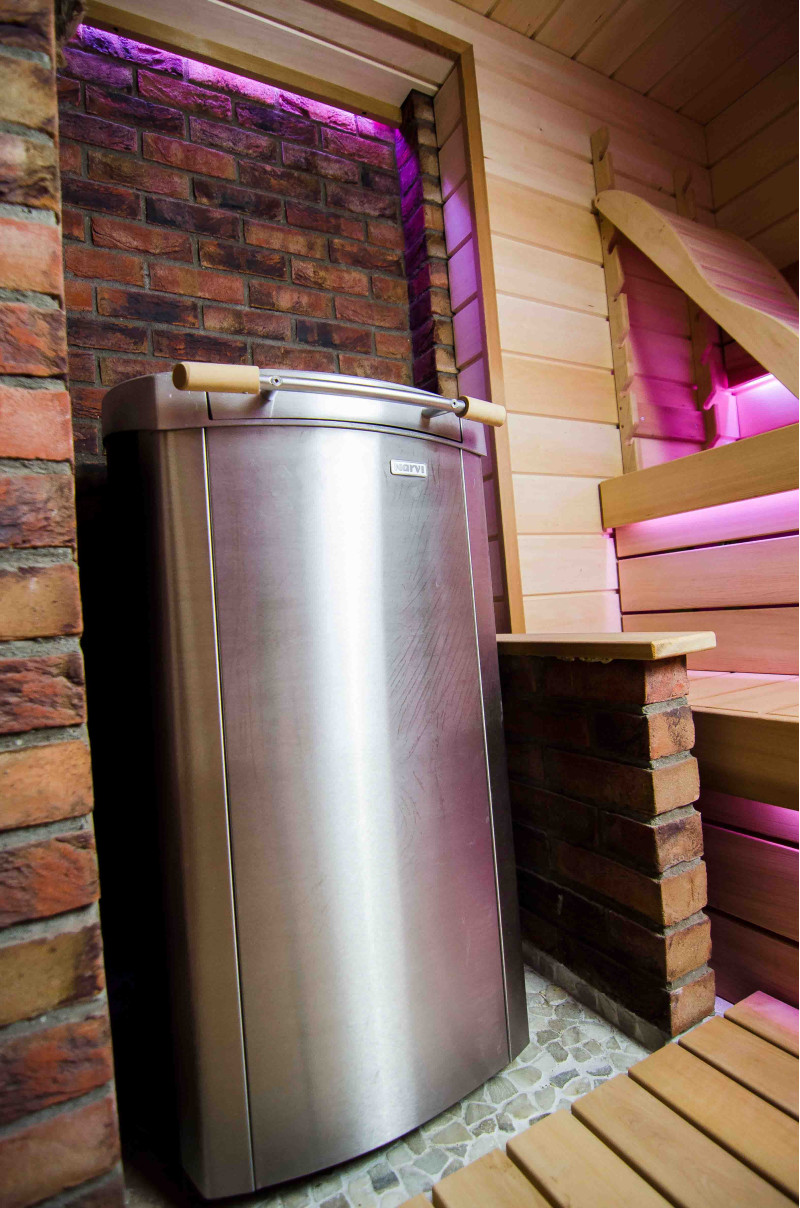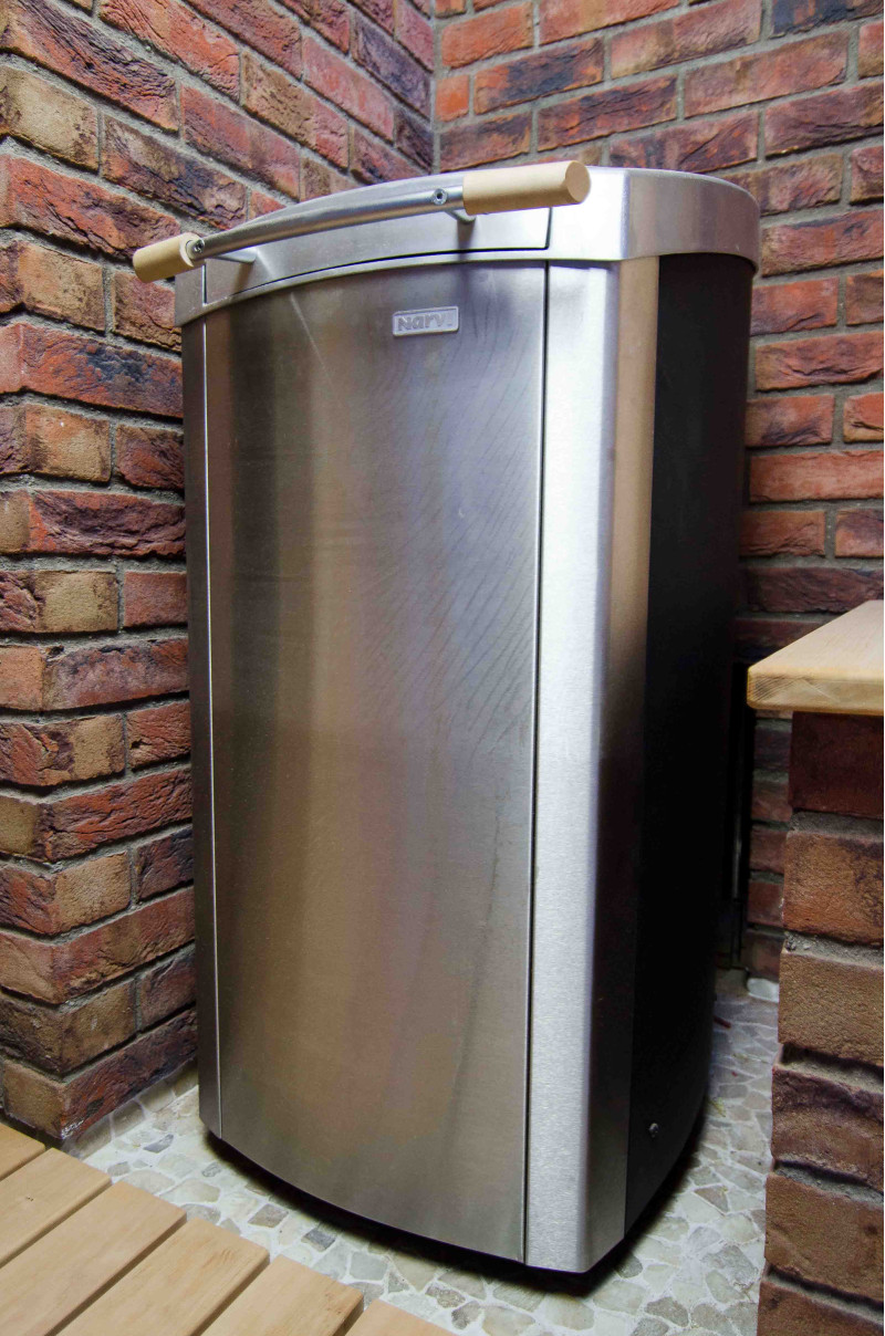 Der Ofen hat ein modernes, minimalistisches Design - Narvi Steam Master Royal mit einem externen Kamin. Für intensiven Gebrauch geeignet, gibt viel Dampf. Während des Aufheizens ist die Haube geschlossen. Die Wärme wird in einer großen Menge Steine (80 kg) unter der Haube gespeichert, ohne die Sauna zu überhitzen und die Luft auszutrocknen. Durch Öffnen des Deckels wird Wasser auf die Steine gegossen. Die Heizung sorgt für gleichmäßige und feuchte Wärme.