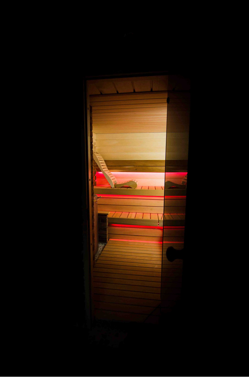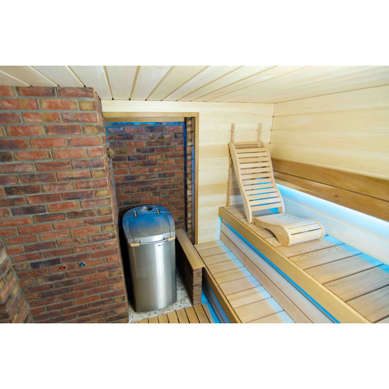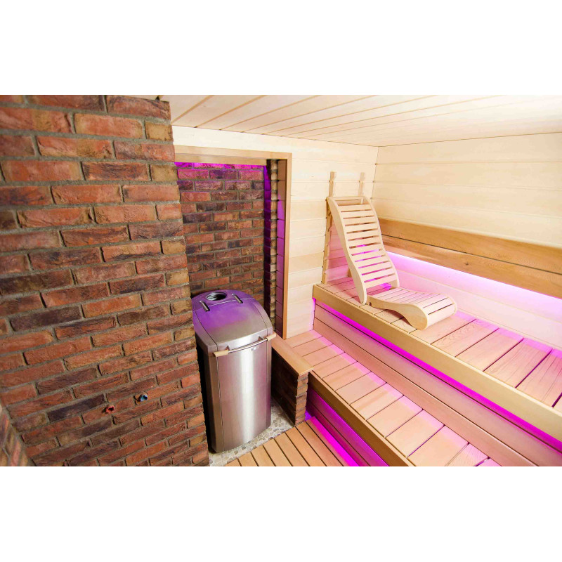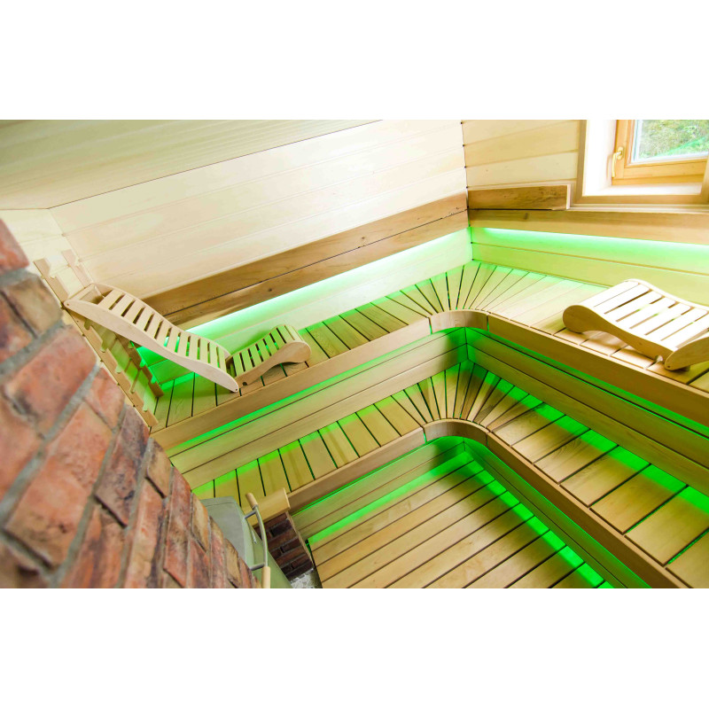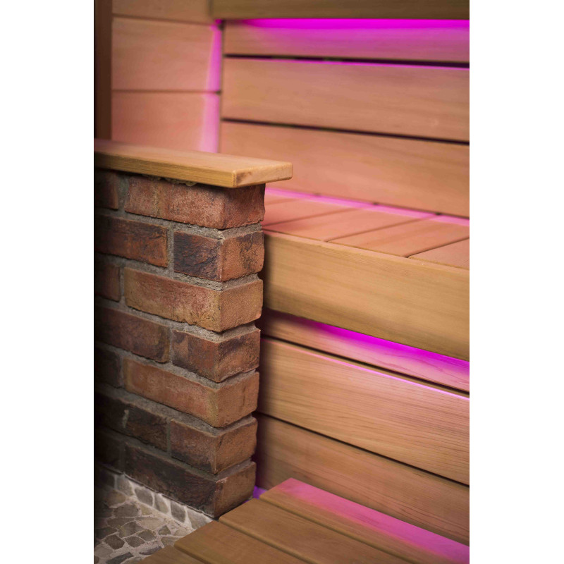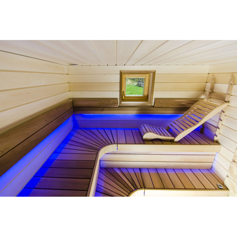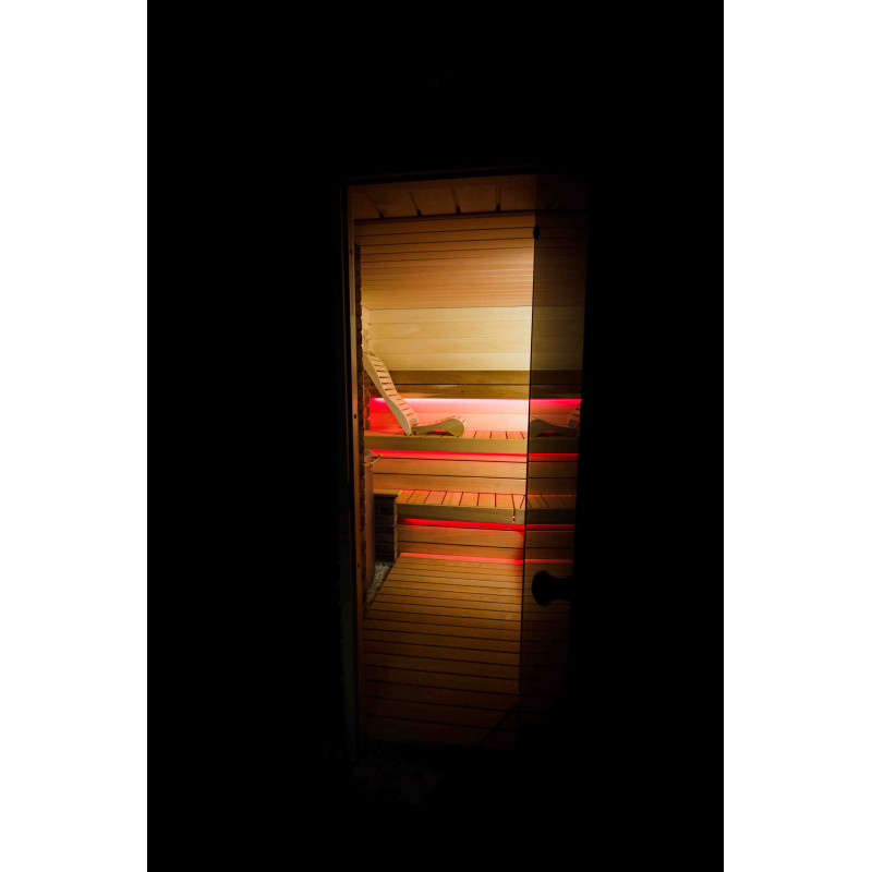 Ausgestattet mit farbiger RGB-Beleuchtung, gesteuert durch einen kabellosen Farbwechsler, mit dem Sie die Farbe der Beleuchtung ganz einfach je nach gewünschter Saunaatmosphäre ändern können.