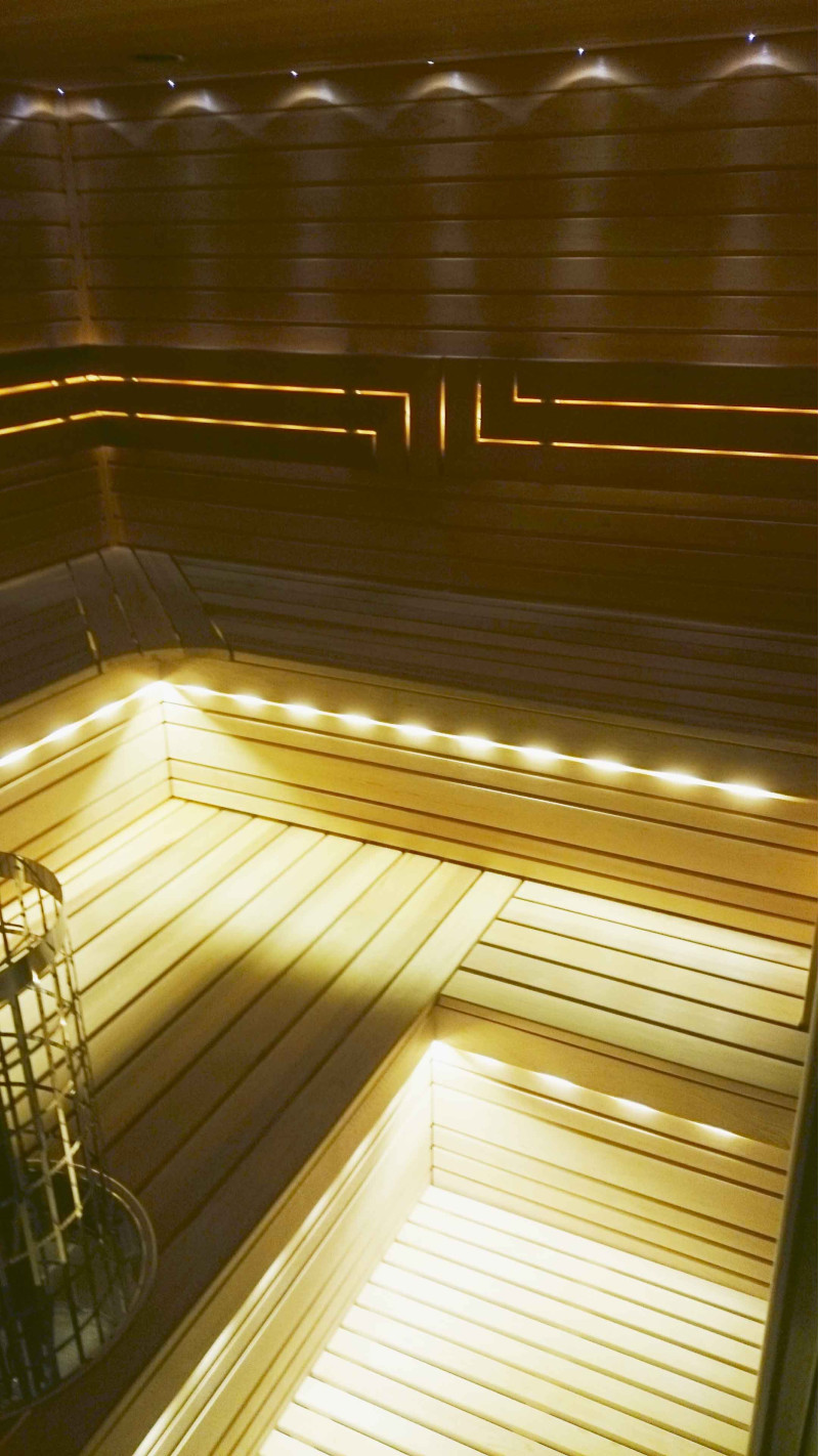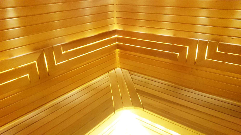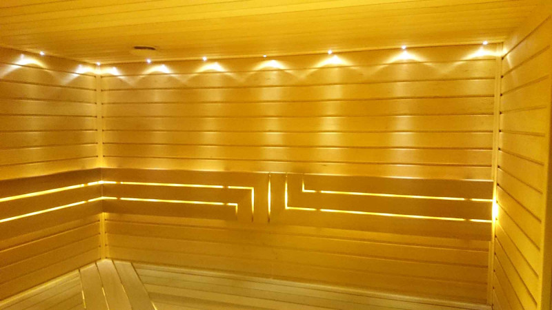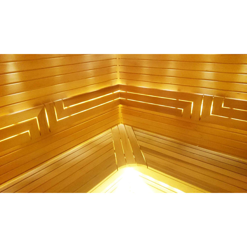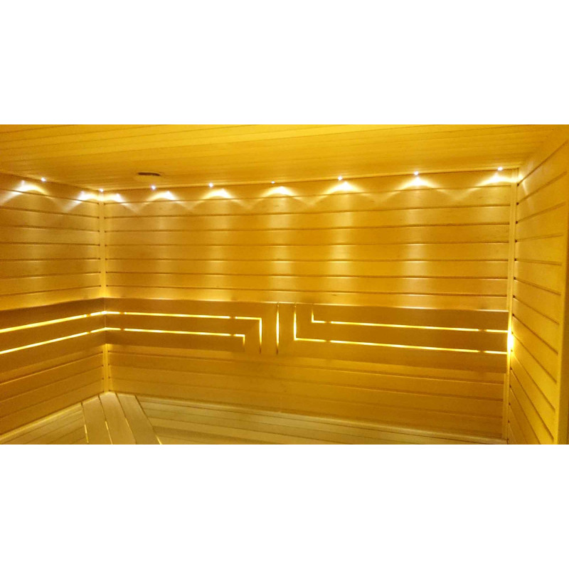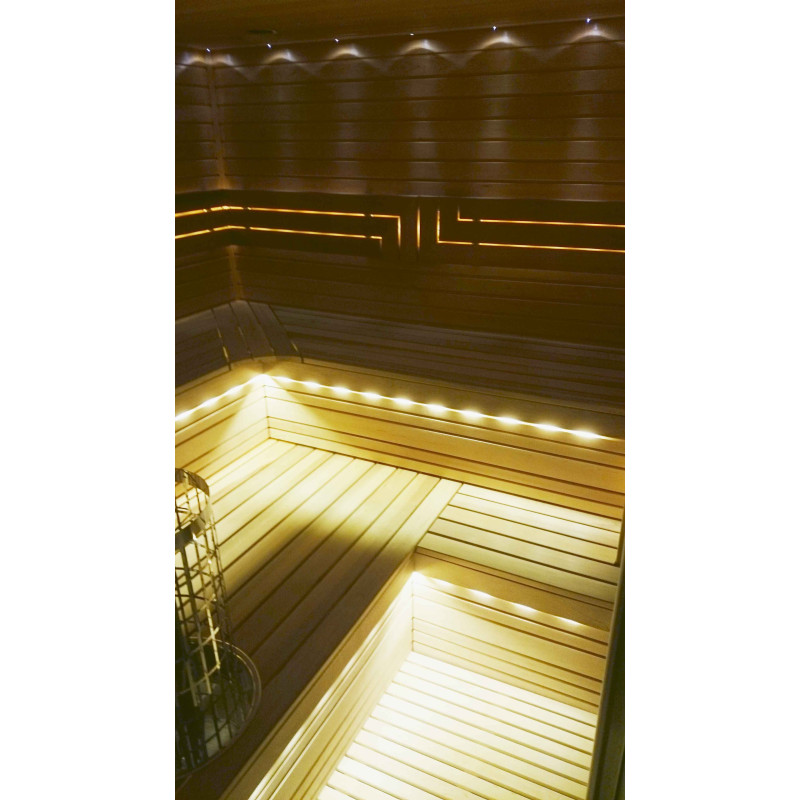 Die Decke ist mit exklusiver LED-Beleuchtung "Sun" ausgestattet, LED-Lichtleisten sind unter den Bänken und Rückenlehnen installiert, Farbe warmweiß. Dank der Beleuchtung wird ein Teil der entspannenden Wirkung der Sauna bereitgestellt.