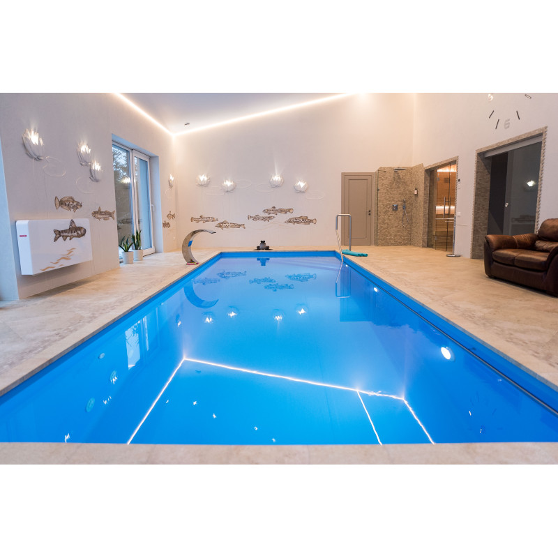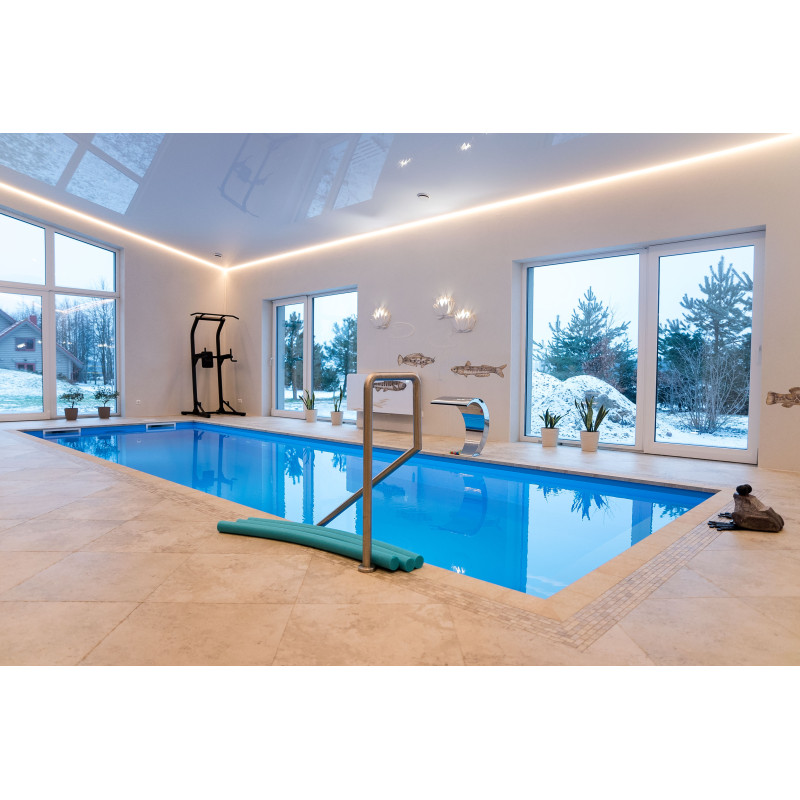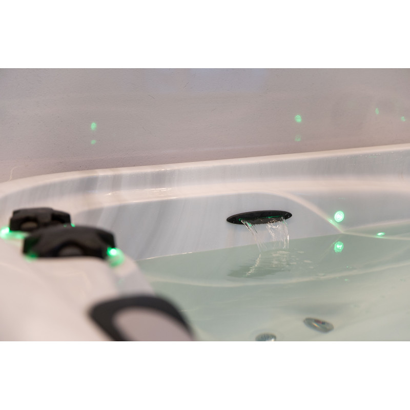 Ausgestattet mit Schwimmströmung, Wasserkaskade, Massagebank, Handlauf, Treppe und Unterwasserbeleuchtung.